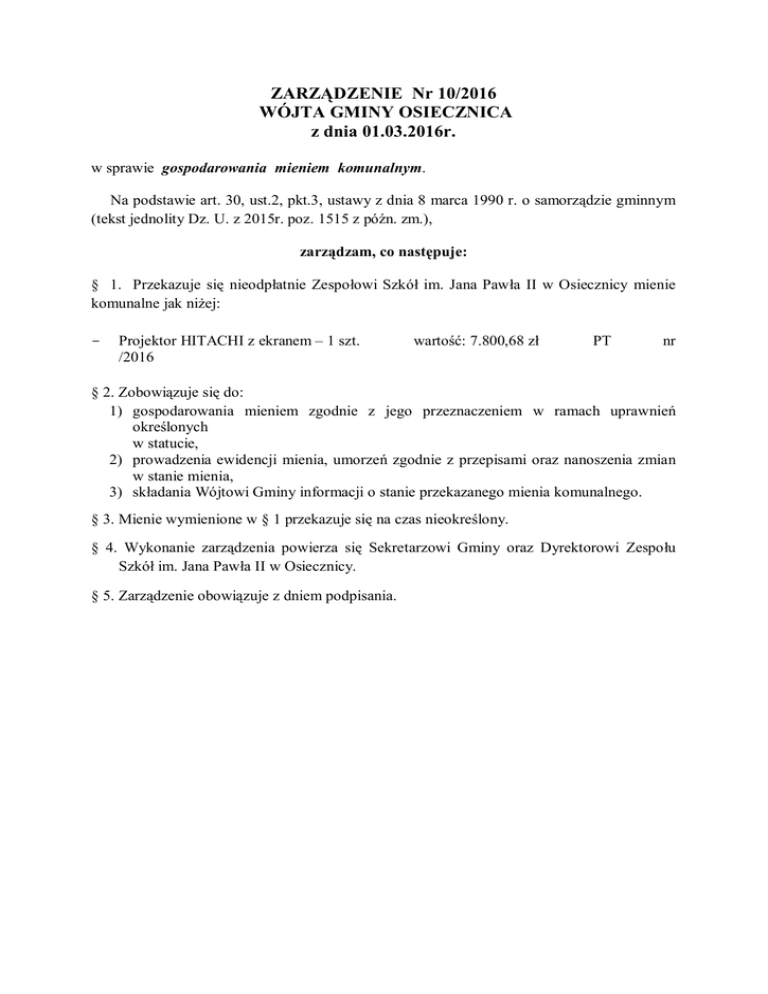 ZARZ DZENIE Nr 10/2016 WÓJTA GMINY OSIECZNICA z dnia 01.03.2016r. w sprawie gospodarowania mieniem komunalnym. Na podstawie art. 30, ust.2, pkt.3, ustawy z dnia 8 marca 1990 r. o samorz dzie gminnym (tekst jednolity Dz. U. z 2015r. poz. 1515 z pó n. zm.), zarz dzam, co nast puje: § 1. Przekazuje si nieodp atnie Zespo owi Szkó im. Jana Paw a II w Osiecznicy mienie komunalne jak ni ej: - Projektor HITACHI z ekranem – 1 szt. /2016 warto : 7.800,68 z PT nr § 2. Zobowi zuje si do: 1) gospodarowania mieniem zgodnie z jego przeznaczeniem w ramach uprawnie okre lonych w statucie, 2) prowadzenia ewidencji mienia, umorze zgodnie z przepisami oraz nanoszenia zmian w stanie mienia, 3) sk adania Wójtowi Gminy informacji o stanie przekazanego mienia komunalnego. § 3. Mienie wymienione w § 1 przekazuje si na czas nieokre lony. § 4. Wykonanie zarz dzenia powierza si Sekretarzowi Gminy oraz Dyrektorowi Zespo u Szkó im. Jana Paw a II w Osiecznicy. § 5. Zarz dzenie obowi zuje z dniem podpisania.