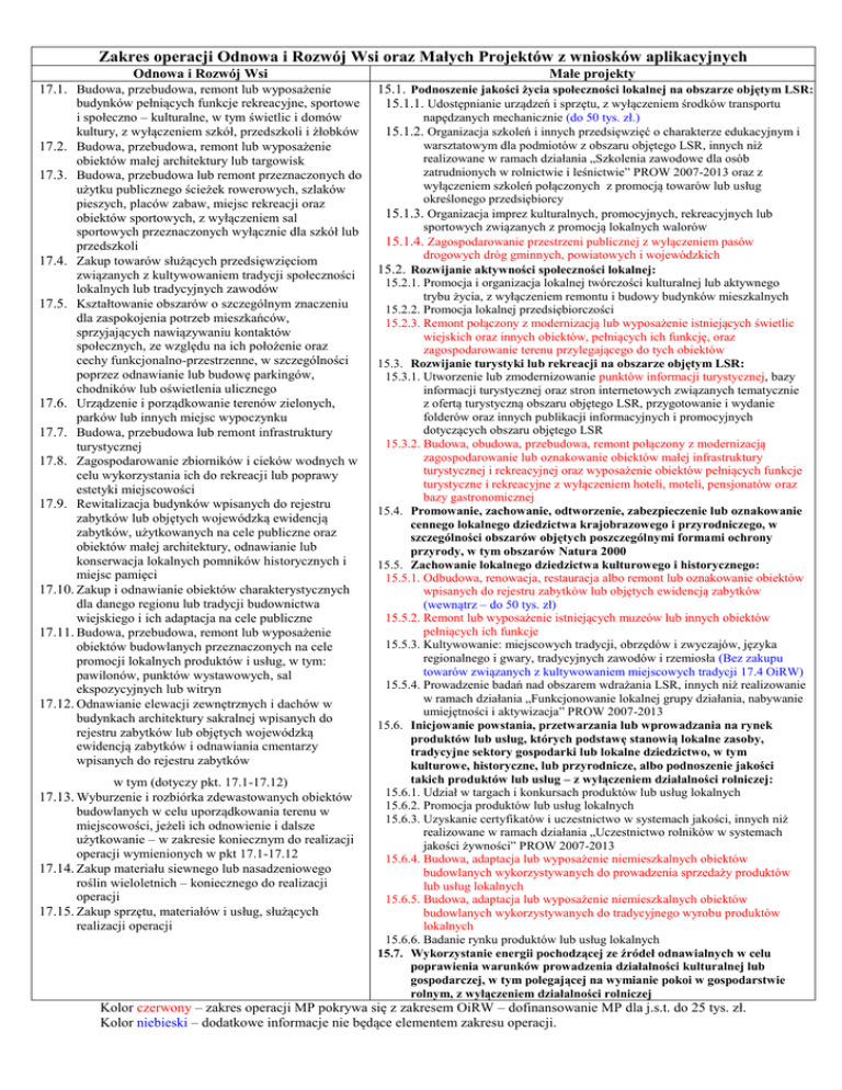 Zakres operacji Odnowa i Rozwój Wsi oraz Małych Projektów z wniosków aplikacyjnych Odnowa i Rozwój Wsi 17.1. Budowa, przebudowa, remont lub wyposażenie budynków pełniących funkcje rekreacyjne, sportowe i społeczno – kulturalne, w tym świetlic i domów kultury, z wyłączeniem szkół, przedszkoli i żłobków 17.2. Budowa, przebudowa, remont lub wyposażenie obiektów małej architektury lub targowisk 17.3. Budowa, przebudowa lub remont przeznaczonych do użytku publicznego ścieżek rowerowych, szlaków pieszych, placów zabaw, miejsc rekreacji oraz obiektów sportowych, z wyłączeniem sal sportowych przeznaczonych wyłącznie dla szkół lub przedszkoli 17.4. Zakup towarów służących przedsięwzięciom związanych z kultywowaniem tradycji społeczności lokalnych lub tradycyjnych zawodów 17.5. Kształtowanie obszarów o szczególnym znaczeniu dla zaspokojenia potrzeb mieszkańców, sprzyjających nawiązywaniu kontaktów społecznych, ze względu na ich położenie oraz cechy funkcjonalno-przestrzenne, w szczególności poprzez odnawianie lub budowę parkingów, chodników lub oświetlenia ulicznego 17.6. Urządzenie i porządkowanie terenów zielonych, parków lub innych miejsc wypoczynku 17.7. Budowa, przebudowa lub remont infrastruktury turystycznej 17.8. Zagospodarowanie zbiorników i cieków wodnych w celu wykorzystania ich do rekreacji lub poprawy estetyki miejscowości 17.9. Rewitalizacja budynków wpisanych do rejestru zabytków lub objętych wojewódzką ewidencją zabytków, użytkowanych na cele publiczne oraz obiektów małej architektury, odnawianie lub konserwacja lokalnych pomników historycznych i miejsc pamięci 17.10. Zakup i odnawianie obiektów charakterystycznych dla danego regionu lub tradycji budownictwa wiejskiego i ich adaptacja na cele publiczne 17.11. Budowa, przebudowa, remont lub wyposażenie obiektów budowlanych przeznaczonych na cele promocji lokalnych produktów i usług, w tym: pawilonów, punktów wystawowych, sal ekspozycyjnych lub witryn 17.12. Odnawianie elewacji zewnętrznych i dachów w budynkach architektury sakralnej wpisanych do rejestru zabytków lub objętych wojewódzką ewidencją zabytków i odnawiania cmentarzy wpisanych do rejestru zabytków w tym (dotyczy pkt. 17.1-17.12) 17.13. Wyburzenie i rozbiórka zdewastowanych obiektów budowlanych w celu uporządkowania terenu w miejscowości, jeżeli ich odnowienie i dalsze użytkowanie – w zakresie koniecznym do realizacji operacji wymienionych w pkt 17.1-17.12 17.14. Zakup materiału siewnego lub nasadzeniowego roślin wieloletnich – koniecznego do realizacji operacji 17.15. Zakup sprzętu, materiałów i usług, służących realizacji operacji Małe projekty 15.1. Podnoszenie jakości życia społeczności lokalnej na obszarze objętym LSR: 15.1.1. Udostępnianie urządzeń i sprzętu, z wyłączeniem środków transportu napędzanych mechanicznie (do 50 tys. zł.) 15.1.2. Organizacja szkoleń i innych przedsięwzięć o charakterze edukacyjnym i warsztatowym dla podmiotów z obszaru objętego LSR, innych niż realizowane w ramach działania „Szkolenia zawodowe dla osób zatrudnionych w rolnictwie i leśnictwie” PROW 2007-2013 oraz z wyłączeniem szkoleń połączonych z promocją towarów lub usług określonego przedsiębiorcy 15.1.3. Organizacja imprez kulturalnych, promocyjnych, rekreacyjnych lub sportowych związanych z promocją lokalnych walorów 15.1.4. Zagospodarowanie przestrzeni publicznej z wyłączeniem pasów drogowych dróg gminnych, powiatowych i wojewódzkich 15.2. Rozwijanie aktywności społeczności lokalnej: 15.2.1. Promocja i organizacja lokalnej twórczości kulturalnej lub aktywnego trybu życia, z wyłączeniem remontu i budowy budynków mieszkalnych 15.2.2. Promocja lokalnej przedsiębiorczości 15.2.3. Remont połączony z modernizacją lub wyposażenie istniejących świetlic wiejskich oraz innych obiektów, pełniących ich funkcję, oraz zagospodarowanie terenu przylegającego do tych obiektów 15.3. Rozwijanie turystyki lub rekreacji na obszarze objętym LSR: 15.3.1. Utworzenie lub zmodernizowanie punktów informacji turystycznej, bazy informacji turystycznej oraz stron internetowych związanych tematycznie z ofertą turystyczną obszaru objętego LSR, przygotowanie i wydanie folderów oraz innych publikacji informacyjnych i promocyjnych dotyczących obszaru objętego LSR 15.3.2. Budowa, obudowa, przebudowa, remont połączony z modernizacją zagospodarowanie lub oznakowanie obiektów małej infrastruktury turystycznej i rekreacyjnej oraz wyposażenie obiektów pełniących funkcje turystyczne i rekreacyjne z wyłączeniem hoteli, moteli, pensjonatów oraz bazy gastronomicznej 15.4. Promowanie, zachowanie, odtworzenie, zabezpieczenie lub oznakowanie cennego lokalnego dziedzictwa krajobrazowego i przyrodniczego, w szczególności obszarów objętych poszczególnymi formami ochrony przyrody, w tym obszarów Natura 2000 15.5. Zachowanie lokalnego dziedzictwa kulturowego i historycznego: 15.5.1. Odbudowa, renowacja, restauracja albo remont lub oznakowanie obiektów wpisanych do rejestru zabytków lub objętych ewidencją zabytków (wewnątrz – do 50 tys. zł) 15.5.2. Remont lub wyposażenie istniejących muzeów lub innych obiektów pełniących ich funkcje 15.5.3. Kultywowanie: miejscowych tradycji, obrzędów i zwyczajów, języka regionalnego i gwary, tradycyjnych zawodów i rzemiosła (Bez zakupu towarów związanych z kultywowaniem miejscowych tradycji 17.4 OiRW) 15.5.4. Prowadzenie badań nad obszarem wdrażania LSR, innych niż realizowanie w ramach działania „Funkcjonowanie lokalnej grupy działania, nabywanie umiejętności i aktywizacja” PROW 2007-2013 15.6. Inicjowanie powstania, przetwarzania lub wprowadzania na rynek produktów lub usług, których podstawę stanowią lokalne zasoby, tradycyjne sektory gospodarki lub lokalne dziedzictwo, w tym kulturowe, historyczne, lub przyrodnicze, albo podnoszenie jakości takich