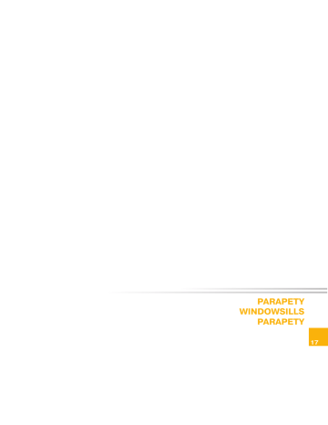 PARAPETY WINDOWSILLS PARAPETY 17 PARAPET WINDOWSILL PARAPET Aluminiowy, grubość arkusza 1 mm. Z folią ochronną polietylenową. Aluminium, sheet thickness: 1,0 mm. Covered with protective polyethylene film Hliník, tloušťka plechu 1,0 mm, s ochrannou polyetylénovou fólií Artykuł • Marking • Označení А, mm Waga 1 m bież., kg • Weight per 1 m, kg • Hmotnost na 1 b.m., kg Kolor • Colour • Barva Kod • Code • Kód 1160101 1160102 WE90 90 0,403 biały •white •bílá brązowy • brown • hnědá WE110 110 0,467 biały •white •bílá brązowy • brown • hnědá 1160111 1160112 WE130 130 0,520 biały •white •bílá brązowy • brown • hnědá 1160201 1160202 WE150 150 0,578 biały •white •bílá brązowy • brown • hnědá 1160301 1160302 WE165 165 0,615 biały •white •bílá brązowy • brown • hnědá 1160401 1160402 WE180 180 0,660 biały •white •bílá brązowy • brown • hnědá 1160501 1160502 WE205 205 0,727 biały •white •bílá brązowy • brown • hnědá 1160511 1160512 WE225 225 0,782 biały •white •bílá brązowy • brown • hnědá 1160511 1160512 WE250 250 0,838 biały •white •bílá brązowy • brown • hnědá 1160611 1160612 WE280 280 0,940 biały •white •bílá brązowy • brown • hnědá 1160701 1160702 WE320 320 1,048 biały •white •bílá brązowy • brown • hnědá 1160801 1160802 WE360 360 1,154 biały •white •bílá brązowy • brown • hnědá 1160901 1160902 Długość dostawy, m ................................. Standard length, m....................................... Standardní délka, m ........................................ 6,0 Norma zamówienia, m............................... Standard pack, m ........................................ Standardní balení, m...................................... 48,0 17 ELEMENTY STEROWANIA PARAPETY PARAPETY 17.1 PARAPET WINDOWSILL BE110 BE110/D BE135 BE135/D PARAPET Aluminiowy, grubość arkusza 1 mm. Z folią ochronną polietylenową. Przeznaczony do montowania na ramę oszklenia balkonu Aluminium, sheet thickness: 1mm. Covered with protective polyethylene film. Used to pan a balcony frame Hliník, tloušťka plechu 1,0 mm, s ochrannou polyetylénovou fólií. Určen k montáži na rám balkonu. Artykuł • Marking • Označení А, mm Waga 1 m bież., kg • Weight per 1 m, kg • Hmotnost na 1 b.m., kg Kolor • Colour • Barva Kod • Code • Kód 1161501 1161502 BE110 110 0,770 biały •white •bílá brązowy • brown • hnědá BE110/D 110 0,786 biały •white •bílá 1161601 1161701 1161702 1161801 BE135 135 0,770 biały •white •bílá brązowy • brown • hnědá BE135/D 135 0,858 biały •white •bílá Norma zamówienia, m............................... Standard pack, m ........................................ Standardní balení, m...................................... 48,0 NAKŁADKA ODLEWANA P150R P150L WINDOWSILL SIDE PLUG ABS, dla okapników WE90-WE150 ABS, for WE90-WE150 windowsills ABS, pro parapety WE90-WE150 Artykuł • Marking • Označení 17 KONCOVKA PARAPETU Opis • Description • Popis Kolor • Colour • Barva Kod • Code • Kód P150R prawa • right–side • pravá biały •white •bílá brązowy • brown • hnědá 1161121 1161122 P150L lewa • left–side • levá biały •white •bílá brązowy • brown • hnědá 1161131 1161132 Norma zamówienia, m............................... Standard pack, m ........................................ Standardní balení, m...................................... 80,0 17.2 ELEMENTY STEROWANIA PARAPETY PARAPETY NAKŁADKA ODLEWANA P225R P225L WINDOWSILL SIDE PLUG KONCOVKA PARAPETU ABS, dla okapników WE165-WE225 ABS, for WE165-WE225 windowsills ABS, pro parapety WE165-WE225 Artykuł • Marking • Označení Opis • Description • Popis Kolor • Colour • Barva Kod • Code • Kód P225R prawa • right–side • pravá biały •white •bílá brązowy • brown • hnědá 1161221 1161222 P225L lewa • left–side • levá biały •white •bílá brązowy • brown • hnědá 1161231 1161232 Norma zamówienia, m............................... Standard pack, m ........................................ Standardní balení, m...................................... 60,0 NAKŁADKA ODLEWANA P360R P360L WINDOWSILL SIDE PLUG KONCOVKA PARAPETU ABS, dla okapników WE90-WE150 ABS, for WE90-WE150 windowsills ABS, pro parapety WE90-WE150 Artykuł • Marking • Označení Opis• Description • Popis Kolor • Colour • Barva Kod • Code • Kód P360R prawa • right–side • pravá biały •white •bílá brązowy • brown • hnědá 1161321 1161322 P360L lewa • left–side • levá biały •white •bílá brązowy • brown • hnědá 1161331 1161332 17 Norma zamówienia, m............................... Standard pack, m ........................................ Standardní balení, m...................................... 60,0 ELEMENTY STEROWANIA PARAPETY PARAPETY 17.3 WINDOWSILL SUPPORT BRACKET PŁYTKA OPOROWA BS NOSNÍK PARAPETU Aluminiowy (nielakierowany). Wykorzystuje się z okapnikami okiennymi. Aluminium support bracket. Used with windowsills Hliníkový nosník. Používá se pro parapety Artykuł • Marking • Označení Kolor • Colour • Barva Kod • Code • Kód BS nielakierowany • millfinished • nelakovaná 1161400 Norma zamówienia, szt.............................. Standard pack, pcs...................................... Standardní balení, ks..................................... 60,0 17 17.4 ELEMENTY STEROWANIA PARAPETY PARAPETY