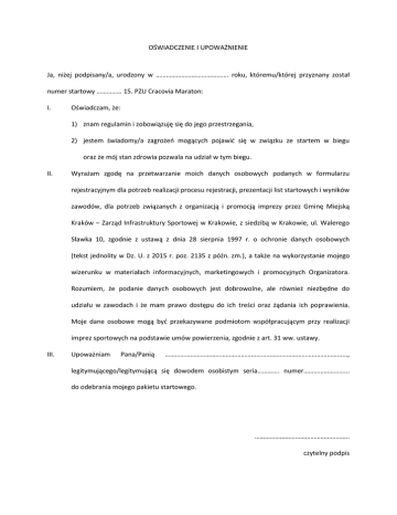 OŚWIADCZENIE I UPOWAŻNIENIE Ja, niżej podpisany/a, urodzony w ……………………………………. roku, któremu/której przyznany został numer startowy …………… 15. PZU Cracovia Maraton: I. Oświadczam, że: 1) znam regulamin i zobowiązuję się do jego przestrzegania, 2) jestem świadomy/a zagrożeń mogących pojawić się w związku ze startem w biegu oraz że mój stan zdrowia pozwala na udział w tym biegu. II. Wyrażam zgodę na przetwarzanie moich danych osobowych podanych w formularzu rejestracyjnym dla potrzeb realizacji procesu rejestracji, prezentacji list startowych i wyników zawodów, dla potrzeb związanych z organizacją i promocją imprezy przez Gminę Miejską Kraków – Zarząd Infrastruktury Sportowej w Krakowie, z siedzibą w Krakowie, ul. Walerego Sławka 10, zgodnie z ustawą z dnia 28 sierpnia 1997 r. o ochronie danych osobowych (tekst jednolity w Dz. U. z 2015 r. poz. 2135 z późn. zm.), a także na wykorzystanie mojego wizerunku w materiałach informacyjnych, marketingowych i promocyjnych Organizatora. Rozumiem, że podanie danych osobowych jest dobrowolne, ale również niezbędne do udziału w zawodach i że mam prawo dostępu do ich treści oraz żądania ich poprawienia. Moje dane osobowe mogą być przekazywane podmiotom współpracującym przy realizacji imprez sportowych na podstawie umów powierzenia, zgodnie z art. 31 ww. ustawy. III. Upoważniam Pana/Panią ……………………………………………………………………………………………..., legitymującego/legitymującą się dowodem osobistym seria…………. numer……………………... do odebrania mojego pakietu startowego. ……………………………………………….. czytelny podpis