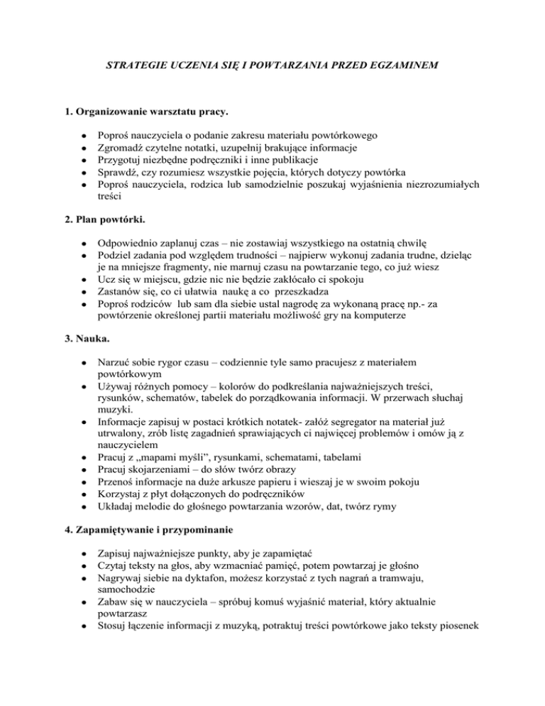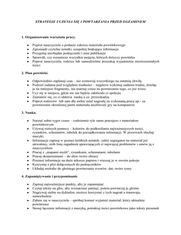 STRATEGIE UCZENIA SIĘ I POWTARZANIA PRZED EGZAMINEM 1. Organizowanie warsztatu pracy. Poproś nauczyciela o podanie zakresu materiału powtórkowego Zgromadź czytelne notatki, uzupełnij brakujące informacje Przygotuj niezbędne podręczniki i inne publikacje Sprawdź, czy rozumiesz wszystkie pojęcia, których dotyczy powtórka Poproś nauczyciela, rodzica lub samodzielnie poszukaj wyjaśnienia niezrozumiałych treści 2. Plan powtórki. Odpowiednio zaplanuj czas – nie zostawiaj wszystkiego na ostatnią chwilę Podziel zadania pod względem trudności – najpierw wykonuj zadania trudne, dzieląc je na mniejsze fragmenty, nie marnuj czasu na powtarzanie tego, co już wiesz Ucz się w miejscu, gdzie nic nie będzie zakłócało ci spokoju Zastanów się, co ci ułatwia naukę a co przeszkadza Poproś rodziców lub sam dla siebie ustal nagrodę za wykonaną pracę np.- za powtórzenie określonej partii materiału możliwość gry na komputerze 3. Nauka. Narzuć sobie rygor czasu – codziennie tyle samo pracujesz z materiałem powtórkowym Używaj różnych pomocy – kolorów do podkreślania najważniejszych treści, rysunków, schematów, tabelek do porządkowania informacji. W przerwach słuchaj muzyki. Informacje zapisuj w postaci krótkich notatek- załóż segregator na materiał już utrwalony, zrób listę zagadnień sprawiających ci najwięcej problemów i omów ją z nauczycielem Pracuj z „mapami myśli”, rysunkami, schematami, tabelami Pracuj skojarzeniami – do słów twórz obrazy Przenoś informacje na duże arkusze papieru i wieszaj je w swoim pokoju Korzystaj z płyt dołączonych do podręczników Układaj melodie do głośnego powtarzania wzorów, dat, twórz rymy 4. Zapamiętywanie i przypominanie Zapisuj najważniejsze punkty, aby je zapamiętać Czytaj teksty na głos, aby wzmacniać pamięć, potem powtarzaj je głośno Nagrywaj siebie na dyktafon, możesz korzystać z tych nagrań a tramwaju, samochodzie Zabaw się w nauczyciela – spróbuj komuś wyjaśnić materiał, który aktualnie powtarzasz Stosuj łączenie informacji z muzyką, potraktuj treści powtórkowe jako teksty piosenek 5. Pomoc w uczeniu. Kontroluj przebieg pracy, zaznaczaj treści już opanowane Ćwicz rozwiązywanie zadań testowych Nie bój się zwracać o pomoc do nauczyciela, rodzica Po ciężkiej pracy spraw sobie radość, zajmij się czymś, co szczególnie lubisz, spotkaj się z kolegami, posłuchaj muzyki itp. 6. Podczas testu i egzaminu: A. Przed egzaminem Połóż się wcześniej spać, nie ucz się całą noc Zjedz śniadanie Sprawdź, czy masz wszystkie potrzebne przybory szkolne Nie spiesz się, wyjdź z domu odpowiednio wcześniej Nastaw się pozytywnie, przecież dobrze wszystko powtórzyłeś, więc nie masz się czego obawiać B. Podczas egzaminu Słuchaj uważnie, gdy nauczyciel podaje instrukcję, postępuj zgodnie z nią Dokładnie czytaj pytania – zaznaczaj w nich najważniejsze wyrazy Zrób plan odpowiedzi Odpowiadaj dokładnie na pytanie, nie pisz wszystkiego co wiesz Przeczytaj swoja pracę, sprawdź, czy rozwiązałeś wszystkie zadania, czy nie ma w nich błędów C. Po egzaminie Nie rozmawiaj zbyt długo o zadaniach , których nie jesteś pewien Wyjdź i odpręż się, pracowałeś ciężko – należy ci się odpoczynek Po otrzymaniu wyników dokonaj analizy popełnionych błędów. Uwzględnij je w swojej dalszej pracy Kilka rad ogólnych: 1. Wyznaczaj sobie jasne cele nauki i chciej je zrealizować – od celów wielkich (na całe życie), poprzez średnie aż do tych najmniejszych (ilu słówek chcesz nauczyć się każdego dnia ?). Podejmowanie prawidłowych decyzji możliwe jest tylko pod warunkiem pełnej świadomości własnych życiowych zadań, misji, określającej wyzwania, które sobie stawiasz 2. W pełni koncentruj się na bieżącym zadaniu – ucz się po to, aby osiągnąć wyznaczone sobie cele 3. Uważnie obserwuj rzeczywistość – jest ona nieocenionym źródłem informacji 4. Optymalny proces uczenia się polega na doskonaleniu starych i rozwijaniu nowych umiejętności 5. Wykorzystuj każdą okazję do nauczenia się czegoś – znajduj związki nowej wiedzy z już posiadaną oraz z własnymi celami. Wszystko, czego się w życiu nauczysz prędzej czy później może się przydać Tylko maksymalne wykorzystanie wszystkich swoich zdolności pozwala na to, aby stać się kimś więcej, niż się jest. POWODZENIA!!! Edyta Kirsz pedagog PPP „Osiek”