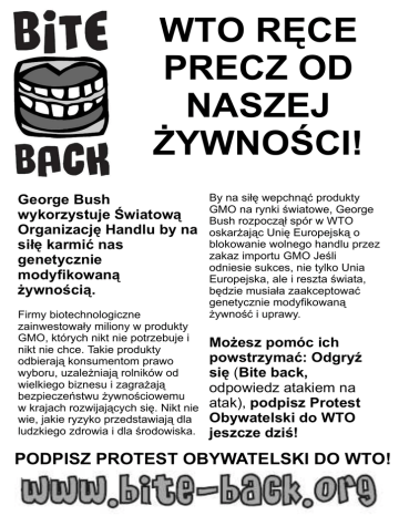 WTO RÊCE PRECZ OD NASZEJ ¯YWNOŒCI! George Bush wykorzystuje Œwiatow¹ Organizacjê Handlu by na si³ê karmiæ nas genetycznie modyfikowan¹ ¿ywnoœci¹. Firmy biotechnologiczne zainwestowa³y miliony w produkty GMO, których nikt nie potrzebuje i nikt nie chce. Takie produkty odbieraj¹ konsumentom prawo wyboru, uzale¿niaj¹ rolników od wielkiego biznesu i zagra¿aj¹ bezpieczeñstwu ¿ywnoœciowemu w krajach rozwijaj¹cych siê. Nikt nie wie, jakie ryzyko przedstawiaj¹ dla ludzkiego zdrowia i dla œrodowiska. By na si³ê wepchn¹æ produkty GMO na rynki œwiatowe, George Bush rozpocz¹³ spór w WTO oskar¿aj¹c Uniê Europejsk¹ o blokowanie wolnego handlu przez zakaz importu GMO Jeœli odniesie sukces, nie tylko Unia Europejska, ale i reszta œwiata, bêdzie musia³a zaakceptowaæ genetycznie modyfikowan¹ ¿ywnoœæ i uprawy. Mo¿esz pomóc ich powstrzymaæ: OdgryŸ siê (Bite back, odpowiedz atakiem na atak), podpisz Protest Obywatelski do WTO jeszcze dziœ! PODPISZ PROTEST OBYWATELSKI DO WTO! Od: Zaniepokojonych obywateli œwiata Do: Œwiatowej Organizacji Handlu (WTO) Dotyczy: Sporu miêdzy Stanami Zjednoczonymi, Kanad¹ i Argentyn¹ a Uni¹ Europejsk¹ na temat genetycznie modyfikowanej ¿ywnoœci i rolnictwa. OBYWATELE ŒWIATA PROTESTUJ¥: RÊCE Z DALA OD NASZEJ ¯YWNOŒCI ! Pragniemy chroniæ nasze prawo do decydowania, co jemy i hodujemy. Mamy powa¿ne i uzasadnione prawnie w¹tpliwoœci dotycz¹ce ryzyka zwi¹zanego z genetycznie modyfikowan¹ ¿ywnoœci¹ i uprawami (GMO) dla konsumentów, rolników, dzikiej przyrody i œrodowiska naturalnego na ca³ym œwiecie. W³¹czaj¹c w spór Œwiatow¹ Organizacjê Handlu (WTO) Stany Zjednoczone i inne kraje próbuj¹ zmusiæ Uniê Europejsk¹ i inne czêœci œwiata do kupowania genetycznie modyfikowanej ¿ywnoœci. Chc¹ powstrzymaæ kraje od dokonania samodzielnego wyboru, co do dopuszczenia genetycznie modyfikowanej ¿ywnoœci i upraw (na ich wewnêtrzny rynek). Staraj¹ siê podwa¿yæ nasze prawo do informacji i dokonywania œwiadomego wyboru tego, co jemy i uprawiamy. Ich sukces u³atwi prowadzenie interesów niewielkiej grupie du¿ych firm (koncernów), które zainwestowa³y w t¹ technologiê, kosztem obywateli ca³ego œwiata. ò Proszê podpisz i zwróæ przedstawicielowi Przyjació³ Ziemi (Friends of the Earth) lub podpisz protest elektronicznie na stronie www.bite-back.org Mo¿esz równie¿ przes³aæ podpisany protest na adres: Friends of the Earth Europe, 15 rue Blanche, 1050 Brussels, Belgium TYM PROTESTEM STANOWCZO PODKREŒLAMY, ¯E: 1. 2. do nas, a nie do WTO nale¿y decyzja, co jemy i jakie roœliny uprawiamy, rz¹dy ka¿dego z krajów œwiata maj¹ prawo do tworzenia praw chroni¹cych ich œrodowisko i obywateli przed ryzykiem zwi¹zanym z genetycznie modyfikowan¹ ¿ywnoœci¹ i uprawami, w³¹cznie z prawem do wprowadzenia zakazu importu takich produktów i obowi¹zku dok³adnego ich oznaczania, 3. s³uszne jest, by takie prawa by³y tworzone w oparciu o Zasadê Ostro¿noœci, która, w przypadku powa¿nego zagro¿enia lub mo¿liwoœci wyst¹pienia nieodwracalnych zmian, wymaga podjêcia dzia³añ z wyprzedzeniem w celu zachowania ca³kowitego bezpieczeñstwa zamiast czekania na skutki i ¿a³owania beztroski, gdy siê one pojawi¹, 4. Decyzje dotycz¹ce regulacji œwiatowego handlu genetycznie modyfikowan¹ ¿ywnoœci¹ powinny byæ podjête w zgodzie z Protoko³em Bezpieczeñstwa Biologicznego UN (ONZ), a nie przez Œwiatow¹ Organizacjê Handlu. Twoje dane nie zostan¹ wykorzystane do ¿adnego innego celu ni¿ kampania OdgryŸ siê (Bite Back) Nie otrzymasz ¿adnej zwi¹zanej z kampani¹ poczty lub e-maili, o ile sobie tego nie za¿yczysz (prosimy o zaznaczenie tak/nie) DLATEGO ŒWIATOWA ORGANIZACJA HANDLU (WTO): 1. 2. 3. nie mo¿e odbieraæ nam prawa do informacji i samodzielnego dokonywania wyboru tego, co jemy i uprawiamy, nie mo¿e podwa¿aæ prawa Unii Europejskiej i innych (nie nale¿¹cych do niej) krajów do podjêcia w³aœciwych kroków w celu ochrony obywateli i œrodowiska przed zagro¿eniem GMO, musi odrzuciæ skargi Stanów Zjednoczonych Ameryki, Argentyny i Kanady. PODPISANE PRZEZ: ___________________________________ Podpis _______________________________ Data & Miejsce _______________________________ ___________________________________ e-mail Imiê i Nazwisko Jeœli reprezentujesz organizacjê: ___________________________________ Adres ________________________________ ___________________________________ ______________________________ Nazwa organizacji Liczba osób, które reprezentuje organizacja “Bite Back: WTO hands off our food!” to kampania zorganizowana przez Friends of the Earth International (FoEI), przy wsparciu ActionAid Alliance; Confédération Paysanne, Francja; International Gender and Trade Network; Public Citizen, USA; Public Services International; Research Foundation for Science, Technology and Ecology, Indie.