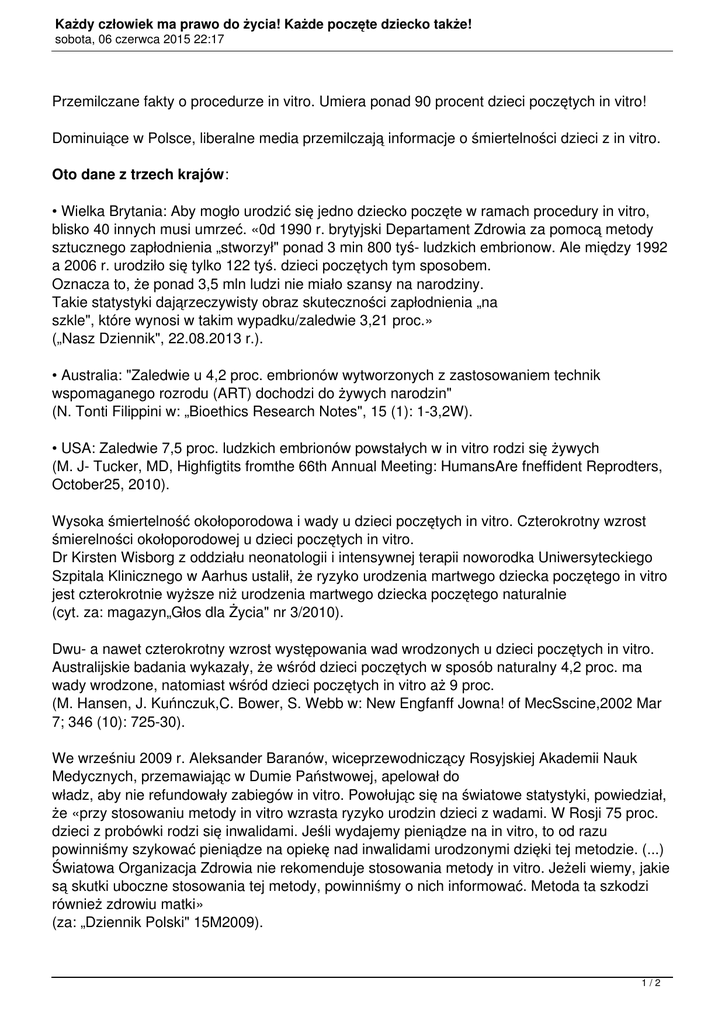 Każdy człowiek ma prawo do życia! Każde poczęte dziecko także! sobota, 06 czerwca 2015 22:17 Przemilczane fakty o procedurze in vitro. Umiera ponad 90 procent dzieci poczętych in vitro! Dominuiące w Polsce, liberalne media przemilczają informacje o śmiertelności dzieci z in vitro. Oto dane z trzech krajów: • Wielka Brytania: Aby mogło urodzić się jedno dziecko poczęte w ramach procedury in vitro, blisko 40 innych musi umrzeć. «0d 1990 r. brytyjski Departament Zdrowia za pomocą metody sztucznego zapłodnienia „stworzył" ponad 3 min 800 tyś- ludzkich embrionow. Ale między 1992 a 2006 r. urodziło się tylko 122 tyś. dzieci poczętych tym sposobem. Oznacza to, że ponad 3,5 mln ludzi nie miało szansy na narodziny. Takie statystyki dająrzeczywisty obraz skuteczności zapłodnienia „na szkle", które wynosi w takim wypadku/zaledwie 3,21 proc.» („Nasz Dziennik", 22.08.2013 r.). • Australia: "Zaledwie u 4,2 proc. embrionów wytworzonych z zastosowaniem technik wspomaganego rozrodu (ART) dochodzi do żywych narodzin" (N. Tonti Filippini w: „Bioethics Research Notes", 15 (1): 1-3,2W). • USA: Zaledwie 7,5 proc. ludzkich embrionów powstałych w in vitro rodzi się żywych (M. J- Tucker, MD, Highfigtits fromthe 66th Annual Meeting: HumansAre fneffident Reprodters, October25, 2010). Wysoka śmiertelność okołoporodowa i wady u dzieci poczętych in vitro. Czterokrotny wzrost śmierelności okołoporodowej u dzieci poczętych in vitro. Dr Kirsten Wisborg z oddziału neonatologii i intensywnej terapii noworodka Uniwersyteckiego Szpitala Klinicznego w Aarhus ustalił, że ryzyko urodzenia martwego dziecka poczętego in vitro jest czterokrotnie wyższe niż urodzenia martwego dziecka poczętego naturalnie (cyt. za: magazyn„Głos dla Życia" nr 3/2010). Dwu- a nawet czterokrotny wzrost występowania wad wrodzonych u dzieci poczętych in vitro. Australijskie badania wykazały, że wśród dzieci poczętych w sposób naturalny 4,2 proc. ma wady wrodzone, natomiast wśród dzieci poczętych in vitro aż 9 proc. (M. Hansen, J. Kuńnczuk,C. Bower, S. Webb w: New Engfanff Jowna! of MecSscine,2002 Mar 7; 346 (10): 725-30). We wrześniu 2009 r. Aleksander Baranów, wiceprzewodniczący Rosyjskiej Akademii Nauk Medycznych, przemawiając w Dumie Państwowej, apelował do władz, aby nie refundowały zabiegów in vitro. Powołując się na światowe statystyki, powiedział, że «przy stosowaniu metody in vitro wzrasta ryzyko urodzin dzieci z wadami. W Rosji 75 proc. dzieci z probówki rodzi się inwalidami. Jeśli wydajemy pieniądze na in vitro, to od razu powinniśmy szykować pieniądze na opiekę nad inwalidami urodzonymi dzięki tej metodzie. (...) Światowa Organizacja Zdrowia nie rekomenduje stosowania metody in vitro. Jeżeli wiemy, jakie są skutki uboczne stosowania tej metody, powinniśmy o nich informować. Metoda ta szkodzi również zdrowiu matki» (za: „Dziennik Polski" 15M2009). 1/2 Każdy człowiek ma prawo do życia! Każde poczęte dziecko także! sobota, 06 czerwca 2015 22:17 Zrezygnowali ze stosowania in vitro Prot. med. Jacques Testart, twórca procedury in vitro we Francji zrezygnował ze stosowania tej metody! Ten naukowiec, ateista do dzisiaj ostrzega przed wielorakimi ,dalekosiężnymi negatywnymi skutkami in vitro. Dr n. med. Tadeusz Wasilewski, ginekolog-położnik, po 14 tatach pracy w klinice in vitro w Białymstoku, zrezygnował z niej i stworzył pierwszy w Polsce ośrodek naprotechnologii. Słowa dr. Wasilewskiego: «in vitro to jest ten obszar, gdzie życie wikła się ze śmiercią. Chcąc być skutecznym, trzeba się liczyć z tym, że część istnień ludzkich zginie» (cyt. za: „Mój najmłodszy pacjent", Częstochowa 2012). zestawił Jan Kowalski Prosimy e listy, e-maile, faksy i telefony do posłów ze swoich okręgów, aby skutecznie zablokowali rządowy projekt ustawy o in vitro. W serwisie internetowym www.pro-life.pl dostępny jest popularno-naukowy film a naprotechnologii „Szansa na dziecko". W filmie lekarze wyjaśniają zasady tej metody leczenia niepłodności, która jest etyczną, efektywną i bardziej ekonomiczną alternatywą dla in vitro. Można zobaczyć także pary małżeńskie z dziećmi urodzonymi dzięki naprotechnologii. Materiał edukacyjny Polskiego Stowarzyszenia Obrońców Życia Człowieka Za: ŹRÓDŁO nr 23, 7 czerwca 2015 r. 13 2/2
