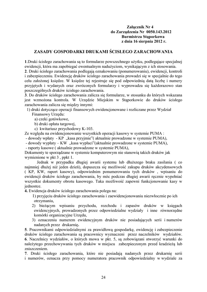 Załącznik Nr 4 do Zarządzenia Nr 0050.143.2012 Burmistrza Stąporkowa z dnia 16 sierpnia 2012 r. ZASADY GOSPODARKI DRUKAMI ŚCISŁEGO ZARACHOWANIA 1.Druki ścisłego zarachowania są to formularze powszechnego użytku, podlegające specjalnej ewidencji, która ma zapobiegać ewentualnym nadużyciom, wynikającym z ich stosowania. 2. Druki ścisłego zarachowania podlegają oznakowaniu (ponumerowaniu), ewidencji, kontroli i zabezpieczeniu. Ewidencję druków ścisłego zarachowania prowadzi się w specjalnie do tego celu założonej księdze. W księdze tej rejestruje się pod odpowiednią datą liczbę i numery przyjętych i wydanych oraz zwróconych formularzy i wyprowadza się każdorazowo stan poszczególnych druków ścisłego zarachowania. 3. Do druków ścisłego zarachowania zalicza się formularze, w stosunku do których wskazana jest wzmożona kontrola. W Urzędzie Miejskim w Stąporkowie do druków ścisłego zarachowania zalicza się między innymi: 1) druki dotyczące operacji finansowych ewidencjonowane i rozliczane przez Wydział Finansowy Urzędu: a) czeki gotówkowe, b) druki opłata targowej, c) kwitariusz przychodowy K-103. Ze względu na ewidencjonowanie wszystkich operacji kasowy w systemie PUMA : - dowody wpłaty - KP „kasa przyjmie”( aktualnie prowadzone w systemie PUMA), - dowody wypłaty – KW „kasa wypłaci”(aktualnie prowadzone w systemie PUMA), - raporty kasowe ( aktualnie prowadzone w systemie PUMA), Dokumenty te sporządzane w systemie komputerowym nie stanowią takich druków jak wymienione w pkt 3 , ppkt 1. Jednak w przypadku długiej awarii systemu lub dłuższego braku zasilania ( co najmniej dłużej niż jeden dzień), dopuszcza się możliwość zakupu druków akcydensowych ( KP, KW, raport kasowy), odpowiednim ponumerowaniu tych druków , wpisaniu do ewidencji druków ścisłego zarachowania, by móc podczas długiej awarii ręcznie wypełniać wszystkie dokumenty obrotu kasowego. Taka możliwość zapewni funkcjonowanie kasy w jednostce. 4. Ewidencja druków ścisłego zarachowania polega na: 1) przyjęciu druków ścisłego zarachowania i zaewidencjonowaniu niezwłocznie po ich otrzymaniu, 2) bieżącym wpisaniu przychodu, rozchodu i zapasów druków w księgach ewidencyjnych, prowadzonych przez odpowiedzialne wydziały i inne równorzędne komórki organizacyjne Urzędu, 3) oznaczeniu numerem ewidencyjnym druków nie posiadających serii i numerów nadanych przez drukarnię. 5. Pracownikami odpowiedzialnymi za prawidłową gospodarkę, ewidencję i zabezpieczenie druków ścisłego zarachowania są pracownicy wyznaczeni przez naczelników wydziałów. 6. Naczelnicy wydziałów, o których mowa w pkt. 5, są zobowiązani stworzyć warunki do należytego przechowywania tych druków w miejscu zabezpieczonym przed kradzieżą lub zniszczeniem. 7. Druki ścisłego zarachowania, które nie posiadają nadanych przez drukarnię serii i numerów, oznacza przy pomocy numeratora pracownik odpowiedzialny w wydziale za 24 gospodarkę drukami bezpośrednio po otrzymaniu druków po czym ujmuje druki w prowadzonej ewidencji. 8. W przypadku druków broszurowych (w blokach) należy dodatkowo na okładce każdego bloku odnotować (dotyczy również druków posiadających serie i numery nadane w drukarni): 1) numer kolejny bloku, 2) numer kart bloku od nr....... do nr ....... , 3) liczbę kart każdego bloku poświadczoną podpisem osoby odpowiedzialnej za gospodarkę drukami ścisłego zarachowania, 9. Poszczególne bloki dowodów należy ponumerować w momencie przyjęcia i zaprzychodować w księdze druków ścisłego zarachowania. Poszczególne karty bloków należy numerować bezpośrednio przed wydaniem ich do użytku, w celu zachowania ciągłości numerów w ciągu roku. Na okładce należy wpisać – ilość kart bloku. Po wyczerpaniu bloku, przy wydawaniu następnego, na okładce należy wpisać okres, w którym druki zostały wykorzystane. 10. Niedopuszczalne jest wydanie do użytku druków ścisłego zarachowania nie ujętych w ewidencji oraz nie posiadających wszystkich wymienionych wyżej oznaczeń. 11. Ewidencję wszystkich druków ścisłego zarachowania należy prowadzić odrębnie dla każdego rodzaju druków w księdze o ponumerowanych stronach. Na ostatniej stronie należy wpisać: księga zawiera ilość stron, kolejno ponumerowanych i zalakowanych przez osobę upoważnioną. 12. Podstawę zapisów w księdze druków ścisłego zarachowania stanowią: 1) dla przychodu kserokopia rachunku dostawcy, ewentualnie dowodu przyjęcia, 2) dla rozchodu – pokwitowanie osoby upoważnionej do odbioru druków, udokumentowane upoważnieniem. 13. Zapisy w księdze druków ścisłego zarachowania powinny być dokonywane czytelnie atramentem lub długopisem. Niedopuszczalne jest jakiekolwiek wycieranie lub wyskrobywanie omyłkowych zapisów. Omyłkowy zapis należy przekreślić tak, aby można go było odczytać i wpisać zapis prawidłowy. Osoba dokonująca poprawki powinna obok wniesionej poprawki umieścić swój podpis i datę dokonania tej czynności. 14. Wydział Finansowy wydaje druki biletów opłaty targowej dla Inkasentów wyłącznie na pisemne zapotrzebowanie podpisane przez osoby upoważnione. Zapotrzebowanie powinno określać żądaną liczbę druków i imiennie osobę upoważnioną do ich odbioru. 15. Księgi ewidencyjne, protokoły przyjęcia i ocechowania oraz wszelką dokumentację dotyczącą gospodarki drukami ścisłego zarachowania (zapotrzebowania, rozliczenia itp.) należy przechowywać przez okres 5 lat. 16. Egzemplarze wykorzystanych druków ścisłego zarachowania pozostające w jednostce wystawiającej podlegają komisyjnej likwidacji w tej jednostce na podstawie decyzji kierownika jednostki. 17. Błędnie wypełnione druki powinny być anulowane przez wpisanie adnotacji „anulowano” wraz z datą i czytelnym podpisem osoby dokonującej tych czynności. Anulowane druki, o ile są broszurowe, należy pozostawić w blo