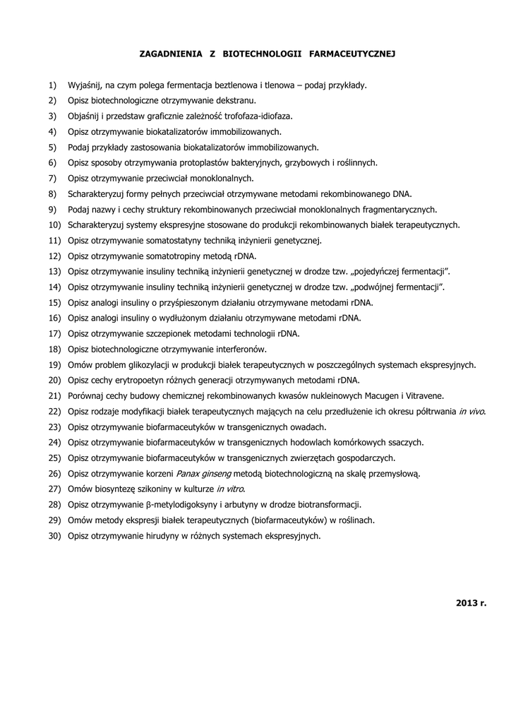 ZAGADNIENIA Z BIOTECHNOLOGII FARMACEUTYCZNEJ 1) Wyjaśnij, na czym polega fermentacja beztlenowa i tlenowa – podaj przykłady. 2) Opisz biotechnologiczne otrzymywanie dekstranu. 3) Objaśnij i przedstaw graficznie zależność trofofaza-idiofaza. 4) Opisz otrzymywanie biokatalizatorów immobilizowanych. 5) Podaj przykłady zastosowania biokatalizatorów immobilizowanych. 6) Opisz sposoby otrzymywania protoplastów bakteryjnych, grzybowych i roślinnych. 7) Opisz otrzymywanie przeciwciał monoklonalnych. 8) Scharakteryzuj formy pełnych przeciwciał otrzymywane metodami rekombinowanego DNA. 9) Podaj nazwy i cechy struktury rekombinowanych przeciwciał monoklonalnych fragmentarycznych. 10) Scharakteryzuj systemy ekspresyjne stosowane do produkcji rekombinowanych białek terapeutycznych. 11) Opisz otrzymywanie somatostatyny techniką inżynierii genetycznej. 12) Opisz otrzymywanie somatotropiny metodą rDNA. 13) Opisz otrzymywanie insuliny techniką inżynierii genetycznej w drodze tzw. „pojedyńczej fermentacji”. 14) Opisz otrzymywanie insuliny techniką inżynierii genetycznej w drodze tzw. „podwójnej fermentacji”. 15) Opisz analogi insuliny o przyśpieszonym działaniu otrzymywane metodami rDNA. 16) Opisz analogi insuliny o wydłużonym działaniu otrzymywane metodami rDNA. 17) Opisz otrzymywanie szczepionek metodami technologii rDNA. 18) Opisz biotechnologiczne otrzymywanie interferonów. 19) Omów problem glikozylacji w produkcji białek terapeutycznych w poszczególnych systemach ekspresyjnych. 20) Opisz cechy erytropoetyn różnych generacji otrzymywanych metodami rDNA. 21) Porównaj cechy budowy chemicznej rekombinowanych kwasów nukleinowych Macugen i Vitravene. 22) Opisz rodzaje modyfikacji białek terapeutycznych mających na celu przedłużenie ich okresu półtrwania in vivo. 23) Opisz otrzymywanie biofarmaceutyków w transgenicznych owadach. 24) Opisz otrzymywanie biofarmaceutyków w transgenicznych hodowlach komórkowych ssaczych. 25) Opisz otrzymywanie biofarmaceutyków w transgenicznych zwierzętach gospodarczych. 26) Opisz otrzymywanie korzeni Panax ginseng metodą biotechnologiczną na skalę przemysłową. 27) Omów biosyntezę szikoniny w kulturze in vitro. 28) Opisz otrzymywanie β-metylodigoksyny i arbutyny w drodze biotransformacji. 29) Omów metody ekspresji białek terapeutycznych (biofarmaceutyków) w roślinach. 30) Opisz otrzymywanie hirudyny w różnych systemach ekspresyjnych. 2013 r.