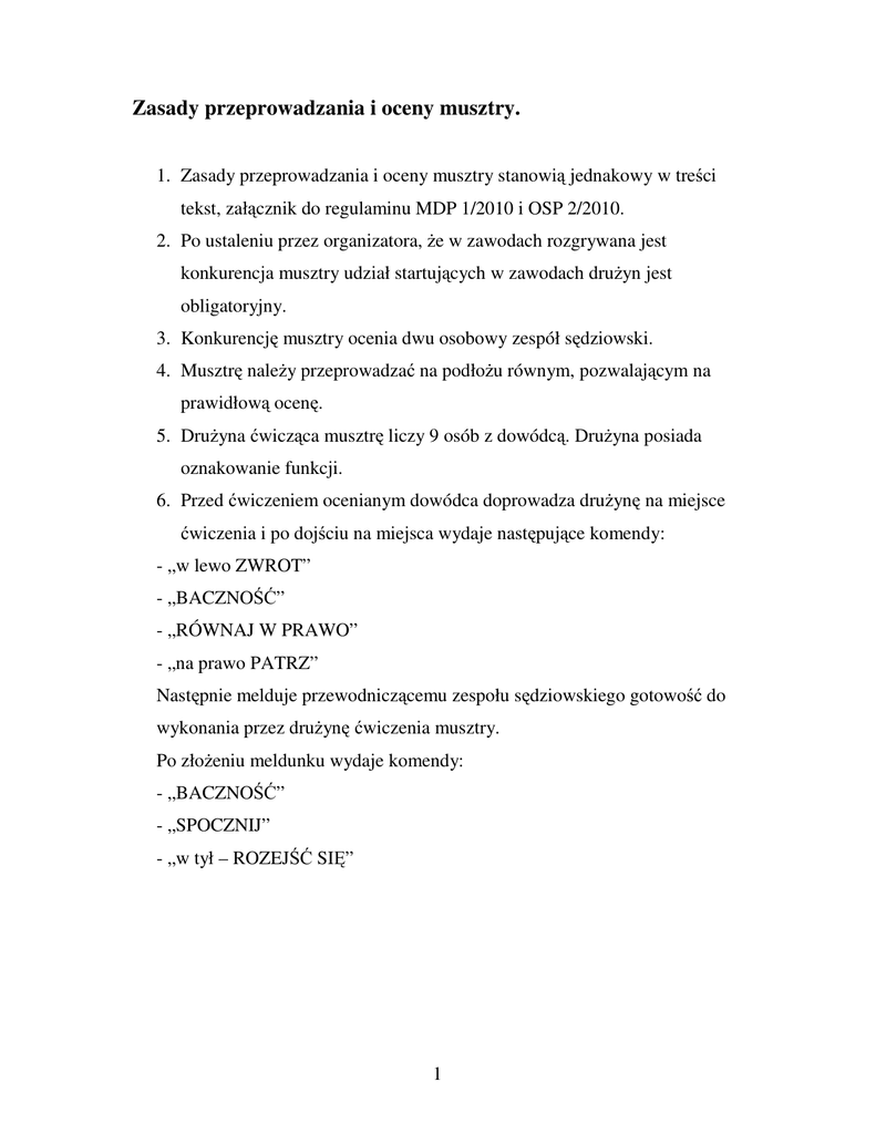 Zasady przeprowadzania i oceny musztry. 1. Zasady przeprowadzania i oceny musztry stanowią jednakowy w treści tekst, załącznik do regulaminu MDP 1/2010 i OSP 2/2010. 2. Po ustaleniu przez organizatora, że w zawodach rozgrywana jest konkurencja musztry udział startujących w zawodach drużyn jest obligatoryjny. 3. Konkurencję musztry ocenia dwu osobowy zespół sędziowski. 4. Musztrę należy przeprowadzać na podłożu równym, pozwalającym na prawidłową ocenę. 5. Drużyna ćwicząca musztrę liczy 9 osób z dowódcą. Drużyna posiada oznakowanie funkcji. 6. Przed ćwiczeniem ocenianym dowódca doprowadza drużynę na miejsce ćwiczenia i po dojściu na miejsca wydaje następujące komendy: - „w lewo ZWROT” - „BACZNOŚĆ” - „RÓWNAJ W PRAWO” - „na prawo PATRZ” Następnie melduje przewodniczącemu zespołu sędziowskiego gotowość do wykonania przez drużynę ćwiczenia musztry. Po złożeniu meldunku wydaje komendy: - „BACZNOŚĆ” - „SPOCZNIJ” - „w tył – ROZEJŚĆ SIĘ” 1 7. Podstawowe OCENIANE ĆWICZENIE to wydawane z pamięci i wykonywane przez drużynę następujące komendy: - „drużyna w szeregu – ZBIÓRKA” - „BACZNOŚĆ” - „równaj – W PRAWO” - „SPOCZNIJ” - „kolejno – ODLICZ” - „w prawo – ZWROT” - „w tył – ZWROT” (przez lewe ramię) - „w lewo – ZWROT” - „w tył – ZWROT” (przez lewe ramię) - „do dwóch – ODLICZ” - „w dwójki w prawo ZWROT”. Dowódca stojąc na czele drużyny wydaje komendę: - „za mną MARSZ”. Po tej komendzie kończy się ocenianie ćwiczenia. Przed ćwiczeniem drużyna otrzymuje 20 pkt. dodatnich. Suma punktów podlega sędziowskiemu umniejszaniu za: - błędnie wydaną komendę – 2 pkt. - błędne wykonanie komendy – za każdy przypadek i każdego ćwiczącego 1pkt. Na zakończenie ćwiczenia dowódca prowadzi drużynę przed pozorowaną trybuną (przewodniczący zespołu sędziowskiego). Przemarsz częściowo wykonywany jest krokiem defiladowym zgodnie z wydawanymi komendami: - „drużyna – BACZNOŚĆ” (dowódca odwraca głowę przez lewe ramię) - „na prawo – PATRZ” (dowódca salutuje). Kiedy cała drużyna przejdzie 5 kroków za odbierającego defiladę sędziego dowódca przestaje salutować i wydaje komendę: - „BACZNOŚĆ” (dowódca odwraca głowę przez lewe ramię) - „SPOCZNIJ”. Drużyna w szyku marszowym opuszcza plac ćwiczeń. Dowódca drużyny może zapoznać się z oceną sędziowską. 2 8. Szkic placu ćwiczenia musztry Uwaga: podczas defilady kierunkowy (pierwszy z prawej ) nie zwraca głowy ku sędziemu). 9. Tabela oceny musztry Popełnione 1 2 3 4 5 6 7 błędy 8 9 Punkty Ujemne Wynik 20 Ocena Wyjaśnienia do tabeli W zależności od ustaleń wypełniamy wszystkie rubryki lub tylko oceny całości. Dla regulaminu OSP – 2/2010 patrz regulamin pkt. 3.3 tabela 1- dowódca drużyny 2- Przodownik Roty I 3- Pomocnik przodownika Roty I 4- Przodownik Roty II 5- Pomocnik przodownika Roty II 6- Rozdzielaczowy 7- Łącznik 8- Mechanik (w grupie C – kobieta) 9- Rezerwowy Uwaga: Umieszczony na jednej stronie pkt. 8 i 9 z wyjaśnieniami jest kartą oceny musztry. 3 Szkic ćwiczenia musztry. Uwaga: podczas defilady kierunkowy (pierwszy z prawej ) nie zwraca głowy ku sędziemu). Tabela oceny musztry 1 2 3 Popełnione błędy do oceny podstawowej 4 5 6 7 8 9 Punkty Punkty Wynik ujemne 20 Ocena pomocnicza 1÷5 S1............................... S2................................ Uwaga: W zależności od ustaleń wypełniamy wszystkie rubryki lub ocenę całościową. Dla regulaminu OSP 2/2010 patrz pkt. 3.3 tabela 1 Dowódca drużyny 2 Przodownik Roty I 3 Pomocnik przodownika Roty I 4 Przodownik Roty II 5 Pomocnik przodownika Roty II 6 Rozdzielaczowy 7 Łącznik 8 Mechanik (w grupie C – kobieta) 9 Rezerwa Niniejszy dokument jest wzorem karty oceny musztry. 4 Regulamin Polskiej Odznaki Sędziowskiej 1. Polska Odznaka Sędziowska stanowi czytelne, wizualne oznaczenie osoby sędziującej zawody sportowo pożarnicze. 2. Odznaka noszona jest obowiązkowo w czasie wykonywania czynności sędziowskich w skali 1:1 3. Wzór Polskiej Odznaki Sędziowskiej może być stosowany na identyfikatorach osobistych sędziów. 4. Wzorem Polskiej Odznaki Sędziowskiej można oznaczać dokumenty uzywane przez wojewódzkie Kolegia Sędziów. 5. Odznaka jest noszona na prawej stronie ubioru na wysokości piersi powyżej kieszeni munduru. 6. Dopuszcza się stosowanie miniatur Polskiej Odznaki Sędziowskiej zachowując proporcje wymiarów. 7. Wzór Odznaki Sędziów Wojewódzkich (to niebieskie) i Krajowych (tło białe) w skali 1:1 8. Wzór Odznaki Sędziów Międzynarodowych w skali 1:1. 5
