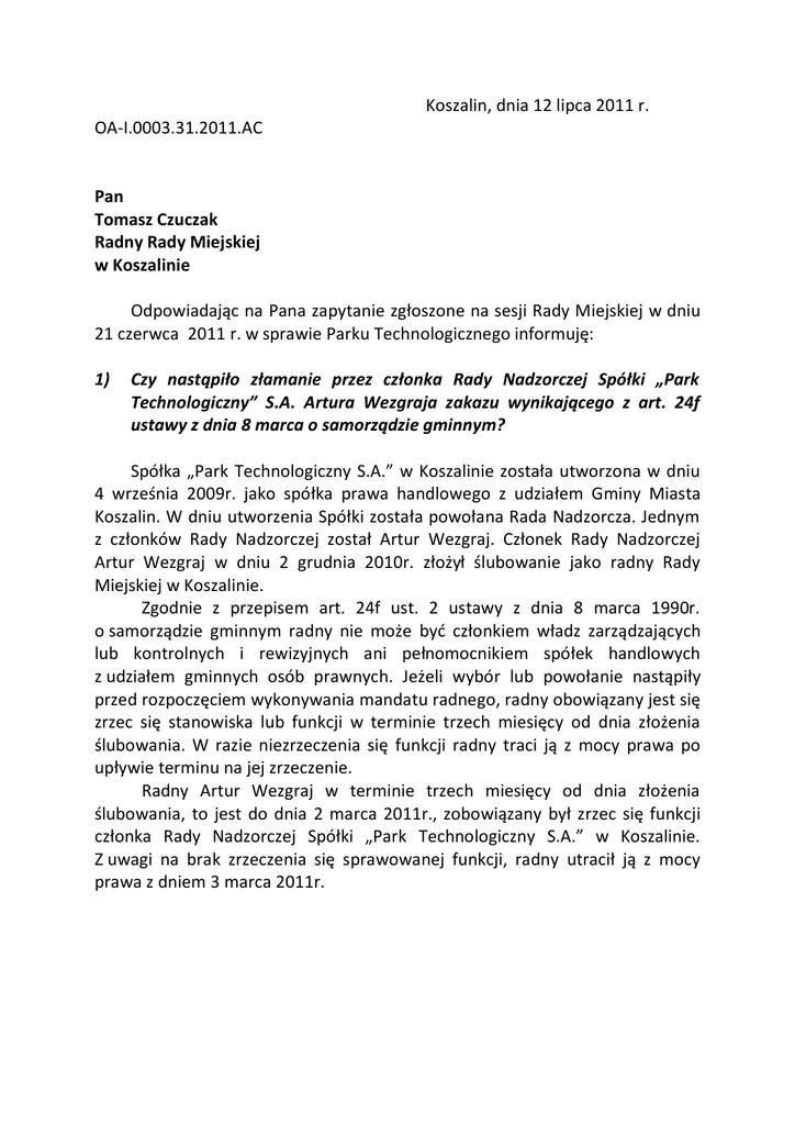 Koszalin, dnia 12 lipca 2011 r. OA-I.0003.31.2011.AC Pan Tomasz Czuczak Radny Rady Miejskiej w Koszalinie Odpowiadając na Pana zapytanie zgłoszone na sesji Rady Miejskiej w dniu 21 czerwca 2011 r. w sprawie Parku Technologicznego informuję: 1) Czy nastąpiło złamanie przez członka Rady Nadzorczej Spółki „Park Technologiczny” S.A. Artura Wezgraja zakazu wynikającego z art. 24f ustawy z dnia 8 marca o samorządzie gminnym? Spółka „Park Technologiczny S.A.” w Koszalinie została utworzona w dniu 4 września 2009r. jako spółka prawa handlowego z udziałem Gminy Miasta Koszalin. W dniu utworzenia Spółki została powołana Rada Nadzorcza. Jednym z członków Rady Nadzorczej został Artur Wezgraj. Członek Rady Nadzorczej Artur Wezgraj w dniu 2 grudnia 2010r. złożył ślubowanie jako radny Rady Miejskiej w Koszalinie. Zgodnie z przepisem art. 24f ust. 2 ustawy z dnia 8 marca 1990r. o samorządzie gminnym radny nie może być członkiem władz zarządzających lub kontrolnych i rewizyjnych ani pełnomocnikiem spółek handlowych z udziałem gminnych osób prawnych. Jeżeli wybór lub powołanie nastąpiły przed rozpoczęciem wykonywania mandatu radnego, radny obowiązany jest się zrzec się stanowiska lub funkcji w terminie trzech miesięcy od dnia złożenia ślubowania. W razie niezrzeczenia się funkcji radny traci ją z mocy prawa po upływie terminu na jej zrzeczenie. Radny Artur Wezgraj w terminie trzech miesięcy od dnia złożenia ślubowania, to jest do dnia 2 marca 2011r., zobowiązany był zrzec się funkcji członka Rady Nadzorczej Spółki „Park Technologiczny S.A.” w Koszalinie. Z uwagi na brak zrzeczenia się sprawowanej funkcji, radny utracił ją z mocy prawa z dniem 3 marca 2011r. 2) Czy decyzje podjęte na posiedzeniach Rady Nadzorczej po dniu 3 marca br. są ważne? Statut Spółki „Park Technologiczny S.A.” w Koszalinie stanowi w § 11, że Rada Nadzorcza składa się z co najmniej czterech członków. W dniu 4 września 2009r. została powołana Rada Nadzorcza w składzie czteroosobowym. Z uwagi na utratę funkcji członka Rady Nadzorczej Spółki przez Artura Wezgraja z dniem 3 marca 2011r., skład Rady zmniejszył się poniżej statutowego minimum. Zmniejszenie się liczby członków Rady Nadzorczej poniżej składu wymaganego przez Statut skutkuje tym, że Rada Nadzorcza jako organ Spółki przestała istnieć. Organ, w skład którego nie wchodzi wymagana liczba członków nazywany jest „kadłubowym”. „Kadłubowa” Rada Nadzorcza nie mogła skutecznie podejmować uchwał. Uchwały podjęte przez „kadłubową” Radę Nadzorczą Spółki „Park Technologiczny S.A.” w Koszalinie , tzn. uchwały podjęte po dniu 2 marca 2011r., są nieważne. 3) Jakie w zaistniałej sytuacji mogą wynikać konsekwencje prawne i finansowe dla Spółki? W dniu 13 maja 2011r. na posiedzeniu Rady Nadzorczej Spółki „Park Technologiczny S.A.” w Koszalinie zostały podjęte uchwały opiniujące projekty uchwał Walnego Zgromadzenia na podstawie postanowienia § 13 pkt 5 Statutu Spółki oraz uchwała opiniująca sprawozdanie finansowe Spółki za 2010r. (uchwała nr 2/2011), sprawozdanie z działalności Zarządu Spółki za 2010r. (uchwała nr 3/2011) oraz uchwała opiniująca informację w sprawie pokrycia straty (uchwała nr 4/2011). Wskazane uchwały nr 2/2011; 3/2011; 3/2011 stanowiły opinie wymagane przez art. 395 § 1 pkt 1 i 2 k.s.h. w zw. z art. 382 § 3 k.s.h., konieczne przed podjęciem uchwał przez Walne Zgromadzenie. Na podstawie opinii Rady Nadzorczej w dniu 17 maja 2011r. Zwyczajne Walne Zgromadzenie Akcjonariuszy „Parku Technologicznego S.A.” w Koszalinie zatwierdziło sprawozdanie finansowe Spółki Park Technologiczny S.A. w Koszalinie za rok obrotowy 2010r. (uchwała nr 4/2011), sprawozdanie Zarządu Spółki Park Technologiczny S.A. w Koszalinie z działalności Spółki za rok obrotowy 2010 (uchwała nr 5/2011) oraz podjęło uchwałę w sprawie pokrycia straty (uchwała 6/2011). Z uwagi na to, że uchwały opiniujące (nr 2/2011; nr 3/2011; nr 4/2011) podjęte przez Radę Nadzorczą w dniu 13 maja 2011r. są nieważne jako podjęte przez organ nieuprawniony do działania, uznać należy, że uchwały Walnego Zgromadzenia z dnia 17 maja 2011r. (nr 4/2011; nr 5/2011; nr 6/2011) zostały podjęte bez wymaganych przez ustawę uchwał opiniujących. Brak wymaganej przepisami kodeksu spółek handlowych ważnej opinii Rady Nadzorczej przy podjęciu uchwały przez Walne Zgromadzenie powoduje podjęcie uchwały w sposób sprzeczny z ustawą. W tej sytuacji w sposób sprzeczny z ustawą zostały podjęte uchwały nr 4/2011; nr 5/2011; nr 6/2011. Skutek taki nie wystąpił w stosunku do pozostałych uchwał podjętych przez Walne Zgromadzenie w dniu 17 maja 2011r., co prawda bez ważnej opinii Rady Nadzorczej ale wymaganej wyłącznie na podstawie Statutu. W takim przypadku wskazać można wyłącznie na sprzeczność uchwały Walnego Zgromadzenia ze Statutem. Przepisy kodeksu spółek handlowych przewidują dwa rodzaje powództw prowadzących do podważenia ważności uchwały walnego zgromadzenia akcjonariuszy: o stwierdzenie jej nieważności – w stosunku do uchwał sprzecznych z ustawą (art. 425 § 1 k.s.h.) i o jej uchylenie – w stosunku do uchwał sprzecznych ze statutem (art. 422 k.s.h.). Poza nimi uchwała podważana być nie może niezależnie od okoliczności jej podjęcia. Uchwała Walnego Zgromadzenia podjęta z naruszeniem postanowień statutu jest ważna i obowiązująca – do chwili prawomocnego wyroku orzekającego jej uchylenie wydanego w sprawie z powództwa o uchylenie uchwały, wytoczonego na podstawie art. 422 k.s.h., wniesionego w terminie wskazanym w art. 424 § 1 k.s.h. Uchwała Walnego Zgromadzenia podjęta w sposób sprzeczny z ustawą może być kwestionowana jedynie na drodze powództwa o stwierdzenie jej nieważności w trybie i terminie przewidzianym przez art. 425 k.s.h oraz wyłącznie prz
