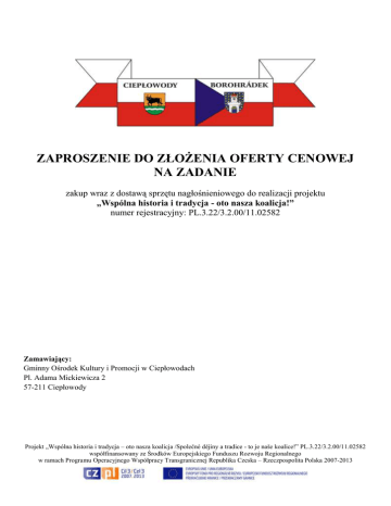ZAPROSZENIE DO ZŁOŻENIA OFERTY CENOWEJ NA ZADANIE zakup wraz z dostawą sprzętu nagłośnieniowego do realizacji projektu „Wspólna historia i tradycja - oto nasza koalicja!” numer rejestracyjny: PL.3.22/3.2.00/11.02582 Zamawiający: Gminny Ośrodek Kultury i Promocji w Ciepłowodach Pl. Adama Mickiewicza 2 57-211 Ciepłowody Projekt „Wspólna historia i tradycja – oto nasza koalicja /Společné dějiny a tradice - to je naše koalice!” PL.3.22/3.2.00/11.02582 współfinansowany ze Środków Europejskiego Funduszu Rozwoju Regionalnego w ramach Programu Operacyjnego Współpracy Transgranicznej Republika Czeska – Rzeczpospolita Polska 2007-2013 1. Zamawiający Gminny Ośrodek Kultury i Promocji w Ciepłowodach, Pl. Adama Mickiewicza 2, 57-211Ciepłowody. Osobą upoważnioną do kontaktów z oferentami jest: Edyta Zielonka, tel. 74 80 03 274, mobile: 509 791 690, e-mail: [email protected] 2. Opis przedmiotu zamówienia: Przedmiotem zamówienia jest zakup wraz z dostawą do siedziby zamawiającego zestawu nagłośnieniowego niezbędnego do realizacji projektu „Wspólna historia i tradycja – oto nasza koalicja/Společné dějiny a tradice - to je naše koalice!” PL.3.22/3.2.00/11.02582, współfinansowanego ze Środków Europejskiego Funduszu Rozwoju Regionalnego w ramach Programu Operacyjnego Współpracy Transgranicznej Republika Czeska – Rzeczpospolita Polska 2007-2013. Szczegółowa charakterystyka: SUBWOOFER SZT. 1 Częstotliwości odpowiedzi +/- 3dB 45 Hz - 130 Hz Skutecznośd 1W 101 Db Max SPL, @ 10% THD 128 dB @ 10% THD (półprzestrzeo) Wzmacniacz 1x 700 W / Class D Aktywne układy zabezpieczające DDO™ Controller, Multiband-Limiter Połączenia 2x XLR Combi Line In, 2x XLR Through, 2x Speakon Satellite Outs Głośnik 1x 15" Obudowa MDF, osłona przednia: metalowy grill z gąbką akustyczną, wykooczenie Czarna farba akrylowa, gniazdo statywowe z uchwytem M20, zintegrowane kółka, 2 uchwyty zintegrowane W komplecie pokrowiec ochronny SATELITY SZT. 2 Moc nominalna (RMS) 250 W RMS, Wzmacniacz 2x 250 W / Class D Częstotliwości odpowiedzi +/- 3dB 130 Hz - 19 kHz, Impedancja nominalna 8 Ohm. Skutecznośd 1W 103 dB Max SPL, @ 10% THD 125 dB @ 10% THD (półprzestrzeo) Aktywne układy zabezpieczające: dynamiczny obwód ochronny Połączenia 1x Speakon NL4 Głośnik Low/Mid 1x 8" Neodymowy HF Driver 1" Charakterystyka tuby: 60° x 40° CD Częstotliwośd crossovera: 2,2 kHz 12 dB / okt. Obudowa: MDF, osłona przednia: metalowy grill z gąbką akustyczną, wykooczenie: czarna farba akrylowa, 1 zintegrowany uchwyt, gniazdo statywowe MonoTilt 10°, 36mm W komplecie statywy głośnikowe i pokrowce ochronne MONITORY ODSŁUCHOWE AKTYWNE SZT. 2 moc: 160 W (4 ohm) głośnik 12" driver: 1" wejście: mic/line XLR, line XLR W komplecie pokrowce ochronne ANALOGOWY MIKSER 16 KANAŁOWY SZT.1 16 Kanałów wejściowych 10 Mikrofonów + 4 Stereofoniczne linie wejściowe 8 gniazd typu insert Zasilanie Phantom (+ 48V) Korektor trzypasmowy ze zmianą częstotliwości filtru środkowego (kanały 1-8) Korektor trzypasmowy (kanały 9/10 - 15/16) Projekt „Wspólna historia i tradycja – oto nasza koalicja /Společné dějiny a tradice - to je naše koalice!” PL.3.22/3.2.00/11.02582 współfinansowany ze Środków Europejskiego Funduszu Rozwoju Regionalnego w ramach Programu Operacyjnego Współpracy Transgranicznej Republika Czeska – Rzeczpospolita Polska 2007-2013 6 szyn typu bus (stereo, 4 grupy) 2 szyny typu aux, 1 szyna efektowa 1 szyna typu return Złącza Neutrik™ XLR Regulacja poziomu gain na kanałach mikrofonowych HPF filtr dolnozaporowy 6 kompresorów 60-milimetrowe tłumiki Cyfrowy procesor efektowy klasy SPX Funkcja "monitor mix" 12-punktowy miernik sygnału LED Możliwośd montażu w skrzyni typu rack Złącze USB do połączenia z komputerem W komplecie pokrowiec ochronny ZESTAW DYNAMICZNYCH MIKROFONÓW BEZPRZEWODOWYCH (w zestawie 4 mikrofony, 2 odbiorniki dwukanałowe, 2 zasilacze, 4 statywy łamane, pokrowce ochronne) Mikrofony o parametrach: Pasmo przenoszenia: 60 Hz - 15 kHz Charakterystyka kierunkowa: kardioidalna Impedancja wyjściowa (przy 1kHz): 300 Ohm Poziom wyjściowy (przy 1kHz): 53 dBV/Pa (2,2 mV); 1 Pa=94 dB SPL Żywotnośd baterii: > 8 godzin przy baterii 9V Odbiorniki o parametrach: Dostępne częstotliwości: pomiędzy 536 - 865 MHz Zakres roboczy: 75 m w typowych warunkach Pasmo przenoszenia audio: 45 do 15,000 Hz +/- 4 dB Złącza wyjściowe audio: symetryczne XLR i niesymetryczne 1/4" Max poziom wyjściowy (w odn. do dewiacji +/- 33 kHz i tonu 1 kHz tonu): -19 dBV (XLR), -5 dBV (1/4")100 dB, char. Aważona Całkowite zniekształcenie systemu: 0.5% typowo (w odn. do dewiacji +/- 33 kHz, 1 kHz modulation) Zasilanie: 12–18 Vdc at 160 mA (PG4), 320mA (PG88), supplied by external power supply Statywy mikrofonowe: Wysokośd: min: 90 cm, maks: 150 cm Konstrukcja metalowa, malowane proszkowo, kolor czarny OKABLOWANIE Kabel mikrofonowy 7 szt. 15m z wtykami Kabel głośnikowy 2 szt. 15m z wtykami Kable do połączenia monitorów 2x 15m z wtykami Kable do połączenia mikrofonów bezprzewodowych z mikserem 4 szt x 2m z wtykami 3. Termin realizacji: do 15.05.2012r. Płatność: w terminie do 14 dni od daty dostawy sprzętu i faktury VAT. 4. Warunki dopuszczające W postępowaniu mogą wziąć udział (złożyć ofertę) oferenci nie wykluczeni na podstawie art. 24 ustawy Prawo zamówień publicznych oraz spełniający warunki zawarte w art. 22 ust. 1 tejże ustawy. Potwierdzeniem spełnienia tych warunków jest złożenie pisemnego oświadczenia stanowiącego załącznik do formularza ofertowego. Projekt „Wspólna historia i tradycja – oto nasza koalicja /Společné dějiny a tradice - to je naše koalice!” PL.3.22/3.2.00/11.02582 współfinansowany ze Środków Europejskiego Funduszu Rozwoju Regionalnego w ramach Programu Operacyjnego Współpracy Transgranicznej Republika Czeska – Rzeczpospolita Polska 2007-2013 5. Informacje dotyczące skład