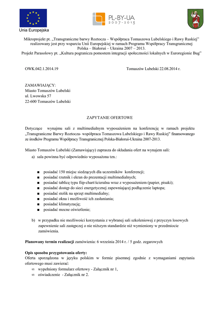 Unia Europejska Mikroprojekt pt. „Transgraniczne barwy Roztocza – Współpraca Tomaszowa Lubelskiego i Rawy Ruskiej” realizowany jest przy wsparciu Unii Europejskiej w ramach Programu Współpracy Transgranicznej Polska – Białoruś – Ukraina 2007 – 2013. Projekt Parasolowy pt. „Kultura pogranicza pomostem integracji społeczności lokalnych w Euroregionie Bug” OWK.042.1.2014.19 Tomaszów Lubelski 22.08.2014 r. ZAMAWIAJĄCY: Miasto Tomaszów Lubelski ul. Lwowska 57 22-600 Tomaszów Lubelski ZAPYTANIE OFERTOWE Dotyczące wynajmu sali z multimedialnym wyposażeniem na konferencję w ramach projektu „Transgraniczne Barwy Roztocza- współpraca Tomaszowa Lubelskiego i Rawy Ruskiej" finansowanego ze środków Programu Współpracy Transgranicznej Polska-Białoruś-Ukraina 2007-2013. Miasto Tomaszów Lubelski (Zamawiający) zaprasza do składania ofert na wynajem sali: a) sala powinna być odpowiednio wyposażona tzn.: ■ ■ ■ ■ ■ ■ ■ ■ posiadać 150 miejsc siedzących dla uczestników konferencji; posiadać rzutnik i ekran do prezentacji multimedialnych; posiadać tablicę typu fiip-chart/ścieralna wraz z wyposażeniem (papier, pisaki); posiadać dostęp do sieci energetycznej zapewniającej podłączenie laptopa; posiadać stolik na sprzęt multimedialny; posiadać okna i możliwość ich zasłaniania; posiadać klimatyzację; posiadać mocne oświetlenie; b) w przypadku nie możliwości korzystania z wybranej sali szkoleniowej z przyczyn losowych zapewnienie sali zastępczej o nie niższym standardzie niż wymieniony w przedmiocie zamówienia. Planowany termin realizacji zamówienia: 6 września 2014 r. / 5 godz. zegarowych Opis sposobu przygotowania oferty: Oferta sporządzona w języku polskim w formie pisemnej zgodnie z wymaganiami zapytania ofertowego musi zawierać: • wypełniony formularz ofertowy - Załącznik nr 1, • oświadczenie - Załącznik nr 2. Kryteria i sposób oceny oferty: Jako kryterium wyboru oferty przyjmuje się kryterium najkorzystniejszej oferty : a) oferta z najniższą ceną za daną część - max. 80 pkt. cena oferty najkorzystniejszej (najniższej) -------------------------------------------------------- x 80 pkt. cena wykonawcy oferty badanej b) doświadczenie potwierdzone referencjami: - max. 20 pkt. Miejsce i termin składania ofert: Oferty należy składać osobiście lub pocztą w siedzibie zamawiającego przy ul. Lwowskiej 57, 22-600 Tomaszów Lubelski lub na adres mailowy [email protected] do dnia 29.08.2014 r. Załącznik Nr 1 FORMULARZ OFERTOWY Dane dotyczące Oferenta Nazwa/ Imię Nazwisko ............................................................................................................................ Siedziba/ Adres ........................................................................................................................................ nr telefonu/faksu ........................................................................................................................................ NIP ............................................................................................................................................................ REGON/PESEL ....................................................................................................................................... Dane dotyczące Zamawiającego: Miasto Tomaszów Lubelski, ul. Lwowska 57, 22-600 Tomaszów Lubelski, tel. 84 664 3740 faks: 84 664 22 43, adres e-mail: [email protected] Zobowiązania oferenta: W odpowiedzi na zapytanie ofertowe na wynajmu sali z multimedialnym wyposażeniem na konferencję w ramach projektu „Transgraniczne Barwy Roztocza- współpraca Tomaszowa Lubelskiego i Rawy Ruskiej" współfinansowanego ze środków Programu Współpracy Transgranicznej Polska-Białoruś-Ukraina 2007-2013 oferuję kwotę w wysokości: cena brutto ………………………euro (słownie: ......................................................................................................................................... ) za realizację działań będących przedmiotem niniejszego zapytania ofertowego. Oświadczam, że: a) Wykonam zamówienie w wyznaczonym terminie. b) Dysponuję niezbędną wiedzą i doświadczeniem oraz osobami zdolnymi do wykonania zamówienia; c) Znajduję się w sytuacji ekonomicznej i finansowej umożliwiającej realizację zamówienia; d) W cenie proponowanej oferty uwzględnione zostały wszystkie koszty wykonania zamówienia. e) Wszystkie dane zawarte w ofercie są zgodne z prawdą. …………………………………………. Data ……………………………………………… Podpisy osób uprawnionych do reprezentowania Oferenta Załącznik Nr 2 OŚWIADCZENIE Oświadczam, że oferent: Nazwa/ Imię Nazwisko ............................................................................................................................................ Siedziba/ Adres ........................................................................................................................................................ nr telefonu/faksu....................................................................................................................................................... NIP ........................................................................................................................................................................... REGON/PESEL ....................................................................................................................................................... • • • • • • Nie znajduje się w stanie upadłości lub likwidacji, jego działalność nie podlega nadzorowi sądowemu, nie zawarł ugody z wierzycielami, nie zawiesił działalności, nie toczy się wobec niego postępowanie w wyżej wymienionych sprawach lub nie znajduje się w podobnej sytuacji wynikającej z podobnych procedur z godnie z przepi
