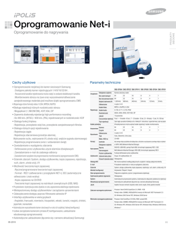 Oprogramowanie Net-i Cechy użytkowe • Oprogramowanie reejstracji do kamer sieciowych Samsung : Dostępne pakiety kamer rejestrujących 1/4/8/16/32/64 . : Rozszerzenie kanałów rejestrowania można nabyć w zestawie dodatkowych kanałów. : Monitorowanie obrazu na żywo oraz wyszukiwanie/odtwarzanie zarejestrowanego materiału jest możliwe dzięki oprogramowaniu CMS • Wspomaga różne formaty video: H.264, MPEG4, MJPEG •Obsługa rejestracji różnych rozdzielczości obrazu : Megapiksel (1.3M/2M/3M), 4CIF, VGA, CIF • Zapewnia doskonałą rejestarcję high performance recording : Do 480 kl/s. (NTSC) / 400 kl/s. (PAL) rejestrowanych w rozdzielczości 4CIF • Obsługa funkcji triplexu : Rejestracja, przesyłanie wizji live, przesyłanie zarejestrowanych filmów. • Obsługa różnych opcji rejestrowania : Rejestracja ciągła : Rejestracja zdarzeniowa (przed/po alarmie), Wykrywanie ruchu, wykrywanie I/V, utrata wizji, wejście sygnału alarmowego) : Rejestracja programowana (wraz z ustawianiem świąt) • Zawiadamianie o wystąpieniu zdarzenia : Definiowane przez użytkownika użycie alarmów dźwiękowych : Zawiadamianie e-mail do zadanego odbiorcy : Zawiadamianie wysyłane do programowania monitorowania (oprogramowanie CMS) • Dziennik zdarzeń: System, dostęp użytkownika, kopia zapasowa, rejestracja, ruch, alarm, utrata wizji, I/V • Możliwość tworzenia kopii zapasowej : Ręczne/programowane tworzenie kopii zapasowej : Format - REC1 (odtwarzanie z przeglądarki NET-i), SEC (automatyczne odtwarzanie i znak wodny) : Kopia zapasowa na CD/DVD : Tworzenie kopii zapasowej na nośnikach zewnętrznych (USB, NAS) • Przydzielanie i dystrybucja wielu dysków w celu zapewnienia stabilnego rejestrowania • Wielopoziomowy dostęp użytkowników i zarządzanie uprawnieniami • Zabezpieczenie dostępu poprzez filtrowanie adresów IP • Interfejs użytkownika w wielu językach : Angielski, francuski, niemiecki, hiszpański, włoski, turecki, rosyjski, chiński, japoński, koreański • Automatyczne wyszukiwanie kamer sieciowych w celu ich szybkiej i łatwej konfiguracji • Łatwe zarządzanie kamerami (zmiana IP, konfigurowanie, uaktualnianie wbudowanego oprogramowania) • Automatyczne uaktualnianie (łączenie się z serwera aktualizacji Samsung) 05-2010 PRODUKTY SIECIOWE Oprogramowanie do nagrywania Parametry techniczne SNS-SF064 SNS-SF032 SNS-SF016 SNS-SF008 SNS-SF004 SNS-SF001 Urządzenie Obsługiwane urządzenia Kamera sieciowa, koder Maks. urządzeń rejestrujących 64 32 16 8 4 Maks. liczba rejestrowanych kanałów 64 32 16 8 4 1 480 kl/s. 240 kl/s. 120 kl/s. 30 kl/s. Wydajność rejestrowania (CIF) 1,920 kl/s. 960 kl/s. Odtwarzanie 4 użytk. X 4 K Kodek Video MPEG-4, MJPEG, H.264 Rejestracja Kodek Audio 1 G.726, G.711, G.723, PCM Rozdzielczość QXGA, UXGA, SXGA, 4CIF, VGA, CIF Jakość 10 poziomów Czas przed/po rejestracji Przed: 1 ~ 16 kanałów - 60 sek., 17 ~ 32 kanałów – 30 sek., 33 ~ 64 kanały – 15 sek.; Po: 1200 sek. Tryb rejestracji Kodek podwójny Komponentowe Wyszukiwanie Pamięć Kopia zapasowa Zapis ciągły, wg wydarzeń (detekcja ruchu / detekcja IV / utrata obrazu / sygnał alarmowy), zapis wg zegara W każdej kamerze można wybrać kodek rejestracji i kodek monitorowania. Kamera 64 32 16 8 4 1 Czujnik 64 32 16 8 4 1 Odtwarzanie 4 użytk. X 4 K Tryb Czas, Zdarzenie, Linia czasu Maks. HDD na 23 HDD kontroler Ilość wolnego miejsca przydzielana do każdego dysku; ostrzeżenie o wyczerpywaniu się wolnego miejsca na dyskach Obsługiwane urządzenia e-SATA, NAS (Network Attached Storage) Ręczny DVD/CD, USB HDD, pamięć flash USB, format kopii zapasowej: REC1, SEC Harmonogram NAS (Network Attached Storage), HDD USB, format kopii zapasowej: REC1 Poziom użytkownika Funkcje definiowane przez użytkownika Użytkownik Użytkownik lokalny (zdalny) Grupa: 32 użytkowników: 32 Filtrowanie IP użytkowników zdalnych Obsługiwany Obsługa NIC NIC można wybierać według połączonych urządzeń i rodzaju połączenia kleinta. E-mail Przesyłanie wiadomości e-mail po wystąpieniu zdarzenia Dziennik System, dostęp użytkownika, kopia zapasowa, rejestracja, ruch, alarm, utrata wizji, I/V Wartość konfiguracji Inicjowanie / Eksport / Import Stan oprogramowania Połączone urządzenia, ręczna / programowana rejestracja Szyfrowanie pakietu logowania Obsługiwany System Automatyczne przywracanie systemu, Automatyczne włączanie zasilania do rejestracji Aktualizacja oprogramowania Automatyczne uaktualnianie (łączenie się z serwera aktualizacji Samsung) Język Angielski, francuski, niemiecki, hiszpański, włoski, turecki, rosyjski, chiński, japoński, koreański Zalecane wymagania systemowe: Procesor: Xeon E5405 QuardCore 2.0, RAM : 4 GB Pamięć video: 256MB, 2HDDs(SATA II) nowszy niż Microsoft .NET Framework 3.5 SO: Windows 2003 Server SP2, Windows 2008 Server Minimalne wymagania systemowe Procesor: Intel Core2Duo 2.53 GHz, RAM : ponad 2GB . Pamięć video: 256MB, 2HDDs(SATA II) nowszy niż Microsoft .NET Framework 3.5 SO: Windows XP2, Windows 2003 Server SP2, Windows Vista, Windows 2008 Server, Windows 7 95