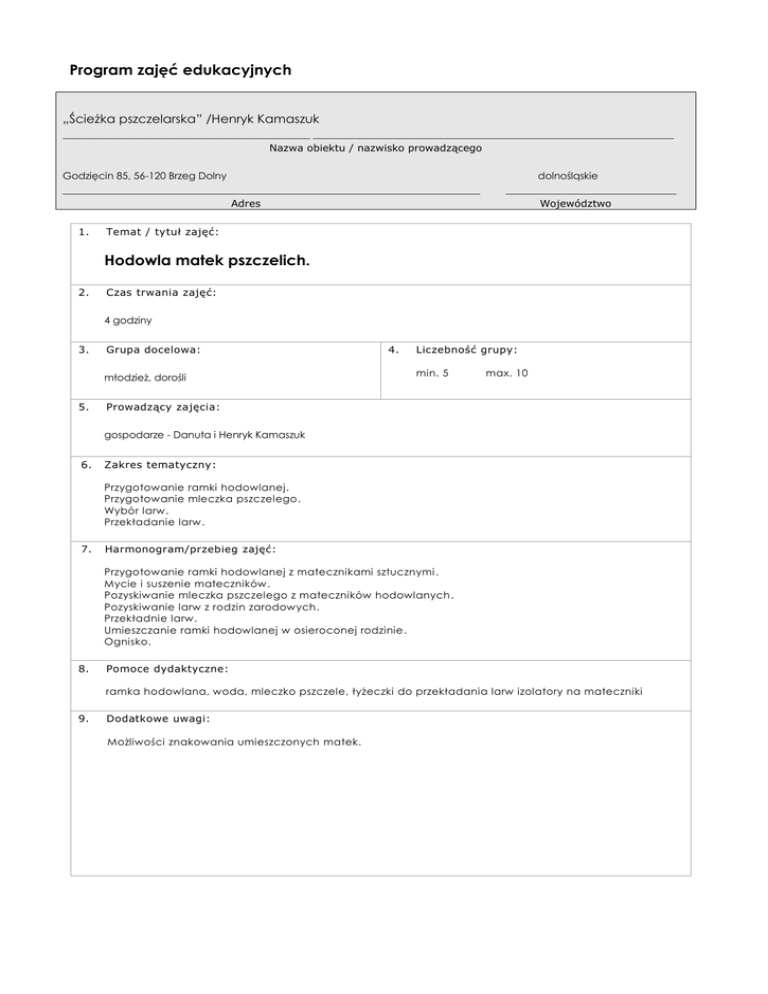 Program zajęć edukacyjnych „Ścieżka pszczelarska” /Henryk Kamaszuk ________________________________________________ ______________________________________________________________________ Nazwa obiektu / nazwisko prowadzącego Godzięcin 85, 56-120 Brzeg Dolny _________________________________________________________________________________ Adres 1. dolnośląskie _________________________________ Województwo Temat / tytuł zajęć: Hodowla matek pszczelich. 2. Czas trwania zajęć: 4 godziny 3. Grupa docelowa: młodzież, dorośli 5. 4. Liczebność grupy: min. 5 max. 10 Prowadzący zajęcia: gospodarze - Danuta i Henryk Kamaszuk 6. Zakres tematyczny: Przygotowanie ramki hodowlanej. Przygotowanie mleczka pszczelego. Wybór larw. Przekładanie larw. 7. Harmonogram/przebieg zajęć: Przygotowanie ramki hodowlanej z matecznikami sztucznymi . Mycie i suszenie mateczników . Pozyskiwanie mleczka pszczelego z mateczników hodowlanych . Pozyskiwanie larw z rodzin zarodowych. Przekładnie larw. Umieszczanie ramki hodowlanej w osieroconej rodzinie . Ognisko. 8. Pomoce dydaktyczne: ramka hodowlana, woda, mleczko pszczele, łyżeczki do przekładania larw izolatory na mateczniki 9. Dodatkowe uwagi: Możliwości znakowania umieszczonych matek.