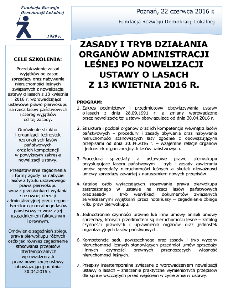 22 czerwca 2016 r. RozwiązaniaPoznań, informatyczne Fundacja Rozwoju Demokracji Lokalnej CELE SZKOLENIA: Przedstawienie zasad i wyjątków od zasad sprzedaży oraz nabywania nieruchomości leśnych związanych z nowelizacją ustawy o lasach z 13 kwietnia 2016 r. wprowadzającą ustawowe prawo pierwokupu na rzecz lasów państwowych i szereg wyjątków od tej zasady. Omówienie struktur i organizacji jednostek regionalnych lasów państwowych oraz ich kompetencji w powyższym zakresie nowelizacji ustawy. Przedstawienie zagadnienia i formy zgody na nabycie lasów z tytułu ustawowego prawa pierwokupu wraz z przesłankami wydania stosownej decyzji administracyjnej przez organ dyrektora generalnego lasów państwowych wraz z jej uzasadnieniem faktycznym i prawnym. Omówienie zagadnień zbiegu prawa pierwokupu różnych osób jak również zagadnienie stosowania przepisów intertemporalnych wprowadzonych przez nowelizację ustawy obowiązującej od dnia 30.04.2016 r. ZASADY I TRYB DZIAŁANIA ORGANÓW ADMINISTRACJI LEŚNEJ PO NOWELIZACJI USTAWY O LASACH Z 13 KWIETNIA 2016 R. PROGRAM: 1. Zakres podmiotowy i przedmiotowy obowiązywania ustawy o lasach z dnia 28.09.1991 r. a zmiany wprowadzone przez nowelizację tej ustawy obowiązujące od dnia 30.04.2016 r. 2. Struktura i podział organów oraz ich kompetencje wewnątrz lasów państwowych – procedury i zasady zbywania oraz nabywania nieruchomości stanowiących lasy zgodnie z obowiązującymi przepisami od dnia 30.04.2016 r. – wzajemne relacje organów i jednostek organizacyjnych lasów państwowych. 3. Procedura sprzedaży a ustawowe prawo pierwokupu przysługujące lasom państwowym – tryb i zasady zawierania umów sprzedaży nieruchomości leśnych a skutek nieważności umowy sprzedaży zawartej z naruszeniem nowych przepisów. 4. Katalog osób wyłączających stosowanie prawa pierwokupu zastrzeżonego w ustawie na rzecz lasów państwowych oraz zasady i tryb weryfikacji dokumentów związanych ze wskazanymi wyjątkami przez notariuszy – zagadnienie zbiegu kilku praw pierwokupu. 5. Jednostronne czynności prawne lub inne umowy aniżeli umowy sprzedaży, których przedmiotem są nieruchomości leśne – katalog czynności prawnych i uprawnienia organów oraz jednostek organizacyjnych lasów państwowych. 6. Kompetencje sądu powszechnego oraz zasady i tryb wyceny nieruchomości leśnych stanowiących przedmiot umów sprzedaży i innych czynności prawnych przenoszących własność nieruchomości leśnych. 7. Przepisy intertemporalne związane z wprowadzeniem nowelizacji ustawy o lasach – znaczenie praktyczne wymienionych przepisów dla spraw wszczętych przed wejściem w życie zmiany ustawy. ADRESACI SZKOLE NIA: pracownicy wszystkich organów administracji rządowej i samorządowej związani z gospodarką nieruchomościami, jednostek organizacyjnych, podmiotów gospodarczych związanych z gospodarką leśną, właścicieli nieruchomości leśnych i rolnych oraz innych osób zajmujących się praktycznym stosowaniem przepisów ustawy o lasach z dnia 28 września 1991 r. DANE DO KONTAKTU: Fundacja Rozwoju Demokracji Lokalnej 40-014 Katowice ul. Mariacka 1 NIP: 522-000-18-95 Tel 32 259 86 73, 32 253 84 09 Fax. 32 259 86 73 w. 22 e-mail: [email protected] OSOBA DO KONTAKTU: Barbara Tekień, tel. 32 206 98 43 w. 25 [email protected] KOD SZKOLENIA MIEJSCE SZKOLENIA: Poznań, Ul. Dąbrowskiego 79 A, Biurowiec OMEGA sale szkoleniowe i konferencyjne, 11-te piętro. Mapkę dojazdu do miejsca szkolenia znajdą Państwo na www.okst.pl/dojazd TERMIN SZKOLENIA: 22 czerwca 2016 r., godz. 10.00 – 15.00 CENA: 359 zł netto/os. Udział w szkoleniu zwolniony z VAT w przypadku finansowania szkolenia ze środków publicznych. Cena zawiera materiały szkoleniowe, zaświadczenie o ukończeniu szkolenia, poczęstunek i serwis kawowy. ZGŁOSZENIA: Wypełnioną kartę zgłoszenia należy przesłać mailem lub faksem lub poprzez formularz na www.okst.p do 17 czerwca 2016 r. Poznań 692/16P/T Nazwa nabywcy (dane do faktury) Adres nabywcy (ulica, nr domu, kod pocztowy, miejscowość) NIP Telefon Email 1. Imię i nazwisko uczestnika, stanowisko 2. Imię i nazwisko uczestnika, stanowisko 3. Imię i nazwisko uczestnika, stanowisko Oświadczam, że szkolenie dla ww. pracowników jest kształceniem zawodowym finansowanym w całości lub co najmniej 70% ze środków publicznych (proszę zaznaczyć właściwe) Członek FORUM (proszę zaznaczyć właściwe) UWAGA Ilość miejsc ograniczona. O udziale w szkoleniu decyduje kolejność zgłoszeń. Zgłoszenie na szkolenie musi zostać potwierdzone przesłaniem do Ośrodka karty zgłoszenia (mail, fax lub formularz na www.okst.pl). Brak pisemnej rezygnacji ze szkolenia najpóźniej na trzy dni robocze przed terminem niezależnie od przyczyn rezygnacji będzie równoznaczny z obciążeniem Państwa należnością za to szkolenie. Płatność należy uregulować min. 3 dni przed szkoleniem (nie dotyczy jednostek budżetowych). Na przelewie prosimy podać nazwę szkolenia lub jego kod. NR RACHUNKU: BPH: 68-10600076-0000321000197618 TAK ☐ NIE ☐ TAK ☐ NIE ☐ PODPIS