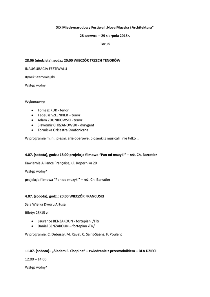 XIX Międzynarodowy Festiwal „Nova Muzyka i Architektura” 28 czerwca – 29 sierpnia 2015r. Toruń 28.06 (niedziela), godz.: 20:00 WIECZÓR TRZECH TENORÓW INAUGURACJA FESTIWALU Rynek Staromiejski Wstęp wolny Wykonawcy: Tomasz KUK - tenor Tadeusz SZLENKIER – tenor Adam ZDUNIKOWSKI - tenor Sławomir CHRZANOWSKI - dyrygent Toruńska Orkiestra Symfoniczna W programie m.in.: pieśni, arie operowe, piosenki z musicali i nie tylko … 4.07. (sobota), godz.: 18:00 projekcja filmowa “Pan od muzyki” – reż. Ch. Barratier Kawiarnia Alliance Française, ul. Kopernika 20 Wstęp wolny* projekcja filmowa “Pan od muzyki” – reż. Ch. Barratier 4.07. (sobota), godz.: 20:00 WIECZÓR FRANCUSKI Sala Wielka Dworu Artusa Bilety: 25/15 zł Laurence BENZAKOUN - fortepian /FR/ Daniel BENZAKOUN – fortepian /FR/ W programie: C. Debussy, M. Ravel, C. Saint-Saëns, F. Poulenc 11.07. (sobota)– „Śladem F. Chopina” – zwiedzanie z przewodnikiem – DLA DZIECI 12:00 – 14:00 Wstęp wolny* 11.07. (sobota), godz. 17:00 – Wystawa „Architektura Muzyki na Świecie” Galeria Tumult Wystawa trwa w dniach: 11.07 – 18.07. w godz.: 12:00 – 18:00 Wstęp wolny 17.07.(piątek), godz.: 19:00 – WIECZÓR FILMOWY Hanza Cafe, ul. Piekary 28 Wstęp wolny* projekcja filmowa „Rytm to jest to!” -reż. T. Grube, E. S. Lansch 18.07.(sobota), godz.: 20:00 – WIECZÓR TEMPUS FANTASY Sala Wielka Dworu Artusa Bilety: 25/15 zł Katarzyna BOREK – fortepian /PL/ Vojto MONTEUR – instrumenty elektroniczne /PL/ Tomek SPERA – VJ W programie: utwory z projektu Tempus Fantasy, m.in.: C. Debussy, S. Prokofiew, F. Liszt, H.M. Górecki, M. Ravel w aranżacjach artystów. 25.07. (sobota) godz. 18:00 WIECZÓR ALPEJSKI Centrum Sztuki Współczesnej „Znaki Czasu” Bilety: 25/15 zł Carlo TORLONTANO /IT/ - róg alpejski Kwartet smyczkowy TOS: Izabela Bogusz – I skrzypce Grzegorz Bogusz – II skrzypce Marta Wroniszewska – altówka Karol Wroniszewski – wiolonczela W programie: G.D’Aquila, A. Iafigliola, L. Mozart, G. Bacewicz, A. Piazzolla + godz.17:00 wystawa “Wszechstronni Rzemieślnicy i Utalentowani Artyści” Spółdzielnia RZUT 1935-1996 w ramach festiwalu TORMIAR. wstęp wolny * 1.08. (sobota), godz.: 20:00 WIECZÓR FIŃSKI Kościół św. Jakuba Apostoła Wstęp wolny Petri Tapio MATTSON – skrzypce barokowe Louna HOSIA – viola da gamba Ilpo LASPAS – klawesyn W programie: utwory mistrzów baroku – J.S. Bach, D. Scarlatti, D. Castello, Ch. Graupner, melodie nordyckie Koncert pod patronatem Konsula Honorowego Finlandii w Toruniu – Tadeusza Pająka. 07.08. (piątek), godz.: 19:00 – WIECZÓR FILMOWY Hanza Cafe, ul. Piekary 28 Wstęp wolny* projekcja filmowa „Kopia Mistrza” – reż. A. Holland 08.08.(sobota) - „Śladem F. Chopina” – zwiedzanie z przewodnikiem – DLA DZIECI 12:00 – 14:00 Wstęp wolny* 8.08. (sobota), godz.: 20:00 WIECZÓR SŁOWACKI Sala Senatu Collegium Maximum UMK Bilety: 25/15 zł Miriam Rodriguez BRÜLLOVÁ /SK/ - gitara Pavol REMENÁR /SK/ - baryton W programie: F. Schubert, W. A. Mozart, utwory kompozytorów słowackich. Koncert pod Honorowym Patronatem Instytutu Słowackiego w Warszawie. 15.08.(sobota), godz.: 19:00 WIECZÓR W PLANETARIUM Centrum Popularyzacji Kosmosu „Planetarium” Wstęp wolny* projekcja filmowa “Chopin the Space Concert” w reż. A. Ustynowicza oraz spotkanie z reżyserem 16.08.(niedziela), godz.: 13:00 – Koncert Gospel Kościół p.w. św. Ducha Wstęp wolny Peter Mante’s Gospel Project /DE/ 21.08.(piątek), godz.: 19:00 WIECZÓR FILMOWY sala kinowa Dworu Artusa Wstęp wolny* Projekcja filmowa – „Wieczna miłość” – reż. B. Rose 22.08.(sobota), godz.: 20:00 WIECZÓR MŁODYCH TALENTÓW Sala Wielka Dworu Artusa Wstęp wolny Pianiści - uczestnicy Piano Paderewski Academy Przemysław FIUGAJSKI – dyrygent Toruńska Orkiestra Symfoniczna 29.08.(sobota), godz.: 20:00 WIECZÓR ORATORYJNY - FINAŁ FESTIWALU Kościół Wniebowzięcia Najświętszej Marii Panny Wstęp wolny Aleksandra KUBAS – KRUK – sopran Nicholas MULROY – tenor Bogdan MAKAL – bas Jerzy BUTRYN – bas Agnieszka FRANKÓW-ŻELAZNY – przygotowanie chóru Chór Narodowego Forum Muzyki z Wrocławia Andrzej KOSENDIAK - dyrygent Toruńska Orkiestra Symfoniczna W programie: J. Haydn – „Stworzenie Świata” * bezpłatne wejściówki do odbioru w kasie Dworu Artusa