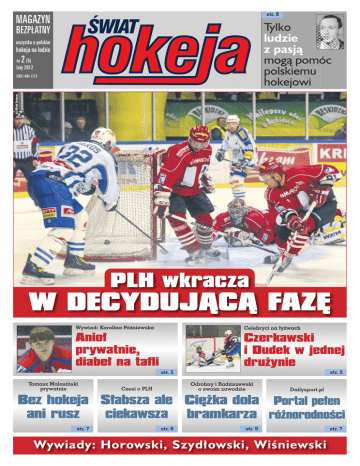 WIAT MAGAZYN BEZPŁATNY wszystko o polskim str. 8 Tylko ludzie z pasją mogą pomóc polskiemu hokejowi hokeju na lodzie 2 nr (5) luty 2012 fot. Witold Saternus ISSN 1895-7773 PLH wkracza W DECYDUJĄCĄ FAZĘ Wywiad: Karolina Późniewska Anioł prywatnie, diabeł na tafli Tomasz Malasiński prywatnie Celebryci na łyżwach str. 5 Czerkawski i Dudek w jednej drużynie str. 3 Odrobny i Radziszewski o swoim zawodzie Czesi o PLH Dailysport.pl Bez hokeja Słabsza ale Ciężka dola Portal pełen ani rusz ciekawsza bramkarza różnorodności str. 7 str. 6 str. 9 Wywiady: Horowski, Szydłowski, Wiśniewski str. 7 2 WIAT MAREK WRÓBEL, napastnik Nesty Karaweli Toruń – Co najbardziej pana zaskoczyło podczas rundy zasadniczej? – Najbardziej zaskakuje mnie zaciętość i gra pięciu pierwszych drużyn. Ich mecze są niezwykle wyrównane, dzieli je tylko parę punktów. Teraz każdy starał się o wejście do pierwszej czwórki, także nie było meczów o nic. – Który sztab trenerski sprawdził się najlepiej? – Myślę, że zmiana trenera w Sanoku miała duże plusy. Jak widać, Ciarko PBS Bank ma ogromną przewagę. Gdy Marek Ziętara przejął drużynę, zaczęła ona odnosić więcej zwycięstw, niż za czasów trenera Milana Jančuški. – Na którym z lodowisk panowała najlepsza atmosfera? – Mnie najlepiej gra się w Tychach. Tam zawsze na mecze przychodzi dużo ludzi. Dzięki temu, atmosfera jest bardzo hokejowa. – Który z zawodników zrobił na panu największe wrażenie? – Z polskich zawodników, jak wiadomo Leszek Laszkiewicz jest liderem klasyfikacji punktowej już od wielu sezonów. Moim zdaniem jest najlepszym, polskim zawodnikiem. W każdym meczu wnosi coś od siebie i daje ComArch Cracovii te najważniejsze bramki. Jeśli na kimś się wzorować w polskiej lidze, to właśnie na nim. Na drugim miejscu postawiłbym na Martina Vozdeckýego z Sanoka. Jest bardzo dobrze wykształcony technicznie, a ponadto bardzo szybki i zwinny, chociaż nie posiada takich warunków fizycznych, jak Laszkiewicz. Pomimo tego, bardzo dużo wnosi do drużyny, jest liderem Sanoka. not. rs PZHL ComArch Cracovia w pełnej mobilizacji Najważniejszy najbliższy mecz Drogą przez mękę można nazwać tegoroczną walkę ComArch Cracovii o pierwszą czwórkę play-off. Drużyna mistrza Polski została przed sezonem znacznie osłabiona. Odeszli zawodnicy mający duży wpływ na postawę zespołu i jego wyniki. Rozstano się m.in. z Łopuskim, Kłysem, Noworytą i Pasiutem, a Kostuch wolał pracę zawodową za oceanem niż grę w PLH. fot. Damian Lizak sonda podsumowanie fazy zasadniczej W ich miejsce sprowadzono perspektywicznego Chmielewskiego, oraz solidnych Bescha, Leniusa i Sucharskiego, a także bardziej jako uzupełnienie składu – Kulika. Biorąc pod uwagę te zmiany kadrowe tylko najwięksi optymiści byli spokojni o grę „Pasów” w Ekstralidze. Rywale w walce o czołowe lokaty, jak Sanok, Tychy, Oświęcim i Jastrzębie, nie tylko utrzymały składy z poprzedniego sezonu, ale wręcz je wzmocniły. Trener Rudolf Roháćek zapewniał przed startem rozgrywek, że drużyna myśli tylko o grze o najwyższe cele, ale już pierwsze mecze pokazały, iż załapanie się do pierwszej czwór- ki będzie trzeba okupić ogromnym wysiłkiem. W trakcie sezonu udało się zakontraktować Immonena, świetnego obrońcę z Finlandii oraz Horowskiego, Kowalówkę, Cieślickiego i Postka, którzy stanowią uzupełnienie składu. Kibice liczyli, że grudniowa przerwa w rozgrywkach ogłoszona ze względu na mecze reprezentacji, pozytywnie wpłynie na zawodników w białoczerwonych koszulkach. Po ćwierćfinałowym zwycięstwie w Pucharze Polski nad Tychami, na drodze po to trofeum stanął jednak Sanok. – Mieliśmy osłabienia kadrowe, ale mamy i nowe nabytki. Inne zespoły jeszcze bardziej się wzmoc- hokej – Przed telewizorem czy nawet na trybunach przy lodowisku, człowiek nie zdaje sobie sprawy, jak trudny i siłowy jest hokej – przyznaje Michał Wiśniewski, lider zespołu Ich Troje. kocham Wiśniewski na lodzie WIAT Redakcja: Dawid Góra (red. nacz.), Radosław Sznajder Projekt graficzny: Ryszard Szokalski Wydawnictwo nie ponosi odpowiedzialności za treść zamieszczonych ogłoszeń i reklam. Adres do korespondencji: 32-020 Wieliczka, ul. Limanowskiego 7, tel. 12 431 00 03 [email protected] fot. arch. artysty Bilety już w sprzedaży Ruszyła internetowa sprzedaż biletów na Mistrzostwa Świata Dywizji IB, które odbędą się w dniach 15-21 kwietnia br. w Krynicy-Zdroju. Kibice będą mogli zakupić bilety na poszczególne mecze (10 zł – ulgowe; 20 zł – normalne), karnety całodzienne (30 zł) i karnet na wszystkie mecze krynickiego turnieju (100 zł). Przypominamy, że pod Górą Parkową rywalami Polaków będą: Litwini, Holendrzy, Rumuni, Koreańczycy i Australijczycy. Tylko najlepszy zespół awansuje do Dywizji IA. Rezerwacje i szczegóły dot. pakietów na stronie internetowej www.kupbilet.pl. niły, a w tabeli są za nami. Liga jest bardzo wyrównana. Ja twierdzę, że właściwe rozgrywki, tak naprawdę zaczną się dopiero 6 stycznia. Każdy z pierwszych pięciu zespołów może wygrać z każdym. Mam nadzieję, że podczas tej ostatniej dwutygodniowej przerwy udało nam skompensować niedotrenowanie i w styczniu wszystko będzie już funkcjonować tak, jak powinno – uspokajał trener Roháćek. Obecnie, „Pasy” nadal przeplatają dobre mecze słabymi. Porażki z Aksam Unią, a zwłaszcza niespodzianka sezonu, czyli przegrana z MMKS Podhale znacznie skomplikowała sytuację ComArch Cracovii w tabeli. – Nie wiem co się z nami stało. Sami chcielibyśmy znać odpowiedź na to pytanie, bo wtedy mielibyśmy kilka punktów więcej – mówił po feralnym meczu Piotr Sarnik, napastnik „Pasów”. Czwórkę drużyn walczących o dobrą pozycję przed rozgrywkami play-off dzieliła minimalna różnica punktowa i każda kolejka mogła mocno zmieniać układ tabeli. W duż