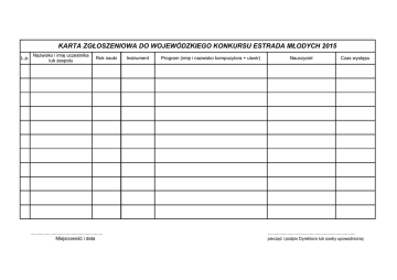 KARTA ZGŁOSZENIOWA DO WOJEWÓDZKIEGO KONKURSU ESTRADA MŁODYCH 2015 L.p. Nazwisko i imię uczestnika lub zespołu Rok nauki ....................................................... Miejscowość i data Instrument Program (imię i nazwisko kompozytora + utwór) Nauczyciel Czas występu ................................................................... pieczęć i podpis Dyrektora lub osoby upoważnionej