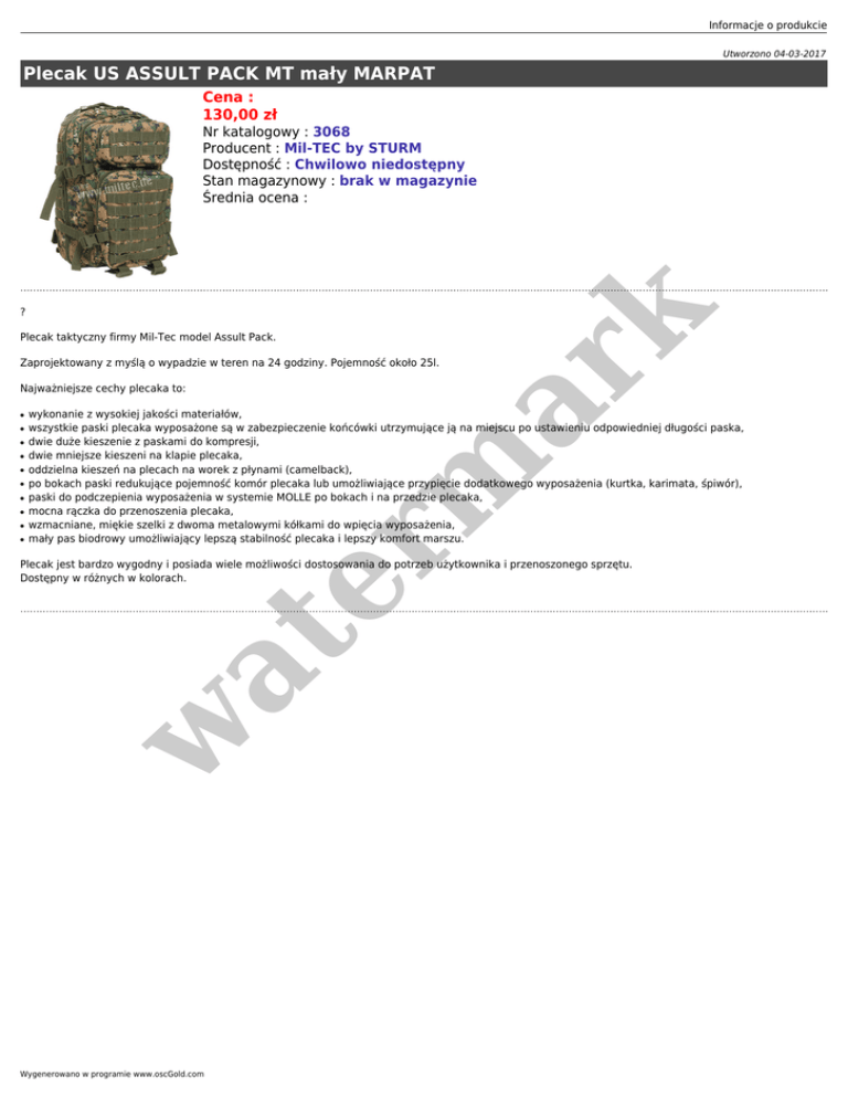 Informacje o produkcie Utworzono 04-03-2017 Plecak US ASSULT PACK MT mały MARPAT Cena : 130,00 zł ? er m ar k Nr katalogowy : 3068 Producent : Mil-TEC by STURM Dostępność : Chwilowo niedostępny Stan magazynowy : brak w magazynie Średnia ocena : Plecak taktyczny firmy Mil-Tec model Assult Pack. Zaprojektowany z myślą o wypadzie w teren na 24 godziny. Pojemność około 25l. Najważniejsze cechy plecaka to: ● ● ● ● ● ● ● ● ● ● wykonanie z wysokiej jakości materiałów, wszystkie paski plecaka wyposażone są w zabezpieczenie końcówki utrzymujące ją na miejscu po ustawieniu odpowiedniej długości paska, dwie duże kieszenie z paskami do kompresji, dwie mniejsze kieszeni na klapie plecaka, oddzielna kieszeń na plecach na worek z płynami (camelback), po bokach paski redukujące pojemność komór plecaka lub umożliwiające przypięcie dodatkowego wyposażenia (kurtka, karimata, śpiwór), paski do podczepienia wyposażenia w systemie MOLLE po bokach i na przedzie plecaka, mocna rączka do przenoszenia plecaka, wzmacniane, miękie szelki z dwoma metalowymi kółkami do wpięcia wyposażenia, mały pas biodrowy umożliwiający lepszą stabilność plecaka i lepszy komfort marszu. w at Plecak jest bardzo wygodny i posiada wiele możliwości dostosowania do potrzeb użytkownika i przenoszonego sprzętu. Dostępny w różnych w kolorach. Wygenerowano w programie www.oscGold.com