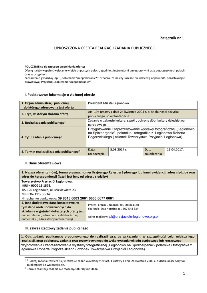 Załącznik nr 1 UPROSZCZONA OFERTA REALIZACJI ZADANIA PUBLICZNEGO POUCZENIE co do sposobu wypełniania oferty: Ofertę należy wypełnić wyłącznie w białych pustych polach, zgodnie z instrukcjami umieszczonymi przy poszczególnych polach oraz w przypisach. Zaznaczenie gwiazdką, np.: „pobieranie*/niepobieranie*” oznacza, że należy skreślić niewłaściwą odpowiedź, pozostawiając prawidłową. Przykład: „pobieranie*/niepobieranie*”. I. Podstawowe informacje o złożonej ofercie 1. Organ administracji publicznej, do którego adresowana jest oferta 2. Tryb, w którym złożono ofertę 3. Rodzaj zadania publicznego1) 4. Tytuł zadania publicznego 5. Termin realizacji zadania publicznego2) Prezydent Miasta Legionowo Art. 19a ustawy z dnia 24 kwietnia 2003 r. o działalności pożytku publicznego i o wolontariacie Zadanie w zakresie kultury, sztuki , ochrony dóbr kultury dziedzictwa narodowego Przygotowanie i zaprezentowanie wystawy fotograficznej „Legionowo na Spitzbergenie”- polarnika i fotografika z Legionowa Roberta Pogorzelskiego ( członek Towarzystwa Przyjaciół Legionowa). Data rozpoczęcia 5.03.2017 r. Data zakończenia 15.04.2017. II. Dane oferenta (-ów) 1. Nazwa oferenta (-ów), forma prawna, numer Krajowego Rejestru Sądowego lub innej ewidencji, adres siedziby oraz adres do korespondencji (jeżeli jest inny od adresu siedziby) Towarzystwo Przyjaciół Legionowa, KRS – 0000 19 1579, 05-120 Legionowo, ul. Mickiewicza 23 NIP-536- 191- 56-34 Nr rachunku bankowego: 39 8013 0003 2001 0000 0677 0001 2. Inne dodatkowe dane kontaktowe, w Prezes- Erazm Domański tel. 608861140 tym dane osób upoważnionych do Skarbnik- Ewa Narożna tel. 507 548 334 składania wyjaśnień dotyczących oferty (np. numer telefonu, adres poczty elektronicznej, numer faksu, adres strony internetowej) Adres mailowy: [email protected] III. Zakres rzeczowy zadania publicznego 1. Opis zadania publicznego proponowanego do realizacji wraz ze wskazaniem, w szczególności celu, miejsca jego realizacji, grup odbiorców zadania oraz przewidywanego do wykorzystania wkładu osobowego lub rzeczowego Przygotowanie i zaprezentowanie wystawy fotograficznej „Legionowo na Spitzbergenie”- polarnika i fotografika z Legionowa Roberta Pogorzelskiego ( członek Towarzystwa Przyjaciół Legionowa). 1 ) Rodzaj zadania zawiera się w zakresie zadań określonych w art. 4 ustawy z dnia 24 kwietnia 2003 r. o działalności pożytku publicznego i o wolontariacie. 2) Termin realizacji zadania nie może być dłuższy niż 90 dni. 1 Autor wystawy przebywał przez rok czasu na polarnej misji badawczej, która była kolejnym zamierzeniem Polski w badania polane zapoczątkowane I Polska Wyprawą Polarna zorganizowaną w 1932 r. w Legionowie i Warszawie przez Czesława Centkiewicza. Autor wystawy realizując zadania misji polarnej także popularyzował nasze miasto i umieścił flagę Legionowa na lodowcu. Organizacja wystawy i spotkania wpisuje się w program wspołpracy Gminy Legionowo z NGO na 2017 r. i dotyczy kultywowania i popularyzowania wiedzy oraz tradycji związanych z dziejami miasta i regionu, zasłużonymi osobami dla Legionowa a także ważnymi rocznicami regionalnymi i państwowymi. Organizacja wystawy i spotkanie z polarnikiem inaugurować będzie cykl zamierzeń TPL służących upamiętnieniu I Polskiej Wyprawy Polarnej, Aliny i Czesława Centkiewiczów- Honorowych Obywateli Miasta Legionowo, w których znajdować się będzie konkurs w szkołach, spotkania i w szkołach, wystawa w Muzeum , prezentacja na festiwalu Nauki w Jabłonnie oraz ustawienie tablicy informacyjnej przy Rondzie Aliny i Czesława Centkiewiczów w Legionowie Przedsięwzięcie nosi duży ładunek promocyjny dla miasta i może być jest wykorzystywane przy budowaniu tożsamości lokalnej i większego utożsamiania się mieszkańców z naszą „Małą Ojczyzną” – Legionowem- miejscowością o wielorakich wymiarach historycznych i współczesnych . 2. Zakładane rezultaty realizacji zadania publicznego Wystawa dedykowana jest głownie do młodzieży szkolnej oraz mieszkańców naszego miasta na bazie przypomnienia I Polskiej Wyprawy Polarnej, która w 1932 wyruszyła z Legionowa, postaci Aliny i Czesława Centkiewiczów znakomitych polskich pisarzy i polarników, tak szczególnie związanych z Legionowem. Wystawa zawierać będzie 20 fotogramów o odpowiedniej szacie graficznej, które będą eksponowane na wystawie w Ratuszu w dniach 31.03.2017r. - 15.04.2017r. a następnie w rożnych miejscach w Legionowie m In. w szkołach, Muzeum, na „Dniach Legionowa” i Festiwalu Nauki w Jabłonnie Wystawa służyć będzie promocji historii Legionowa i jej honorowych Obywateli – Aliny i Czesława Centkiewiczów. Wystawa zaprezentuje efekty wizualne polskiej wyprawy polarnej na Spitzbergen zorganizowanej w z udziałem legionowianina – Roberta Pogorzelskiego w 2015-2016 r. na której znalazły się też akcenty Legionowskie ( umieszczenie flagi Legionowa na lodowcu, przekazanie do biblioteki polskiej bazy naukowej publikacji TPL ”Wyspa mgieł i wichrów”- reprintu wydanego w Legionowie w 2012 r. w ramach Roku Cetkiewiczowskiego organizowanego w Legionowie, korespondencja autora wystawy z młodzieżą szkolną SP nr 8 ) Autor wystawy przygotowuje ją i udostępnia nieodpłatnie jako członek Towarzystwa Przyjaciół Legionowa. Przygotowaniem materiałów promocyjnych zajmie się znana plastyczka z Legionowa Jolanta Drozd we współpracy z dr. hab. Jackiem Szczepańskim – dyrektorem Muzeum Historycznego w Legionowie. Wykonaniem wystawy zajmie się legionowska firma reklamowa Rezultatem realizacji zadania publicznego jest przeprowadzenie ciekawego przedsięwzięcia kulturalnego, przyczyniającego się do budowania pozytywnych więzi lokalnych, podniesienia poziomu wiedzy w zakresie historii lokalnej, kształtowania lokalnej społeczności. Przewidujemy udział w spotkaniu i obejrzeniu wystawy kilkuset mieszkańców miasta i 