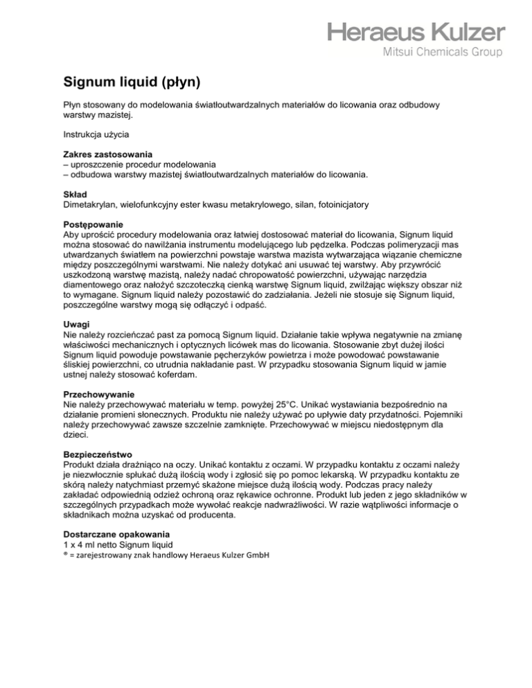 Signum liquid (płyn) Płyn stosowany do modelowania światłoutwardzalnych materiałów do licowania oraz odbudowy warstwy mazistej. Instrukcja użycia Zakres zastosowania – uproszczenie procedur modelowania – odbudowa warstwy mazistej światłoutwardzalnych materiałów do licowania. Skład Dimetakrylan, wielofunkcyjny ester kwasu metakrylowego, silan, fotoinicjatory Postępowanie Aby uprościć procedury modelowania oraz łatwiej dostosować materiał do licowania, Signum liquid można stosować do nawilżania instrumentu modelującego lub pędzelka. Podczas polimeryzacji mas utwardzanych światłem na powierzchni powstaje warstwa mazista wytwarzająca wiązanie chemiczne między poszczególnymi warstwami. Nie należy dotykać ani usuwać tej warstwy. Aby przywrócić uszkodzoną warstwę mazistą, należy nadać chropowatość powierzchni, używając narzędzia diamentowego oraz nałożyć szczoteczką cienką warstwę Signum liquid, zwilżając większy obszar niż to wymagane. Signum liquid należy pozostawić do zadziałania. Jeżeli nie stosuje się Signum liquid, poszczególne warstwy mogą się odłączyć i odpaść. Uwagi Nie należy rozcieńczać past za pomocą Signum liquid. Działanie takie wpływa negatywnie na zmianę właściwości mechanicznych i optycznych licówek mas do licowania. Stosowanie zbyt dużej ilości Signum liquid powoduje powstawanie pęcherzyków powietrza i może powodować powstawanie śliskiej powierzchni, co utrudnia nakładanie past. W przypadku stosowania Signum liquid w jamie ustnej należy stosować koferdam. Przechowywanie Nie należy przechowywać materiału w temp. powyżej 25°C. Unikać wystawiania bezpośrednio na działanie promieni słonecznych. Produktu nie należy używać po upływie daty przydatności. Pojemniki należy przechowywać zawsze szczelnie zamknięte. Przechowywać w miejscu niedostępnym dla dzieci. Bezpieczeństwo Produkt działa drażniąco na oczy. Unikać kontaktu z oczami. W przypadku kontaktu z oczami należy je niezwłocznie spłukać dużą ilością wody i zgłosić się po pomoc lekarską. W przypadku kontaktu ze skórą należy natychmiast przemyć skażone miejsce dużą ilością wody. Podczas pracy należy zakładać odpowiednią odzież ochroną oraz rękawice ochronne. Produkt lub jeden z jego składników w szczególnych przypadkach może wywołać reakcje nadwrażliwości. W razie wątpliwości informacje o składnikach można uzyskać od producenta. Dostarczane opakowania 1 x 4 ml netto Signum liquid ® = zarejestrowany znak handlowy Heraeus Kulzer GmbH Zastrzeżenie: Nasze rady, sugestie i zalecenia dotyczące tego produktu udzielane są w dobrej wierze i oparte są na naszych własnych testach, a także zgodne z naszą obecną wiedzą. Nie należy ich jednak traktować jako gwarancji użycia. Dotyczy to również produktów innych producentów lub praw własności stron trzecich. Nie zwalnia to użytkownika z obowiązku przetestowania dostarczonych produktów i zdecydowania, czy nadają się do zamierzonego użycia. Ostateczne stosowanie i korzystanie z tych produktów przebiega poza naszą kontrolą i dlatego odbywa się na wyłączną odpowiedzialność użytkownika. W przypadku wykazania, że nasz produkt został dostarczony wadliwy lub uszkodzony, nasza odpowiedzialność za produkt ogranicza się do wymiany wartości dostarczonych i stosowanych towarów. Oczywiście, dostarczamy produkty stale wysokiej jakości zgodne z naszymi normami jakości i ogólnymi warunkami sprzedaży i dostawy. Biuro w Polsce: ul. I Dywizji Pancernej 45, pok. 118 43-300 Bielsko-Biała +48 (33) 496 35 39 [email protected] Dane producenta: Heraeus Kulzer GmbH Grüner Weg 11 63450 Hanau (Germany) Country Manager: Jarosław Bruszewski +48 600 047 209 [email protected] [email protected] www.heraeus-kulzer.com