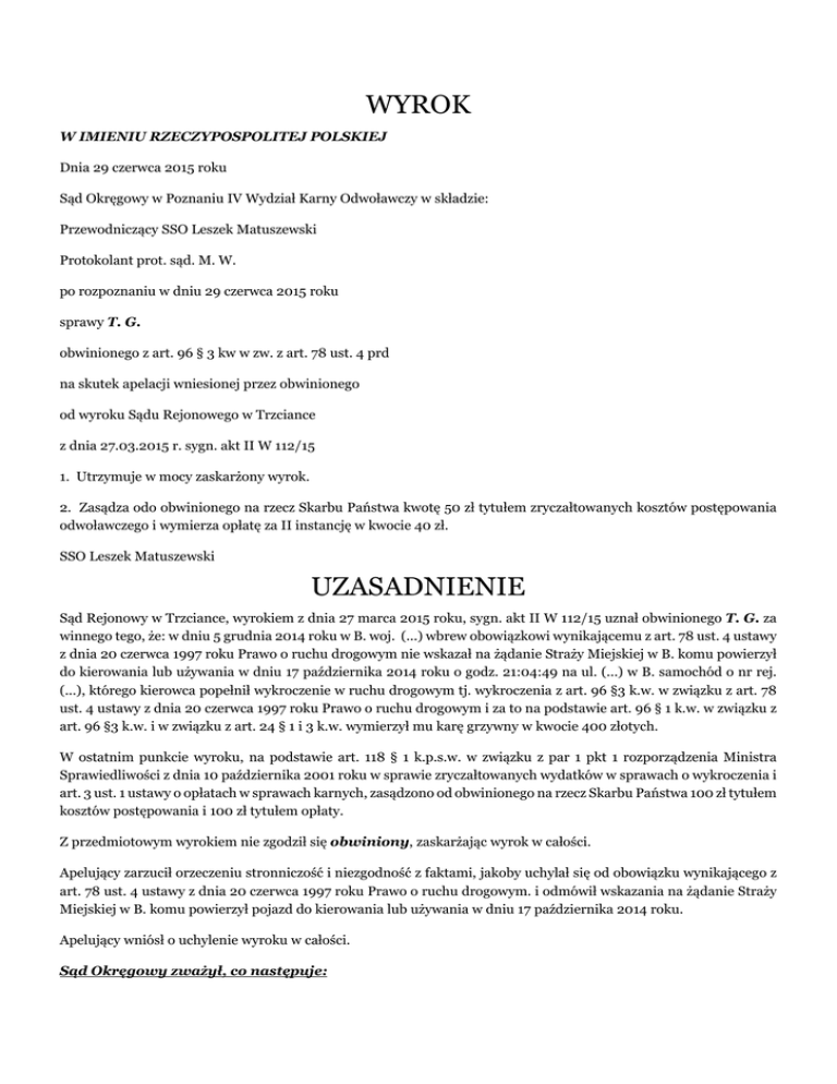 WYROK W IMIENIU RZECZYPOSPOLITEJ POLSKIEJ Dnia 29 czerwca 2015 roku Sąd Okręgowy w Poznaniu IV Wydział Karny Odwoławczy w składzie: Przewodniczący SSO Leszek Matuszewski Protokolant prot. sąd. M. W. po rozpoznaniu w dniu 29 czerwca 2015 roku sprawy T. G. obwinionego z art. 96 § 3 kw w zw. z art. 78 ust. 4 prd na skutek apelacji wniesionej przez obwinionego od wyroku Sądu Rejonowego w Trzciance z dnia 27.03.2015 r. sygn. akt II W 112/15 1. Utrzymuje w mocy zaskarżony wyrok. 2. Zasądza odo obwinionego na rzecz Skarbu Państwa kwotę 50 zł tytułem zryczałtowanych kosztów postępowania odwoławczego i wymierza opłatę za II instancję w kwocie 40 zł. SSO Leszek Matuszewski UZASADNIENIE Sąd Rejonowy w Trzciance, wyrokiem z dnia 27 marca 2015 roku, sygn. akt II W 112/15 uznał obwinionego T. G. za winnego tego, że: w dniu 5 grudnia 2014 roku w B. woj. (...) wbrew obowiązkowi wynikającemu z art. 78 ust. 4 ustawy z dnia 20 czerwca 1997 roku Prawo o ruchu drogowym nie wskazał na żądanie Straży Miejskiej w B. komu powierzył do kierowania lub używania w dniu 17 października 2014 roku o godz. 21:04:49 na ul. (...) w B. samochód o nr rej. (...), którego kierowca popełnił wykroczenie w ruchu drogowym tj. wykroczenia z art. 96 §3 k.w. w związku z art. 78 ust. 4 ustawy z dnia 20 czerwca 1997 roku Prawo o ruchu drogowym i za to na podstawie art. 96 § 1 k.w. w związku z art. 96 §3 k.w. i w związku z art. 24 § 1 i 3 k.w. wymierzył mu karę grzywny w kwocie 400 złotych. W ostatnim punkcie wyroku, na podstawie art. 118 § 1 k.p.s.w. w związku z par 1 pkt 1 rozporządzenia Ministra Sprawiedliwości z dnia 10 października 2001 roku w sprawie zryczałtowanych wydatków w sprawach o wykroczenia i art. 3 ust. 1 ustawy o opłatach w sprawach karnych, zasądzono od obwinionego na rzecz Skarbu Państwa 100 zł tytułem kosztów postępowania i 100 zł tytułem opłaty. Z przedmiotowym wyrokiem nie zgodził się obwiniony, zaskarżając wyrok w całości. Apelujący zarzucił orzeczeniu stronniczość i niezgodność z faktami, jakoby uchylał się od obowiązku wynikającego z art. 78 ust. 4 ustawy z dnia 20 czerwca 1997 roku Prawo o ruchu drogowym. i odmówił wskazania na żądanie Straży Miejskiej w B. komu powierzył pojazd do kierowania lub używania w dniu 17 października 2014 roku. Apelujący wniósł o uchylenie wyroku w całości. Sąd Okręgowy zważył, co następuje: Apelacja obwinionego T. G. nie zasługuje na uwzględnienie. Przede wszystkim należy podkreślić, ze Sąd I instancji poczynił prawidłowe ustalenia faktyczne. Ocena materiału dowodowego dokonana przez Sąd I instancji nie wykazuje błędów logicznych i nie wykracza poza ramy swobodnej oceny dowodów, chronionej art. 7 k.p.k. w związku z art.8 k.p.s.w. Przedmiotem rozważań organu orzekającego były dowody zarówno na korzyść podsądnego, jak i wszelkie dowody im przeciwne i wszystkie one zostały ocenione zgodnie z zasadami logicznego rozumowania, wskazań wiedzy i doświadczenia życiowego, z uwzględnieniem zasad wynikających z art. 410 k.p.k. w związku z art.82 § 1 k.p.s.w. Kwestionowanie przez skarżącego ustaleń faktycznych jest oczywiście nietrafne. Sąd Okręgowy przypomina, że błąd w ustaleniach faktycznych może wynikać bądź to z niepełności postępowania dowodowego, bądź z przekroczenia granic swobodnej oceny dowodów. Może być on wynikiem nieznajomości określonych dowodów albo nieprzestrzegania dyrektyw obowiązujących przy ich ocenie. Zarzut błędu w ustaleniach faktycznych nie może natomiast sprowadzać się do samej tylko odmiennej oceny materiału dowodowego przez skarżącego, lecz powinien polegać na wykazaniu, jakich w tym zakresie uchybień w świetle wskazań wiedzy i doświadczenia życiowego dopuścił się Sąd Rejonowy. Zgodnie z zasadą swobodnej oceny dowodów, Sąd orzekający, rozstrzygając o winie bądź niewinności obwinionego kieruje się własnym wewnętrznym przekonaniem, nie skrępowanym żadnymi ustawowymi regułami dowodowymi. Przekonanie to tak długo pozostaje pod ochroną art. 7 k.p.k. w związku z art. 8 k.p.s.w., dopóki nie zostanie wykazane, iż Sąd I instancji oparł swe przekonanie o winie albo niewinności obwinionego, bądź na okolicznościach nie ujawnionych w toku postępowania sądowego, bądź też ujawnionych w toku przewodu sądowego, ale ocenionych w sposób sprzeczny ze wskazaniami wiedzy i doświadczeniem życiowym. Takie okoliczności zaś w niniejszej sprawie nie zachodzą. Autor apelacji nie zgadzając się z ustaleniami Sądu Rejonowego, nie wykazał w sposób przekonywujący, poza odmienną i co istotne- jednostronną interpretacją zgromadzonego materiału dowodowego, na jakiej podstawie ustalenia Sądu Rejonowego uważać należy za niesłuszne. Wywody zawarte w złożonej przez niego apelacji mają charakter ewidentnie polemiczny, stojąc w rażącej opozycji do należycie umotywowanego stanowiska organu orzekającego, przedstawionego w prawidłowo sporządzonym uzasadnieniu i jako takie nie mogły zyskać aprobaty Sądu odwoławczego. Zdaniem Sądu odwoławczego, wina i sprawstwo obwinionego nie budzą żadnych wątpliwości. Ocena ujawnionych dowodów dokonana przez Sąd I instancji respektuje zasadę swobodnej oceny dowodów. Sąd Rejonowy prawidłowo ocenił oświadczenia dowodowe podsądnego, w których zasłaniał się niewiedzą, co do osoby, która prowadziła należący do niego pojazd w dniu 17 października 2014 roku. Organ wyrokujący słusznie uznał je wyłącznie za realizację linii obrony. Tego rozumowania nie zmieniają okoliczności przywołane w apelacji. Zdaniem Sądu Okręgowego, obwiniony był w stanie wskazać, kto prowadził pojazd w czasie wskazanym przez organ żądający udzielenia informacji. Co istotne, podsądny oświadczył w toku przewodu sądowego, że auto nie zostało skradzione, ani zabrane wbrew jego woli. Tego rozumowania nie zmienia to, że samochód móg