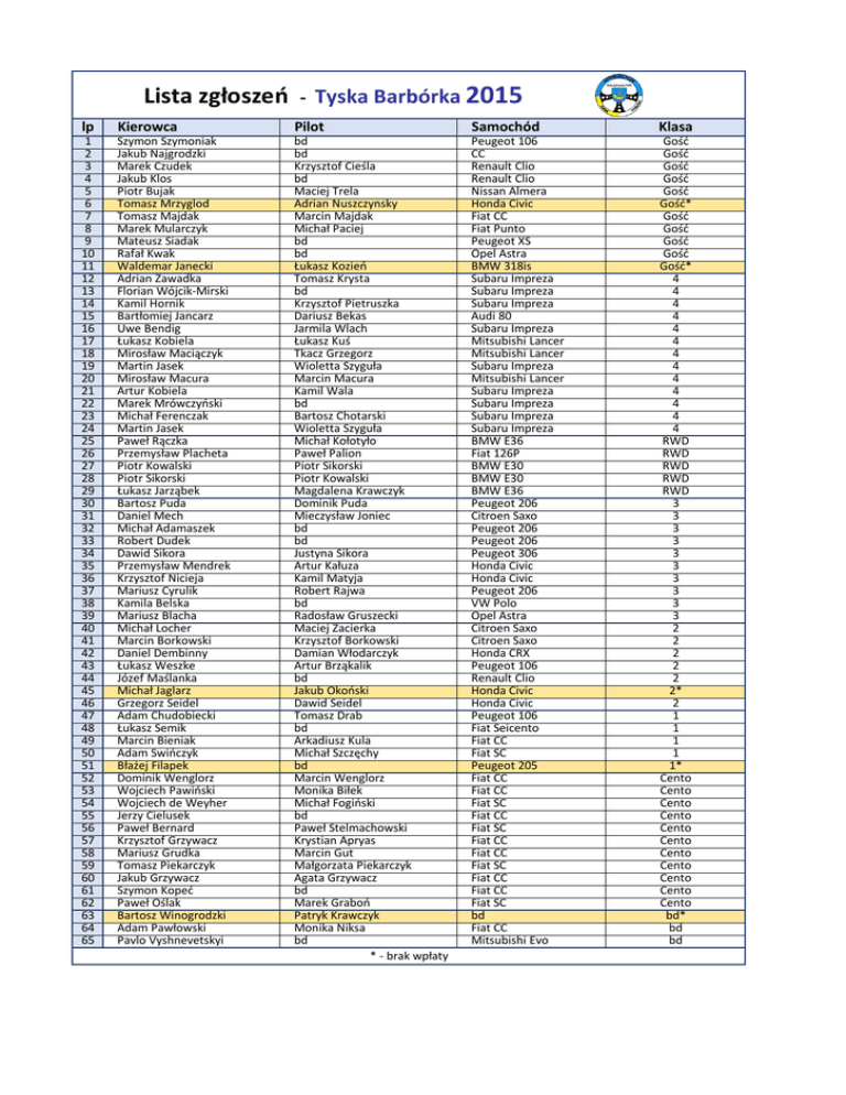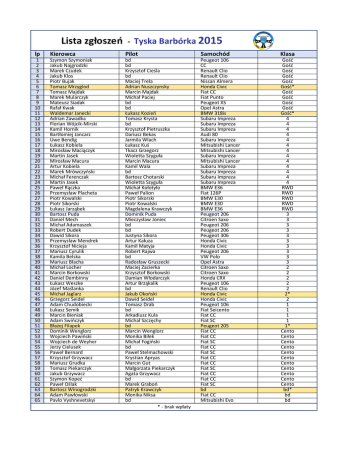 Lista zgłoszeń - Tyska Barbórka 2015 lp Kierowca Pilot Samochód Klasa 1 2 3 4 5 6 7 8 9 10 11 12 13 14 15 16 17 18 19 20 21 22 23 24 25 26 27 28 29 30 31 32 33 34 35 36 37 38 39 40 41 42 43 44 45 46 47 48 49 50 51 52 53 54 55 56 57 58 59 60 61 62 63 64 65 Szymon Szymoniak Jakub Najgrodzki Marek Czudek Jakub Klos Piotr Bujak Tomasz Mrzyglod Tomasz Majdak Marek Mularczyk Mateusz Siadak Rafał Kwak Waldemar Janecki Adrian Zawadka Florian Wójcik-Mirski Kamil Hornik Bartłomiej Jancarz Uwe Bendig Łukasz Kobiela Mirosław Maciączyk Martin Jasek Mirosław Macura Artur Kobiela Marek Mrówczyński Michał Ferenczak Martin Jasek Paweł Rączka Przemysław Placheta Piotr Kowalski Piotr Sikorski Łukasz Jarząbek Bartosz Puda Daniel Mech Michał Adamaszek Robert Dudek Dawid Sikora Przemysław Mendrek Krzysztof Nicieja Mariusz Cyrulik Kamila Belska Mariusz Blacha Michał Locher Marcin Borkowski Daniel Dembinny Łukasz Weszke Józef Maślanka Michał Jaglarz Grzegorz Seidel Adam Chudobiecki Łukasz Semik Marcin Bieniak Adam Świńczyk Błażej Filapek Dominik Wenglorz Wojciech Pawiński Wojciech de Weyher Jerzy Cielusek Paweł Bernard Krzysztof Grzywacz Mariusz Grudka Tomasz Piekarczyk Jakub Grzywacz Szymon Kopeć Paweł Oślak Bartosz Winogrodzki Adam Pawłowski Pavlo Vyshnevetskyi bd bd Krzysztof Cieśla bd Maciej Trela Adrian Nuszczynsky Marcin Majdak Michał Paciej bd bd Łukasz Kozień Tomasz Krysta bd Krzysztof Pietruszka Dariusz Bekas Jarmila Wlach Łukasz Kuś Tkacz Grzegorz Wioletta Szyguła Marcin Macura Kamil Wala bd Bartosz Chotarski Wioletta Szyguła Michał Kołotyło Paweł Palion Piotr Sikorski Piotr Kowalski Magdalena Krawczyk Dominik Puda Mieczysław Joniec bd bd Justyna Sikora Artur Kałuza Kamil Matyja Robert Rajwa bd Radosław Gruszecki Maciej Zacierka Krzysztof Borkowski Damian Włodarczyk Artur Brząkalik bd Jakub Okoński Dawid Seidel Tomasz Drab bd Arkadiusz Kula Michał Szczęchy bd Marcin Wenglorz Monika Biłek Michał Fogiński bd Paweł Stelmachowski Krystian Apryas Marcin Gut Małgorzata Piekarczyk Agata Grzywacz bd Marek Graboń Patryk Krawczyk Monika Niksa bd * - brak wpłaty Peugeot 106 CC Renault Clio Renault Clio Nissan Almera Honda Civic Fiat CC Fiat Punto Peugeot XS Opel Astra BMW 318is Subaru Impreza Subaru Impreza Subaru Impreza Audi 80 Subaru Impreza Mitsubishi Lancer Mitsubishi Lancer Subaru Impreza Mitsubishi Lancer Subaru Impreza Subaru Impreza Subaru Impreza Subaru Impreza BMW E36 Fiat 126P BMW E30 BMW E30 BMW E36 Peugeot 206 Citroen Saxo Peugeot 206 Peugeot 206 Peugeot 306 Honda Civic Honda Civic Peugeot 206 VW Polo Opel Astra Citroen Saxo Citroen Saxo Honda CRX Peugeot 106 Renault Clio Honda Civic Honda Civic Peugeot 106 Fiat Seicento Fiat CC Fiat SC Peugeot 205 Fiat CC Fiat CC Fiat SC Fiat CC Fiat SC Fiat CC Fiat CC Fiat SC Fiat CC Fiat CC Fiat SC bd Fiat CC Mitsubishi Evo Gość Gość Gość Gość Gość Gość* Gość Gość Gość Gość Gość* 4 4 4 4 4 4 4 4 4 4 4 4 4 RWD RWD RWD RWD RWD 3 3 3 3 3 3 3 3 3 3 2 2 2 2 2 2* 2 1 1 1 1 1* Cento Cento Cento Cento Cento Cento Cento Cento Cento Cento Cento bd* bd bd