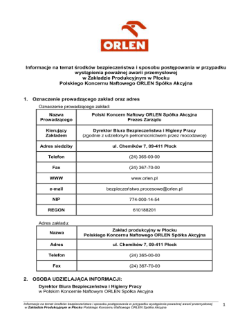 Informacje na temat środków bezpieczeństwa i sposobu postępowania w przypadku wystąpienia poważnej awarii przemysłowej w Zakładzie Produkcyjnym w Płocku Polskiego Koncernu Naftowego ORLEN Spółka Akcyjna 1. Oznaczenie prowadzącego zakład oraz adres Oznaczenie prowadzącego zakład: Nazwa Prowadzącego Polski Koncern Naftowy ORLEN Spółka Akcyjna Prezes Zarządu Kierujący Zakładem Dyrektor Biura Bezpieczeństwa i Higieny Pracy (zgodnie z udzielonym pełnomocnictwem przez mocodawcę) Adres siedziby ul. Chemików 7, 09-411 Płock Telefon (24) 365-00-00 Fax (24) 367-70-00 WWW www.orlen.pl e-mail bezpieczeń[email protected] NIP 774-000-14-54 REGON 610188201 Adres zakładu: Nazwa Zakład produkcyjny w Płocku Polskiego Koncernu Naftowego ORLEN Spółka Akcyjna Adres ul. Chemików 7, 09-411 Płock Telefon (24) 365-00-00 Fax (24) 367-70-00 2. OSOBA UDZIELAJĄCA INFORMACJI: Dyrektor Biura Bezpieczeństwa i Higieny Pracy w Polskim Koncernie Naftowym ORLEN Spółka Akcyjna Informacje na temat środków bezpieczeństwa i sposobu postępowania w przypadku wystąpienia poważnej awarii przemysłowej w Zakładzie Produkcyjnym w Płocku Polskiego Koncernu Naftowego ORLEN Spółka Akcyjna 1 3. Potwierdzenie, że zakład podlega przepisom w zakresie przeciwdziałania awariom przemysłowym Zakład Produkcyjny w Płocku PKN ORLEN S.A. jest zakładem o dużym ryzyku wystąpienia poważnej awarii przemysłowej (ZDR) zgodnie z klasyfikacją dokonaną na podstawie rozporządzenia Ministra Gospodarki w sprawie rodzajów i ilości substancji niebezpiecznych, których znajdowanie się w zakładzie decyduje o zaliczeniu go do zakładu o zwiększonym ryzyku albo zakładu o dużym ryzyku wystąpienia poważnej awarii przemysłowej (Dz. U. z 2013, poz. 1479). Prowadzący zakład dokonał zgłoszenia właściwym organom zgodnie z art. 250 ust. 1 ustawy z dnia 27 kwietnia 2001 r. – Prawo ochrony środowiska (Dz. U. z 2013 r., poz 1232, z późn. zm.) i przekazał im opracowany program zapobiegania awariom. 4. Charakter działalności w Zakładzie Produkcyjnym w Płocku PKN ORLEN S.A. prowadzi działalność w różnym zakresie – głównie produkcji paliw silnikowych w wyniku głębokiego przerobu ropy naftowej oraz produkcji szerokiego asortymentu produktów i półproduktów ropopochodnych (rafineryjnych i petrochemicznych). W Zakładzie Produkcyjnym w Płocku prowadzona jest następująca działalność: - przerób ropy naftowej oraz wytwarzanie produktów i półproduktów ropopochodnych (rafineryjnych i petrochemicznych), - magazynowanie, składowanie i przechowywanie ropy naftowej i paliw płynnych oraz tworzenie i utrzymywanie zapasów paliw, na zasadach określonych właściwymi przepisami, - wytwarzanie, przesyłanie oraz obrót energią cieplną i elektryczną a także: - transport rurociągowy substancji i mieszanin – wewnętrzny oraz do odbiorców znajdujących poza terenem zakładu produkcyjnego w Płocku (np. Terminal Paliw w Mościskach, Zakład PTA we Włocławku, Anwil S.A. we Włocławku), - transport drogowy i kolejowy substancji, - produkcja energii i pary w zakładowej EC. Ponadto w Zakładzie produkcyjnym dokonywane jest: - oczyszczanie substancji ropopochodnych w Centralnej Oczyszczalni Ścieków - utylizacja odpadów przemysłowych powstałych na terenie rafinerii 5. Rodzaje substancji Produkcyjnego niebezpiecznych występujących na terenie Zakładu W Zakładzie Produkcyjnym w Płocku PKN ORLEN S.A znajdują się różne substancje chemiczne w tym: ropa naftowa, produkty rafineryjne i petrochemiczne oraz substancje pomocnicze. Poniższe krótkie zestawienie przedstawia podstawowe informacje na temat właściwości, jakie cechują substancje chemiczne decydujące o zaliczeniu zakładu do zakładu o dużym ryzyku (nazwy lub kategorie oraz stwarzanie zagrożenia). Tabela 1. Zagrożenia stwarzane przez substancje chemiczne Rodzaj zagrożenia Substancja niebezpieczna ropa naftowa oleje napędowe i opałowe benzyny silnikowe paliwo lotnicze gaz płynny (propan butan) etylen propylen benzen pożarowe wybuchowe toksyczne dla ludzi x ― ― szkodliwe lub toksyczne dla środowiska x x ― ― x x x ― ― ― ― x ― x ― ― ― x x x ― ― ― ― ― x ― ― ― Informacje na temat środków bezpieczeństwa i sposobu postępowania w przypadku wystąpienia poważnej awarii przemysłowej w Zakładzie Produkcyjnym w Płocku Polskiego Koncernu Naftowego ORLEN Spółka Akcyjna 2 Rodzaj zagrożenia Substancja niebezpieczna pożarowe wybuchowe toksyczne dla ludzi ksyleny aceton butadien tlenek etylenu fenol siarkowodór fluorowodór chlor furfural x x x x ― x ― ― ― ― ― ― ― ― ― ― ― ― ― ― ― x x x x x x szkodliwe lub toksyczne dla środowiska ― ― ― ― ― x ― x ― PKN ORLEN S.A. prowadzący Zakład Produkcyjny w Płocku jest świadomy, że ze względu na prowadzony profil działalności zakładu zagrożenia wynikające z właściwości stosowanych substancji chemicznych można podzielić na następujące grupy: - zagrożenia wybuchowe, pożarowe i toksyczne, - zagrożenia dla środowiska naturalnego, - zagrożenia dla zdrowia i życia człowieka Należy zwrócić uwagę, że: 1. Substancje palne stanowią zasadniczą grupę stosowanych na terenie zakładu substancji i innych mieszanin. 2. Większość substancji i preparatów charakteryzują właściwości palne, ale także właściwości szkodliwe dla zdrowia; nierzadko są też klasyfikowane, jako rakotwórcze 3. Występują substancje klasyfikowane zarówno, jako palne jak i toksyczne (np. tlenek etylenu, benzen i toluen czy ksyleny) – w takim przypadku mogą wystąpić dwa rodzaje efektów: pożary/wybuchy i stężenia toksyczne. 4. Niektóre substancje są niebezpieczne dla środowiska, (np. hydrazyna czy woda amoniakalna), a niektóre mają właściwości drażniące (np. aceton czy kwas solny). Uwolnione ciekłe substancje niebezpieczne mogą tworzyć rozlewiska, które mogą zbiera