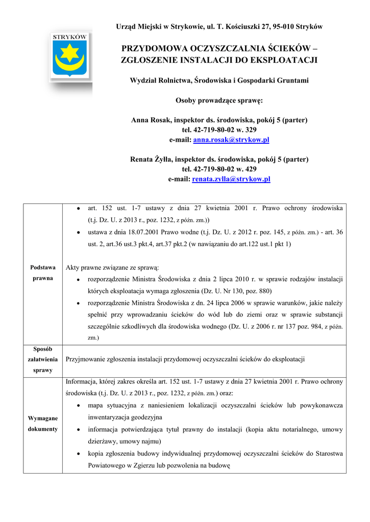 Urząd Miejski w Strykowie, ul. T. Kościuszki 27, 95-010 Stryków PRZYDOMOWA OCZYSZCZALNIA ŚCIEKÓW – ZGŁOSZENIE INSTALACJI DO EKSPLOATACJI Wydział Rolnictwa, Środowiska i Gospodarki Gruntami Osoby prowadzące sprawę: Anna Rosak, inspektor ds. środowiska, pokój 5 (parter) tel. 42-719-80-02 w. 329 e-mail: [email protected] Renata Żyłła, inspektor ds. środowiska, pokój 5 (parter) tel. 42-719-80-02 w. 429 e-mail: [email protected] art. 152 ust. 1-7 ustawy z dnia 27 kwietnia 2001 r. Prawo ochrony środowiska (t.j. Dz. U. z 2013 r., poz. 1232, z późn. zm.)) ustawa z dnia 18.07.2001 Prawo wodne (t.j. Dz. U. z 2012 r. poz. 145, z późn. zm.) - art. 36 ust. 2, art.36 ust.3 pkt.4, art.37 pkt.2 (w nawiązaniu do art.122 ust.1 pkt 1) Podstawa prawna Akty prawne związane ze sprawą: rozporządzenie Ministra Środowiska z dnia 2 lipca 2010 r. w sprawie rodzajów instalacji których eksploatacja wymaga zgłoszenia (Dz. U. Nr 130, poz. 880) rozporządzenie Ministra Środowiska z dn. 24 lipca 2006 w sprawie warunków, jakie należy spełnić przy wprowadzaniu ścieków do wód lub do ziemi oraz w sprawie substancji szczególnie szkodliwych dla środowiska wodnego (Dz. U. z 2006 r. nr 137 poz. 984, z późn. zm.) Sposób załatwienia Przyjmowanie zgłoszenia instalacji przydomowej oczyszczalni ścieków do eksploatacji sprawy Informacja, której zakres określa art. 152 ust. 1-7 ustawy z dnia 27 kwietnia 2001 r. Prawo ochrony środowiska (t.j. Dz. U. z 2013 r., poz. 1232, z późn. zm.) oraz: inwentaryzacja geodezyjna Wymagane dokumenty mapa sytuacyjna z naniesieniem lokalizacji oczyszczalni ścieków lub powykonawcza informacja potwierdzająca tytuł prawny do instalacji (kopia aktu notarialnego, umowy dzierżawy, umowy najmu) kopia zgłoszenia budowy indywidualnej przydomowej oczyszczalni ścieków do Starostwa Powiatowego w Zgierzu lub pozwolenia na budowę informacja o gruncie, na którym jest wykonana oczyszczalnia zawierająca w szczególności informacje o głębokości położenia najwyższego użytkowego poziomu wodonośnego wód podziemnych, chłonności gruntu lub wyniki testu perkolacyjnego kopia dokumentacji technicznej przydomowej oczyszczalni ścieków kopia atestu/certyfikatu lub aprobaty technicznej gwarantującej skuteczność działania oczyszczalni Miejsce składania Sekretariat Urzędu Miejskiego w Strykowie, ul. T. Kościuszki 27, 95-010 Stryków – pokój 2 wniosków Termin Realizacji Tryb udzielania odpowiedzi Przyjęcie zgłoszenia pod warunkiem, że w ciągu 30 dni organ nie wniesie sprzeciwu Przyjęcie zgłoszenia. W przypadku wniesienia sprzeciwu, Burmistrz Strykowa wydaje decyzję w trybie art. 104 Kpa W przypadku wniesienia sprzeciwu w drodze decyzji, stronie przysługuje odwołanie do Tryb odwoławczy Uwagi Samorządowego Kolegium Odwoławczego w Łodzi, ul. Piotrkowska 86, 90-103 Łódź, za pośrednictwem Burmistrza Strykowa, w terminie 14 dni od daty otrzymania decyzji Brak Za przyjęcie zgłoszenia - 120,- PLN Opłaty Opłatę uiszcza się w momencie składania zgłoszenia. Opłata nie dotyczy zgłoszenia do eksploatacji urządzenia technicznego służącego oczyszczeniu ścieków mającego zapewnić możliwość użytkowania wyłącznie budynku mieszkalnego Załączniki Formularz zgłoszenia przydomowej oczyszczalni ścieków