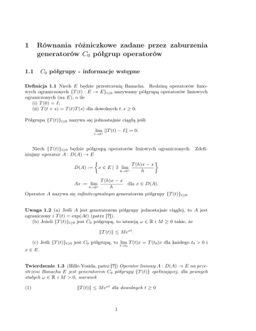 Twierdzenie 1.3 (Hille-Yosida, patrz [?]) Operator liniowy A : D(A) → E na przestrzeni Banacha E jest generatorem C0 półgrupy {T (t)} spełniającej, dla pewnych