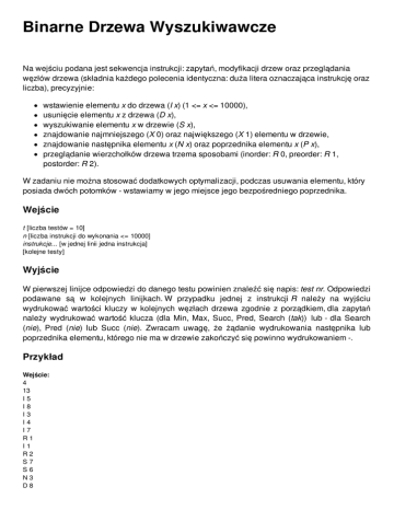 Binarne Drzewa Wyszukiwawcze Na wejściu podana jest sekwencja instrukcji: zapytań, modyfikacji drzew oraz przeglądania węzłów drzewa (składnia każdego polecenia identyczna: duża litera oznaczająca instrukcję oraz liczba), precyzyjnie: wstawienie elementu x do drzewa (I x) (1 <= x <= 10000), usunięcie elementu x z drzewa (D x), wyszukiwanie elementu x w drzewie (S x), znajdowanie najmniejszego (X 0) oraz największego (X 1) elementu w drzewie, znajdowanie następnika elementu x (N x) oraz poprzednika elementu x (P x), przeglądanie wierzchołków drzewa trzema sposobami (inorder: R 0, preorder: R 1, postorder: R 2). W zadaniu nie można stosować dodatkowych optymalizacji, podczas usuwania elementu, który posiada dwóch potomków - wstawiamy w jego miejsce jego bezpośredniego poprzednika. Wejście t [liczba testów = 10] n [liczba instrukcji do wykonania <= 10000] instrukcje... [w jednej linii jedna instrukcja] [kolejne testy] Wyjście W pierwszej linijce odpowiedzi do danego testu powinien znaleźć się napis: test nr. Odpowiedzi podawane są w kolejnych linijkach. W przypadku jednej z instrukcji R należy na wyjściu wydrukować wartości kluczy w kolejnych węzłach drzewa zgodnie z porządkiem, dla zapytań należy wydrukować wartość klucza (dla Min, Max, Succ, Pred, Search (tak)) lub - dla Search (nie), Pred (nie) lub Succ (nie). Zwracam uwagę, że żądanie wydrukowania następnika lub poprzednika elementu, którego nie ma w drzewie zakończyć się powinno wydrukowaniem -. Przykład Wejście: 4 13 I5 I8 I3 I4 I7 R1 I1 R2 S7 S6 N3 D8 R0 10 I4 I2 R0 D2 X1 X0 I1 X0 X0 X1 10 I4 P1 I1 R1 I2 I5 R0 D2 I2 P1 11 I3 X0 I2 D3 I1 I5 I4 D4 I4 D4 X1 Wyjście: test 1 53487 143785 7 4 13457 test 2 24 4 4 1 1 4 test 3 41 1245 test 4 3 5