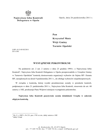 Opole, dnia 26 października 2011 r. NajwyŜsza Izba Kontroli Delegatura w Opolu Pan Krzysztof Mutz Wójt Gminy Tarnów Opolski LOP- 4113-05-02/2011 D/11/501 WYSTĄPIENIE POKONTROLNE Na podstawie art. 2 ust. 2 ustawy z dnia 23 grudnia 1994 r. o NajwyŜszej Izbie Kontroli1, NajwyŜsza Izba Kontroli Delegatura w Opolu przeprowadziła w Urzędzie Gminy w Tarnowie Opolskim2 kontrolę dostosowania organizacji wyborów do Sejmu RP i Senatu RP, zarządzonych na dzień 9 października 2011 r., do obsługi wyborców niepełnosprawnych. W związku z kontrolą, której wyniki przedstawione zostały w protokole kontroli, podpisanym w dniu 21 października 2011 r., NajwyŜsza Izba Kontroli, stosownie do art. 60 ustawy o NIK, przekazuje Panu Wójtowi niniejsze wystąpienie pokontrolne. NajwyŜsza Izba Kontroli pozytywnie ocenia działalność Urzędu w zakresie objętym kontrolą. 1 2 Dz. U. z 2007 r. Nr 231, poz. 1701 ze zm., dalej: ustawa o NIK dalej: Urząd ul. Krakowska 28, 45-075 Opole tel.: 77 449 70 00, fax: 77 449 70 44, e-mail: [email protected] PowyŜszą ocenę ogólną uzasadniają następujące ustalenia kontroli i wynikające z nich oceny cząstkowe: 1. Wójt, zgodnie z art. 16 § 1 ustawy z dnia 5 stycznia 2011 r. Kodeks wyborczy3, podał do publicznej wiadomości w formie obwieszczenia informacje o: numerach oraz granicach stałych i odrębnych obwodów głosowania, wyznaczonych siedzibach obwodowych komisji wyborczych, lokalach dostosowanych do potrzeb wyborców niepełnosprawnych oraz moŜliwości głosowania korespondencyjnego. Obwieszczenie to zostało zamieszczone dnia 1 września 2011 r. w Biuletynie Informacji Publicznej oraz na stronie internetowej Urzędu, a takŜe na tablicy ogłoszeniowej Urzędu oraz na słupach ogłoszeniowych i wiatach przystanków autobusowych na terenie gminy. Tym samym spełniony został wymóg określony w art. 16 § 2 Kodeksu Wyborczego. 2. Wójt podał do publicznej wiadomości informacje, o których mowa w art. 37a § 1 Kodeksu wyborczego, tj. informacje o właściwym dla wyborcy niepełnosprawnego okręgu wyborczym i obwodzie głosowania, lokalach obwodowych komisji wyborczych, dostosowanych do potrzeb wyborców niepełnosprawnych, znajdujących się najbliŜej miejsca zamieszkania wyborcy niepełnosprawnego, warunkach dopisania wyborcy niepełnosprawnego do spisu wyborców w obwodzie głosowania, w którym znajdują się lokale wyborcze dostosowane do potrzeb osób niepełnosprawnych, terminie wyborów oraz godzinach głosowania, komitetach wyborczych biorących udział w wyborach oraz zarejestrowanych kandydatach i listach kandydatów, warunkach oraz formach głosowania. Informacje te, stosownie do art. 37a § 4 ww. ustawy, zostały zamieszczone na stronie internetowej Urzędu, w Biuletynie Informacji Publicznej oraz na tablicy ogłoszeń w Urzędzie. W ww. sposób upubliczniona równieŜ została informacja o moŜliwości głosowania przy uŜyciu nakładek na karty do głosowania sporządzonych w alfabecie Braille’a. Zgodnie z art. 61b Kodeksu wyborczego, Wójt w dniu 25 sierpnia 2011 r. wyznaczył jedną spośród obwodowych komisji wyborczych na terenie Gminy Tarnów Opolski dla celów głosowania korespondencyjnego. W Gminie zapewniono moŜliwość głosowania w wyborach do Sejmu i Senatu RP przez pełnomocnika, Wójt bowiem, na podstawie art. 56 § 1 Kodeksu Wyborczego, Zarządzeniem z dnia 25 sierpnia 2011 r. upowaŜnił pracownika Urzędu do sporządzania stosownych aktów pełnomocnictwa. Wyborcy niepełnosprawni nie występowali do Urzędu o dopisanie ich do spisu wyborców w wybranym obwodzie głosowania, w którym znajdują się lokale wyborcze dostosowane do obsługi wyborców niepełnosprawnych, nie zwracali się o udzielenie informacji określonych 3 Dz. U. Nr 21, poz. 112 ze zm. 2 w art. 37 a § 1 Kodeksu wyborczego, ani teŜ nie wystąpiły przypadki zgłoszenia zamiaru głosowania korespondencyjnego, głosowania za pośrednictwem pełnomocnika lub przy uŜyciu nakładek sporządzonych w alfabecie Braille’a. 3. Wójt wyznaczył dwa lokale wyborcze do obsługi wyborców niepełnosprawnych, czym wypełniono wymóg określony w art. 186 Kodeksu wyborczego, w związku z art. 15a ustawy z dnia 5 stycznia 2011 r. Przepisy wprowadzające ustawę - Kodeks wyborczy4. Lokale te odpowiadały warunkom określonym w rozporządzeniu Ministra Infrastruktury z dnia 29 lipca 2011 r. w sprawie lokali obwodowych komisji wyborczych dostosowanych do potrzeb wyborców niepełnosprawnych5, m.in. znajdowały się na parterach budynków i posiadały dojazdy chodnikiem bez barier architektonicznych, drzwi oraz progi umoŜliwiały dogodne warunki ruchu wyborcom niepełnosprawnym, droga prowadząca od drzwi wejściowych do miejsca głosowania była moŜliwie najkrótsza i wolna od przeszkód. Stwierdzono jednak, Ŝe w obu ww. lokalach, w miejscu zapewniającym tajność głosownia brak było dodatkowego (obok górnego) oświetlenia skierowanego bezpośrednio na miejsce przeznaczone do wypełniana karty do głosowania, czym naruszono § 3 pkt 4 ww. rozporządzenia. Pełnomocnik Wójta do spraw wyborów wyjaśniła, Ŝe powyŜsze spowodowane było przeoczeniem i nieuwagą. Dodatkowe oświetlenie zostało zamontowane w trakcie kontroli NIK (dnia 7 października 2011 r.). 4. Gmina Tarnów Opolski otrzymała od Krajowego Biura Wyborczego Delegatury w Opolu na przygotowanie i przeprowadzenie wyborów do Sejmu i Senatu RP kwotę 19,5 tys. zł. Według wyjaśnień Wójta, środki te w pełni pokryły wydatki związane z przygotowaniem do obsługi wyborców niepełnosprawnych. W związku z pozytywną oceną kontrolowanego zakresu NajwyŜsza Izba Kontroli odstępuje od sformułowania wniosków pokontrolnych. Zgodnie z treścią art. 61 ust. 1 ustawy o NIK, w terminie 7 dni od daty otrzymania niniejszego wystąpienia pokontrolnego przysługuje Panu prawo zgłoszenia na piśmie do Dyrektora Delegatury NIK umotywowanych zastrzeŜeń w sprawie ocen zawartych w wystą