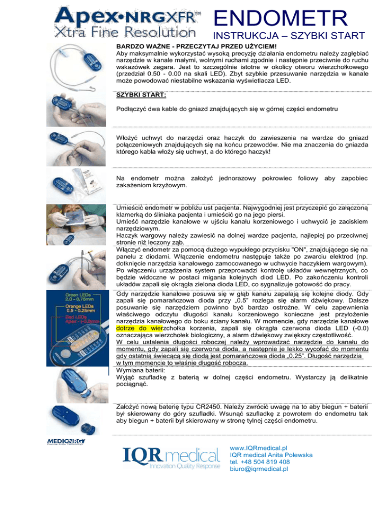 ENDOMETR INSTRUKCJA – SZYBKI START BARDZO WAŻNE - PRZECZYTAJ PRZED UŻYCIEM! Aby maksymalnie wykorzystać wysoką precyzję działania endometru należy zagłębiać narzędzie w kanale małymi, wolnymi ruchami zgodnie i następnie przeciwnie do ruchu wskazówek zegara. Jest to szczególnie istotne w okolicy otworu wierzchołkowego (przedział 0.50 - 0.00 na skali LED). Zbyt szybkie przesuwanie narzędzia w kanale może powodować niestabilne wskazania wyświetlacza LED. SZYBKI START: Podłączyć dwa kable do gniazd znajdujących się w górnej części endometru Włożyć uchwyt do narzędzi oraz haczyk do zawieszenia na wardze do gniazd połączeniowych znajdujących się na końcu przewodów. Nie ma znaczenia do gniazda którego kabla włoży się uchwyt, a do którego haczyk! Na endometr można założyć jednorazowy pokrowiec foliowy aby zapobiec zakażeniom krzyżowym. Umieścić endometr w pobliżu ust pacjenta. Najwygodniej jest przyczepić go załączoną klamerką do śliniaka pacjenta i umieścić go na jego piersi. Umieść narzędzie kanałowe w ujściu kanału korzeniowego i uchwycić je zaciskiem narzędziowym. Haczyk wargowy należy zawiesić na dolnej wardze pacjenta, najlepiej po przeciwnej stronie niż leczony ząb. Włączyć endometr za pomocą dużego wypukłego przycisku "ON", znajdującego się na panelu z diodami. Włączenie endometru następuje także po zwarciu elektrod (np. dotknięcie narzędzia kanałowego zamocowanego w uchwycie haczykiem wargowym). Po włączeniu urządzenia system przeprowadzi kontrolę układów wewnętrznych, co będzie widoczne w postaci migania kolejnych diod LED. Po zakończeniu kontroli układów zapali się okrągła zielona dioda LED, co sygnalizuje gotowość do pracy. Gdy narzędzie kanałowe posuwa się w głąb kanału zapalają się kolejne diody. Gdy zapali się pomarańczowa dioda przy „0.5” rozlega się alarm dźwiękowy. Dalsze posuwanie się narzędziem powinno być bardzo ostrożne. W celu zapewnienia właściwego odczytu długości kanału korzeniowego konieczne jest przyłożenie narzędzia kanałowego do boku ściany kanału. W momencie, gdy narzędzie kanałowe dotrze do wierzchołka korzenia, zapali się okrągła czerwona dioda LED (-0.0) oznaczająca wierzchołek biologiczny, a alarm dźwiękowy zwiększy częstotliwość. W celu ustalenia długości roboczej należy wprowadzać narzędzie do kanału do momentu, gdy zapali się czerwona dioda, a następnie je lekko wycofać do momentu gdy ostatnią świecącą się diodą jest pomarańczowa dioda „0.25”. Długość narzędzia w tym momencie to właśnie długość robocza. Wymiana baterii: Wyjąć szufladkę z baterią w dolnej części endometru. Wystarczy ją delikatnie pociągnąć. Założyć nową baterię typu CR2450. Należy zwrócić uwagę na to aby biegun + baterii był skierowany do góry szufladki. Wsunąć szufladkę z powrotem do endometru tak aby biegun + baterii był skierowany w stronę tylnej części endometru. www.IQRmedical.pl IQR medical Anita Polewska tel. +48 504 819 408 [email protected]
