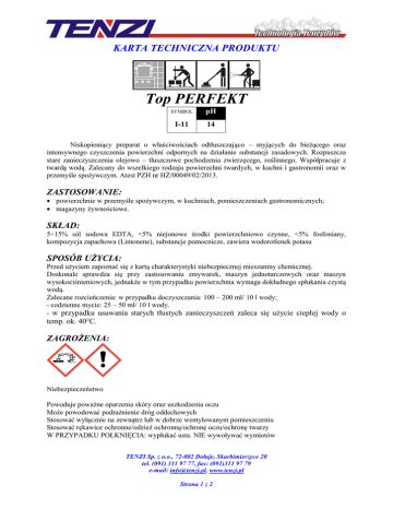 KARTA TECHNICZNA PRODUKTU Top PERFEKT SYMBOL pH I-11 14 Niskopieniący preparat o właściwościach odtłuszczająco – myjących do bieżącego oraz intensywnego czyszczenia powierzchni odpornych na działanie substancji zasadowych. Rozpuszcza stare zanieczyszczenia olejowo – tłuszczowe pochodzenia zwierzęcego, roślinnego. Współpracuje z twardą wodą. Zalecany do wszelkiego rodzaju powierzchni twardych, w kuchni i gastronomii oraz w przemyśle spożywczym. Atest PZH nr HŻ/00049/02/2013. ZASTOSOWANIE: powierzchnie w przemyśle spożywczym, w kuchniach, pomieszczeniach gastronomicznych; magazyny żywnościowe. SKŁAD: 5÷15% sól sodowa EDTA, <5% niejonowe środki powierzchniowo czynne, <5% fosfoniany, kompozycja zapachowa (Limonene), substancje pomocnicze, zawiera wodorotlenek potasu SPOSÓB UŻYCIA: Przed użyciem zapoznać się z kartą charakterystyki niebezpiecznej mieszaniny chemicznej. Doskonale sprawdza się przy zastosowaniu zmywarek, maszyn jednotarczowych oraz maszyn wysokociśnieniowych, jednakże w tym przypadku powierzchnia wymaga dokładnego spłukania czystą wodą. Zalecane rozcieńczenia: w przypadku doczyszczania: 100 – 200 ml/ 10 l wody; - codzienne mycie: 25 – 50 ml/ 10 l wody. - w przypadku usuwania starych tłustych zanieczyszczeń zaleca się użycie ciepłej wody o temp. ok. 40°C. ZAGROŻENIA: Niebezpieczeństwo Powoduje poważne oparzenia skóry oraz uszkodzenia oczu Może powodować podrażnienie dróg oddechowych Stosować wyłącznie na zewnątrz lub w dobrze wentylowanym pomieszczeniu Stosować rękawice ochronne/odzież ochronną/ochronę oczu/ochronę twarzy W PRZYPADKU POŁKNIĘCIA: wypłukać usta. NIE wywoływać wymiotów TENZI Sp. z o.o., 72-002 Dołuje, Skarbimierzyce 20 tel. (091) 311 97 77, fax: (091)311 97 79 e-mail: [email protected], www.tenzi.pl Strona 1 z 2 KARTA TECHNICZNA PRODUKTU W PRZYPADKU KONTAKTU ZE SKÓRĄ (lub z włosami): Natychmiast zdjąć całą zanieczyszczoną odzież. Spłukać skórę pod strumieniem wody/prysznicem. Natychmiast skontaktować się z OŚRODKIEM ZATRUĆ / lekarzem W PRZYPADKU DOSTANIA SIĘ DO OCZU: Ostrożnie płukać wodą przez kilka minut. Wyjąć soczewki kontaktowe, jeżeli są i można je łatwo usunąć. Nadal płukać Przechowywać pod zamknięciem TERMIN WAŻNOŚCI: 36 miesięcy od daty produkcji. Data produkcji/seria oraz data ważności podana na opakowaniu. DODATKOWE INFORMACJE: Dodatkowe informacje dostępne w karcie charakterystyki niebezpiecznej mieszaniny chemicznej. Zanieczyszczone opakowanie należy całkowicie opróżnić. Puste opakowania wypłukać kilkakrotnie wodą, którą zużyć tak jak preparat. Puste opakowanie można składować w pojemnikach przeznaczonych do zbiórki opakowań z tworzyw sztucznych lub przekazać wyspecjalizowanej firmie do utylizacji. Przestrzegać przepisów Ustawy z dnia 13 czerwca 2013 r. o gospodarce opakowaniami i odpadami opakowaniowymi (Dz. U. 2013, poz. 888). TENZI Sp. z o.o., 72-002 Dołuje, Skarbimierzyce 20 tel. (091) 311 97 77, fax: (091)311 97 79 e-mail: [email protected], www.tenzi.pl Strona 2 z 2