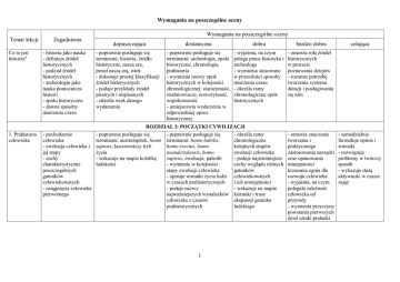 Wymagania na poszczególne oceny Wymagania na poszczególne oceny Temat lekcji Co to jest historia? 1. Prahistoria człowieka Zagadnienia - historia jako nauka - definicja źródeł historycznych - podział źródeł historycznych - archeologia jako nauka pomocnicza historii - epoki historyczne - dawne sposoby mierzenia czasu dopuszczająca - poprawnie posługuje się terminami: historia, źródło historyczne, nasza era, przed naszą erą, wiek - dokonuje prostej klasyfikacji źródeł historycznych - podaje przykłady źródeł pisanych i niepisanych - określa wiek danego wydarzenia dostateczna dobra bardzo dobra - poprawnie posługuje się terminami: archeologia, epoki historyczne, chronologia, prahistoria - wymienia nazwy epok historycznych w kolejności chronologicznej: starożytność, średniowiecze, nowożytność, współczesność - umiejscawia wydarzenia w odpowiedniej epoce historycznej - wyjaśnia, na czym polega praca historyka i archeologa - wymienia stosowane w przeszłości sposoby mierzenia czasu - określa ramy chronologiczne epok historycznych - omawia rolę źródeł historycznych w procesie poznawania dziejów - rozumie potrzebę tworzenia systemu datacji i posługiwania się nim ROZDZIAŁ I: POCZĄTKI CYWILIZACJI - pochodzenie - poprawnie posługuje się - poprawnie posługuje się - określa ramy człowieka terminami: australopitek, homo terminami: homo habilis, chronologiczne - ewolucja człowieka i sapiens, koczowniczy tryb homo erectus, homo kolejnych etapów jej etapy życia neandertalensis, homo ewolucji człowieka - cechy - wskazuje na mapie kolebkę sapiens, ewolucja, paleolit - podaje najistotniejsze charakterystyczne ludzkości - wymienia w kolejności cechy wyglądu różnych poszczególnych etapy ewolucji człowieka gatunków gatunków - opisuje warunki życia ludzi człowiekowatych człowiekowatych w czasach prahistorycznych i ich umiejętności - osiągnięcia człowieka - podaje nazwy - wskazuje na mapie pierwotnego najważniejszych wynalazków kierunki i trasy człowieka z czasów ekspansji gatunku prahistorycznych ludzkiego 1 - omawia znaczenie tworzenia i praktycznego zastosowania narzędzi oraz opanowania umiejętności krzesania ognia dla rozwoju człowieka - wyjaśnia, na czym polegała zależność człowieka od przyrody - wymienia przyczyny powstania pierwszych dzieł sztuki praludzi celująca - samodzielnie formułuje opinie i wnioski - rozwiązuje problemy w twórczy sposób - wykazuje dużą aktywność w czasie zajęć Tajemnice sprzed wieków – Jak zbadano pochodzenie człowieka? 2. Czas wielkich przemian - teorie dotyczące powstania człowieka - Karol Darwin i jego odkrycie - zadania antropologii - wpływ zmian klimatu na życie człowieka - rewolucja neolityczna - początki rolnictwa i hodowli - pierwsze osady - budowle megalityczne - początek metalurgii - przedstawia główne założenia teorii Karola Darwina - wymienia teorie dotyczące powstania człowieka - poprawnie posługuje się terminami: rewolucja neolityczna, osiadły tryb życia, osada, epoka brązu, epoka żelaza - przedstawia zmiany, które zaszły w życiu człowieka w okresie neolitu - podaje nazwy metali wykorzystywanych przez praludzi do wytopu broni, narzędzi, ozdób - poprawnie posługuje się terminami: ewolucjonizm, antropologia - opisuje, czym zajmuje się antropolog - omawia sposoby ustalania wieku znalezisk - omawia teorię ewolucji Karola Darwina - wyjaśnia różnice między teorią kreacjonizmu a ewolucjonizmu - przedstawia znaczenie badań naukowych oraz wykorzystania różnych technologii dla poznania historii człowieka - poprawnie posługuje się terminami: neolit, megalit - określa ramy chronologiczne rewolucji neolitycznej - opisuje życie codzienne ludzi przed rewolucją neolityczną - omawia sposób wytopu brązu i żelaza - przedstawia wpływ zmian klimatycznych na tryb życia człowieka pierwotnego - omawia tryb życia i zajęcia ludzi epoki neolitu - nazywa i lokalizuje na mapie pozostałości najstarszej znanej osady ludzkiej - wskazuje na mapie miejsce położenia najbardziej znanej budowli megalitycznej - wyjaśnia, jakie zmiany nastąpiły w życiu człowieka dzięki opanowaniu umiejętności wytopu metali - omawia tryb życia i zajęcia ludzi epoki neolitu - charakteryzuje wygląd osad neolitycznych - opisuje wygląd i funkcje budowli megalitycznych 2 - prezentuje argumenty zwolenników i przeciwników ewolucjonizmu Ponadto: - samodzielnie formułuje opinie i wnioski - rozwiązuje problemy w twórczy sposób - wykazuje dużą aktywność w czasie zajęć - uzasadnia słuszność określenia rewolucja dla zmian, które zaszły w życiu człowieka w okresie neolitu Ponadto: - samodzielnie formułuje opinie i wnioski - rozwiązuje problemy w twórczy sposób - wykazuje dużą aktywność w czasie zajęć 3. W kraju Sumerów 4. Babilonia i Asyria - położenie geograficzne i warunki naturalne Mezopotamii - powstanie pierwszych państw - organizacja państwa Sumerów - osiągnięcia cywilizacji sumeryjskiej - poprawnie posługuje się terminami: cywilizacja, Mezopotamia, system irygacyjny, Sumerowie, miastopaństwo - lokalizuje na mapie Mezopotamię - omawia położenie geograficzne i warunki naturalne panujące w Mezopotamii - wymienia osiągnięcia Sumerów - podaje ramy chronologiczne istnienia cywilizacji sumeryjskiej - poprawnie posługuje się terminami: Żyzny Półksiężyc, król-kapłan, zikkurat - określa rolę rzek w starożytnej Mezopotamii - opisuje wygląd miast sumeryjskich - charakteryzuje oddziaływanie warunków naturalnych na życie mieszkańców Mezopotamii - państwo babilońskie - Hammurabi i jego kodeks prawny - Babilon - państwo asyryjskie - organizacja armii asyryjskiej - poprawnie posługuje się terminami: Babilon, Kodeks Hammurabiego, politeizm - określa, kim był i czym zasłynął Hammurabi - lokalizuje na mapie państwo babilońskie i asyryjskie - omawia najważniejsze zasady prawne zapisane w Kodeksie Ham