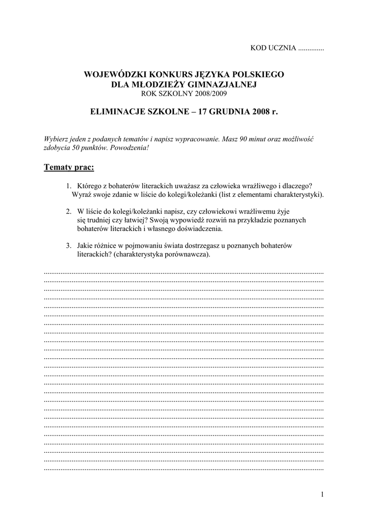 KOD UCZNIA .............. WOJEWÓDZKI KONKURS JĘZYKA POLSKIEGO DLA MŁODZIEśY GIMNAZJALNEJ ROK SZKOLNY 2008/2009 ELIMINACJE SZKOLNE – 17 GRUDNIA 2008 r. Wybierz jeden z podanych tematów i napisz wypracowanie. Masz 90 minut oraz moŜliwość zdobycia 50 punktów. Powodzenia! Tematy prac: 1. Którego z bohaterów literackich uwaŜasz za człowieka wraŜliwego i dlaczego? Wyraź swoje zdanie w liście do kolegi/koleŜanki (list z elementami charakterystyki). 2. W liście do kolegi/koleŜanki napisz, czy człowiekowi wraŜliwemu Ŝyje się trudniej czy łatwiej? Swoją wypowiedź rozwiń na przykładzie poznanych bohaterów literackich i własnego doświadczenia. 3. Jakie róŜnice w pojmowaniu świata dostrzegasz u poznanych bohaterów literackich? (charakterystyka porównawcza). ....................................................................................................................................................... ....................................................................................................................................................... ....................................................................................................................................................... ....................................................................................................................................................... ....................................................................................................................................................... ....................................................................................................................................................... ....................................................................................................................................................... ....................................................................................................................................................... ....................................................................................................................................................... ....................................................................................................................................................... ....................................................................................................................................................... ....................................................................................................................................................... ....................................................................................................................................................... ....................................................................................................................................................... ....................................................................................................................................................... ....................................................................................................................................................... ....................................................................................................................................................... ....................................................................................................................................................... ....................................................................................................................................................... ....................................................................................................................................................... ....................................................................................................................................................... ....................................................................................................................................................... ....................................................................................................................................................... ....................................................................................................................................................... 1 ....................................................................................................................................................... ....................................................................................................................................................... ....................................................................................................................................................... ....................................................................................................................................................... ....................................................................................................................................................... ....................................................................................................................................................... ....................................................................................................................................................... ....................................................................................................................................................... ....................................................................................................................................................... ....................................................................................................................................................... .....................................