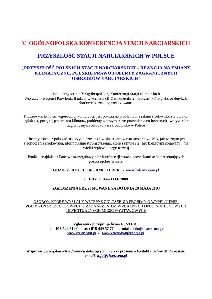 V OGÓLNOPOLSKA KONFERENCJA STACJI NARCIARSKICH PRZYSZŁOŚĆ STACJI NARCIARSKICH W POLSCE „PRZYSZŁOŚĆ POLSKICH STACJI NARCIARSKICH – REAKCJA NA ZMIANY KLIMATYCZNE, POLSKIE PRAWO I OFERTY ZAGRANICZNYCH OSRODKÓW NARCIARSKICH” Ustaliliśmy termin V Ogólnopolskiej Konferencji Stacji Narciarskich. Wszyscy prelegenci Potwierdzili udział w konferencji. Zamierzenia tematyczne, które głęboko dotykają środowisko zostaną zrealizowane. Kluczowym tematem tegorocznej konferencji jest pokazanie problemów z jakimi środowisko się boryka: legislacja, postępująca zmiana klimatu., problemy z otrzymaniem pozwolenia na inwestycje, wpływ ofert zagranicznych ośrodków na środowisko w Polsce Chcemy również pokazać, na przykładzie środowiska resortów narciarskich w USA, jak ważnym jest zjednoczenia środowiska, uformowanie stowarzyszenia, które zajmuje sie jego bieżącymi sprawami i ma wielki wpływ na jego rozwój Poniżej znajdziecie Państwo szczegółowy plan konferencji wraz z nazwiskami osób prezentujących poszczególne tematy. GDZIE ? HOTEL BEL AMI / JUREK - www.bel-ami.com.pl KIEDY ? 09 – 11.06.2008 ZGŁOSZENIA PRZYJMOWANE SĄ DO DNIA 20 MAJA 2008 OSOBOY, KTÓRE WYSŁAŁY WSTEPNE ZGŁOSZENIA PROSIMY O WYPEŁNIENIE ZGŁOSZEŃ SZCZECÓŁOWYCH Z ZAZNACZENIEM WYBRANYCH OPCJI NOCLEGOWYCH I EWENTUALNYCH MIESC WYSTAWOWYCH Zgłoszenia przyjmuje firma ELSTER : tel : 018 542 61 90 - fax : 018 449 57 77 - e-mial : [email protected] www.elster.com.pl / www.elster-konferencja.pl W sprawie szczegółowych inforamcji dotyczących imprezy prosimy o kontakt z Sylwia M. Grosszek: e-mail: [email protected]