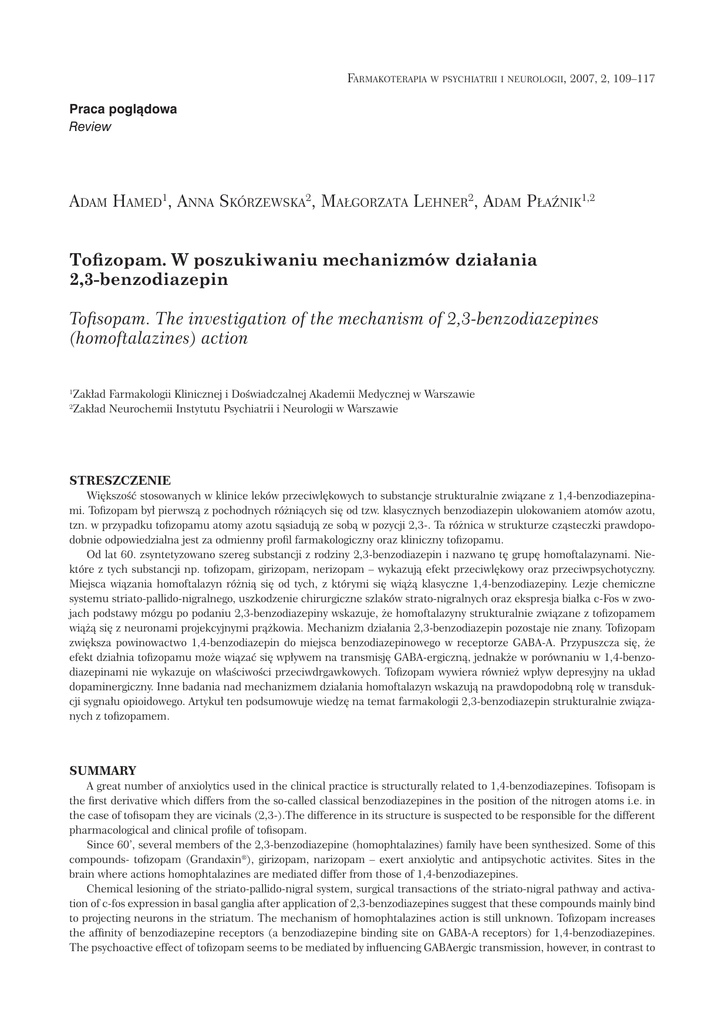 FARMAKOTERAPIA W PSYCHIATRII I NEUROLOGII, 2007, 2, 109–117 Praca poglądowa Review ADAM HAMED1, ANNA SKÓRZEWSKA2, MAŁGORZATA L EHNER2, ADAM PŁAŹNIK1,2 Tofizopam. W poszukiwaniu mechanizmów działania 2,3-benzodiazepin Tofisopam. The investigation of the mechanism of 2,3-benzodiazepines (homoftalazines) action Zakład Farmakologii Klinicznej i Doświadczalnej Akademii Medycznej w Warszawie Zakład Neurochemii Instytutu Psychiatrii i Neurologii w Warszawie 1 2 STRESZCZENIE Większość stosowanych w klinice leków przeciwlękowych to substancje strukturalnie związane z 1,4-benzodiazepinami. Tofizopam był pierwszą z pochodnych różniących się od tzw. klasycznych benzodiazepin ulokowaniem atomów azotu, tzn. w przypadku tofizopamu atomy azotu sąsiadują ze sobą w pozycji 2,3-. Ta różnica w strukturze cząsteczki prawdopodobnie odpowiedzialna jest za odmienny profil farmakologiczny oraz kliniczny tofizopamu. Od lat 60. zsyntetyzowano szereg substancji z rodziny 2,3-benzodiazepin i nazwano tę grupę homoftalazynami. Niektóre z tych substancji np. tofizopam, girizopam, nerizopam – wykazują efekt przeciwlękowy oraz przeciwpsychotyczny. Miejsca wiązania homoftalazyn różnią się od tych, z którymi się wiążą klasyczne 1,4-benzodiazepiny. Lezje chemiczne systemu striato-pallido-nigralnego, uszkodzenie chirurgiczne szlaków strato-nigralnych oraz ekspresja białka c-Fos w zwojach podstawy mózgu po podaniu 2,3-benzodiazepiny wskazuje, że homoftalazyny strukturalnie związane z tofizopamem wiążą się z neuronami projekcyjnymi prążkowia. Mechanizm działania 2,3-benzodiazepin pozostaje nie znany. Tofizopam zwiększa powinowactwo 1,4-benzodiazepin do miejsca benzodiazepinowego w receptorze GABA-A. Przypuszcza się, że efekt działnia tofizopamu może wiązać się wpływem na transmisję GABA-ergiczną, jednakże w porównaniu w 1,4-benzodiazepinami nie wykazuje on właściwości przeciwdrgawkowych. Tofizopam wywiera również wpływ depresyjny na układ dopaminergiczny. Inne badania nad mechanizmem działania homoftalazyn wskazują na prawdopodobną rolę w transdukcji sygnału opioidowego. Artykuł ten podsumowuje wiedzę na temat farmakologii 2,3-benzodiazepin strukturalnie związanych z tofizopamem. SUMMARY A great number of anxiolytics used in the clinical practice is structurally related to 1,4-benzodiazepines. Tofisopam is the first derivative which differs from the so-called classical benzodiazepines in the position of the nitrogen atoms i.e. in the case of tofisopam they are vicinals (2,3-).The difference in its structure is suspected to be responsible for the different pharmacological and clinical profile of tofisopam. Since 60’, several members of the 2,3-benzodiazepine (homophtalazines) family have been synthesized. Some of this compounds- tofizopam (Grandaxin®), girizopam, narizopam – exert anxiolytic and antipsychotic activites. Sites in the brain where actions homophtalazines are mediated differ from those of 1,4-benzodiazepines. Chemical lesioning of the striato-pallido-nigral system, surgical transactions of the striato-nigral pathway and activation of c-fos expression in basal ganglia after application of 2,3-benzodiazepines suggest that these compounds mainly bind to projecting neurons in the striatum. The mechanism of homophtalazines action is still unknown. Tofizopam increases the affinity of benzodiazepine receptors (a benzodiazepine binding site on GABA-A receptors) for 1,4-benzodiazepines. The psychoactive effect of tofizopam seems to be mediated by influencing GABAergic transmission, however, in contrast to 110 ADAM HAMED, ANNA SKÓRZEWSKA, MAŁGORZATA L EHNER, ADAM PŁAŹNIK 1,4-benzodiazepines, tofizopam has no anticonvulsive potency. Tofiopam also exert an inhibitory influence on the dopaminergic system. Few studies on the mechanism of action of 2,3-benzodiazepines indicate their possible role in opioid signal transduction. The present paper summarizes the main pharmacological actions of the 2,3-benzodiazepines family. Słowa kluczowe: leki przeciwlękowe, 2,3-benzodiazepiny, homoftalazyny, tofizopam, badania przedkliniczne Key words: anxiolytic drugs, basal ganglia, 2,3-benzodiazepines, homoftalazines, tofisopam, preclinical studies TOFIZOPAM. W POSZUKIWANIU MECHANIZMÓW DZIAŁANIA 2,3-BENZODIAZEPIN Początek badań przedklinicznych nad pochodnymi 2,3-benzodiazepin (2,3-BDZ) datuje się na lata 60., kiedy Kőrösi i Lăng zsyntetyzowali szereg związków chemicznych wykazujących zdolność redukcji zachowań o typie agresywnym oraz o właściwościach sedatywnych, jednocześnie pozbawionych właściwości miorelaksacyjnych oraz przeciwdrgawkowych (7). Zsyntetyzowane w latach 70. 2,3-benzodiazepiny stanowią niejednorodną pod względem mechanizmu działania grupę substancji. Aby zaznaczyć odrębność 2,3-benzodiazepin od klasycznych banzodiazepin (BDZ) nazwano je homoftalazynami. W odróżnieniu od znanych, klasycznych 1,4-bezodiazepin, 2,3-benzodiazepiny charakteryzuje odmienna budowa cząsteczki. Atomy azotu w bicyklicznym układzie benzodiazepiny umiejscowione są w pozycji 2 oraz 3 (w klasycznych benzodiazepinach atomy azotu występują w pozycjach 1 oraz 4). Benzodiazepiny są małymi heterocyklicznymi cząsteczkami przyjmującymi postać centroidów, można je otrzymać różnymi metodami, co pozwala na różnicowanie podstawników, a to z kolei umożliwia dokładne zbadanie przestrzeni konformacyjnej. Przestrzeń konformacyjną bicyklicznego centroidu zarówno 1,4- jak i 2,3- benzodiazepiny można badać zmieniając pięć różnych podstawników (5). W związku z wyżej wymienionymi właściwościami struktury chemicznej benzodiazepin, uzyskano na drodze syntezy kombinatorycznej wiele pochodnych zarówno 1,4- jak i 2,3-benzodiazepin o różnej aktywności biologicznej. Mechanizm działania 2,3-benzodiazepin nie jest poznany. Badania przedkliniczne wykazały, że 2,3benzodiazepiny w odróżnieniu od 1,4-benzodiazepin ni