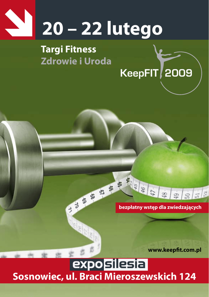 20 – 22 lutego Targi Fitness Zdrowie i Uroda bezpłatny wstęp dla zwiedzających www.keepfit.com.pl Sosnowiec, ul. Braci Mieroszewskich 124 Kolporter EXPO ma ogromną przyjemność zaprosić Państwa na targi promujące zdrowy i aktywny styl życia KeepFIT 2009. Wzorem sukcesu premierowej edycji targów, Organizatory przygotowują festiwal o charakterze konsumenckim, którego głównym celem jest zachęcenie jak największej grupy ludzi do zadbania o swe sylwetki, zdrowie i samopoczucie. Targom towarzyszyć będą Międzynarodowe Targi Turystyki, Rekreacji i Wypoczynku INTOUREX 2009. KeepFIT i INTOUREX 2008 w skrócie Ponad 100 Wystawców z 10 państw świata Oferty sprzętu fitness oraz treningowego, kosmetyków i suplementów diety Prezentacje polskich i zagranicznych ośrodków SPA, Wellness Pokazy szkół fitness, szkół tańca i szkół walki Spotkania autorytetów branży fitness, wellness i SPA Ogólnodostępne konsultacje specjalistów z dziedziny kosmetologii i dietetyki Targi to nasza specjalność Expo Silesia jest zlokalizowane w aglomeracji śląskiej, z 8 milionami potencjalnych konsumentów mieszkających w zasięgu godziny jazdy samochodem od obiektów targowych! Prowadzimy szeroko zakrojoną kampanię medialną. Przewidujemy w niej udział prasy branżowej, jak i mediów lokalnych ( prasa , radio, telewizja, akcja plakatowa i ulotki i zaproszenia). Zadbamy o liczny udział osób zwiedzających targi, zarówno gości branżowych jak i ostatecznych klientów. Dzięki połączeniu sił przy szerokiej kampanii promocyjnej w branży turystycznej nasze zaproszenia trafią dodatkowo do ponad 5000 przedstawicieli menedżmentu hoteli, pensjonatów, ośrodków wczasowych, ośrodków sportowych, SPA i wellness. Targi Fitness Zdrowie i Uroda KEEP FIT 2008 to propozycja dla Firm, które chcą zrobić na Śląsku dobry biznes propozycja dla Konsumentów, którzy chcą zadbać o swoje zdrowie i ciało Kontakt Joanna Janusz – Menedżer Projektu tel. 032 78 87 509, fax 032 78 87 526 kom. 0 510 031 692 Tereny targowe Expo Silesia – Kolporter EXPO 41-219 Sosnowiec, ul. Braci Mieroszewskich 124 www.exposilesia.pl