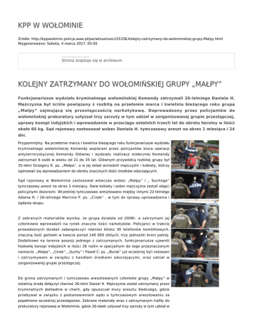 KPP W WOŁOMINIE Źródło: http://kppwolomin.policja.waw.pl/pw/aktualnosci/25338,Kolejny-zatrzymany-do-wolominskiej-grupy-Malpy.html Wygenerowano: Sobota, 4 marca 2017, 05:50 Strona znajduje się w archiwum. KOLEJNY ZATRZYMANY DO WOŁOMIŃSKIEJ GRUPY „MAŁPY” Funkcjonariusze wydziału kryminalnego wołomińskiej Komendy zatrzymali 26–letniego Daniela H. Mężczyzna był ściśle powiązany z rozbitą na przełomie marca i kwietnia bieżącego roku grupą „Małpy” zajmującą się przestępczością narkotykową. Doprowadzony przez policjantów do wołomińskiej prokuratury usłyszał trzy zarzuty w tym udział w zorganizowanej grupie przestępczej, uprawy konopi indyjskich i wprowadzenia w przeciągu ostatnich trzech lat do obrotu heroiny w ilości około 60 kg. Sąd rejonowy zastosował wobec Daniela H. tymczasowy areszt na okres 1 miesiąca i 24 dni. Przypomnijmy. Na przełomie marca i kwietnia bieżącego roku funkcjonariusze wydziału kryminalnego wołomińskiej Komendy wspierani przez policjantów biura operacji antyterrorystycznej Komendy Głównej i wydziału realizacji stołecznej Komendy zatrzymali 6 osób w wieku od 21 do 35 lat. Głównym przywódcą rozbitej grupy był 35-letni Grzegorz K. ps. „Małpa”, a w jej skład wchodzili mężczyźni i kobiety, którzy zajmowali się wprowadzaniem do obrotu znacznych ilości środków odurzających. Sąd rejonowy w Wołominie zastosował wówczas wobec „Małpy” i „ Suchego” tymczasowy areszt na okres 3 miesięcy. Dwie kobiety i jeden mężczyzna zostali objęci policyjnymi dozorami. Wcześniej tymczasowo aresztowano między innymi 22-letniego Adama R. i 26-letniego Marcina P. ps. „Cinek” , w tym do sprawy uprowadzenia i żądania okupu. Z zebranych materiałów wynika, że grupa działała od 2008r. a zatrzymani jej członkowie wprowadzili na rynek znaczne ilości narkotyków. Policjanci w trakcie prowadzonych działań zabezpieczyli również blisko 30 telefonów komórkowych, znaczną ilość gotówki w kwocie ponad 140 000 złotych, trzy jednostki broni palnej. Dodatkowo na terenie posesji jednego z zatrzymanych, funkcjonariusze ujawnili hodowlę konopi indyjskich w ilości 26 roślin w specjalnym do tego przeznaczonym namiocie. „Małpa”, „Cinek”, „Suchy” i Paweł Ć. ps. „Burak” już wcześniej byli notowani i zatrzymywani w związku z handlem środkami odurzającymi, oraz udział w zorganizowanej grupie przestępczej. Do grona zatrzymanych i tymczasowo aresztowanych członków grupy „Małpy” w ostatnią środę dołączył również 26-letni Daniel H. Mężczyzna został zatrzymany przez kryminalnych dokładnie w chwili, gdy opuszczał mury aresztu śledczego, gdzie przebywał w związku z postanowieniem sądu o tymczasowym aresztowaniu za popełnione wcześniej przestępstwo. Zebrane materiały wraz z zatrzymanym trafiły do prokuratury rejonowej w Wołominie, gdzie 26-latek usłyszał trzy zarzuty w tym udział w zorganizowanej grupie przestępczej, uprawy konopi indyjskich i wprowadzenia w przeciągu ostatnich trzech lat do obrotu heroiny w ilości około 60 kg. Sąd rejonowy zastosował wobec Daniela H. tymczasowy areszt na okres 1 miesiąca i 24 dni. ts/wz Ocena: 0/5 (0) Tweetnij