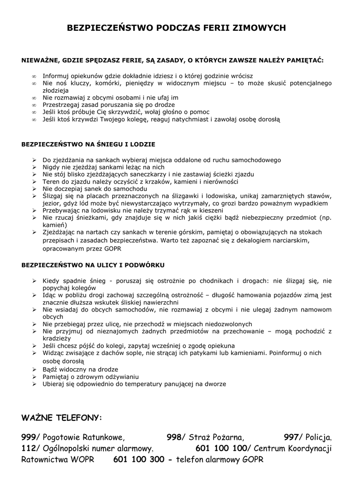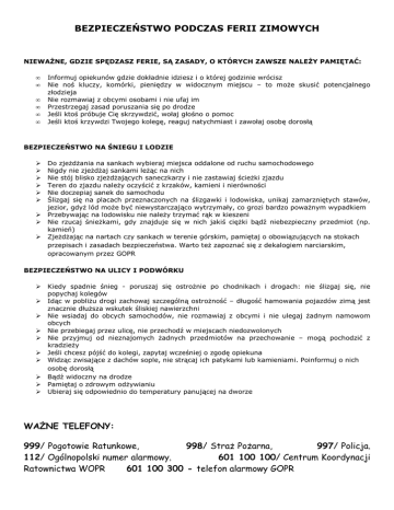 BEZPIECZEŃSTWO PODCZAS FERII ZIMOWYCH NIEWAŻNE, GDZIE SPĘDZASZ FERIE, SĄ ZASADY, O KTÓRYCH ZAWSZE NALEŻY PAMIĘTAĆ: • • • • • • Informuj opiekunów gdzie dokładnie idziesz i o której godzinie wrócisz Nie noś kluczy, komórki, pieniędzy w widocznym miejscu – to może skusić potencjalnego złodzieja Nie rozmawiaj z obcymi osobami i nie ufaj im Przestrzegaj zasad poruszania się po drodze Jeśli ktoś próbuje Cię skrzywdzić, wołaj głośno o pomoc Jeśli ktoś krzywdzi Twojego kolegę, reaguj natychmiast i zawołaj osobę dorosłą BEZPIECZEŃSTWO NA ŚNIEGU I LODZIE Do zjeżdżania na sankach wybieraj miejsca oddalone od ruchu samochodowego Nigdy nie zjeżdżaj sankami leżąc na nich Nie stój blisko zjeżdżających saneczkarzy i nie zastawiaj ścieżki zjazdu Teren do zjazdu należy oczyścić z krzaków, kamieni i nierówności Nie doczepiaj sanek do samochodu Ślizgaj się na placach przeznaczonych na ślizgawki i lodowiska, unikaj zamarzniętych stawów, jezior, gdyż lód może być niewystarczająco wytrzymały, co grozi bardzo poważnym wypadkiem Przebywając na lodowisku nie należy trzymać rąk w kieszeni Nie rzucaj śnieżkami, gdy znajduje się w nich jakiś ciężki bądź niebezpieczny przedmiot (np. kamień) Zjeżdżając na nartach czy sankach w terenie górskim, pamiętaj o obowiązujących na stokach przepisach i zasadach bezpieczeństwa. Warto też zapoznać się z dekalogiem narciarskim, opracowanym przez GOPR BEZPIECZEŃSTWO NA ULICY I PODWÓRKU Kiedy spadnie śnieg - poruszaj się ostrożnie po chodnikach i drogach: nie ślizgaj się, nie popychaj kolegów Idąc w pobliżu drogi zachowaj szczególną ostrożność – długość hamowania pojazdów zimą jest znacznie dłuższa wskutek śliskiej nawierzchni Nie wsiadaj do obcych samochodów, nie rozmawiaj z obcymi i nie ulegaj żadnym namowom obcych Nie przebiegaj przez ulicę, nie przechodź w miejscach niedozwolonych Nie przyjmuj od nieznajomych żadnych przedmiotów na przechowanie – mogą pochodzić z kradzieży Jeśli chcesz pójść do kolegi, zapytaj wcześniej o zgodę opiekuna Widząc zwisające z dachów sople, nie strącaj ich patykami lub kamieniami. Poinformuj o nich osobę dorosłą Bądź widoczny na drodze Pamiętaj o zdrowym odżywianiu Ubieraj się odpowiednio do temperatury panującej na dworze WAŻNE TELEFONY: 999/ Pogotowie Ratunkowe, 998/ Straż Pożarna, 997/ Policja, 112/ Ogólnopolski numer alarmowy, 601 100 100/ Centrum Koordynacji Ratownictwa WOPR 601 100 300 - telefon alarmowy GOPR