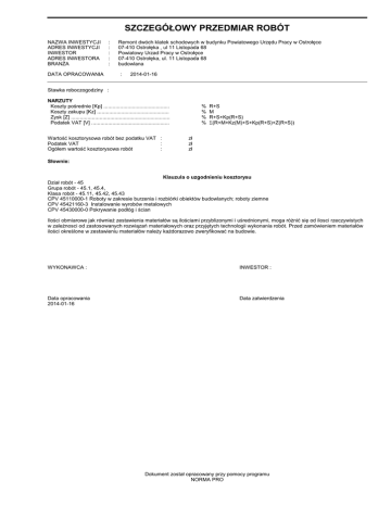 SZCZEGÓŁOWY PRZEDMIAR ROBÓT NAZWA INWESTYCJI ADRES INWESTYCJI INWESTOR ADRES INWESTORA BRANŻA : : : : : DATA OPRACOWANIA Remont dwóch klatek schodowych w budynku Powiatowego Urzędu Pracy w Ostrołęce 07-410 Ostrołęka , ul 11 Listopada 68 Powiatowy Urzad Pracy w Ostrołęce 07-410 Ostrołęka, ul. 11 Listopada 68 budowlana : 2014-01-16 Stawka roboczogodziny : NARZUTY Koszty pośrednie [Kp] ............................................ Koszty zakupu [Kz] ................................................ Zysk [Z] .................................................................. Podatek VAT [V] .................................................... Wartość kosztorysowa robót bez podatku VAT : Podatek VAT : Ogółem wartość kosztorysowa robót : % % % % R+S M R+S+Kp(R+S) Σ(R+M+Kz(M)+S+Kp(R+S)+Z(R+S)) zł zł zł Słownie: Klauzula o uzgodnieniu kosztorysu Dział robót - 45 Grupa robót - 45.1, 45.4, Klasa robót - 45.11, 45.42, 45.43 CPV 45110000-1 Roboty w zakresie burzenia i rozbiórki obiektów budowlanych; roboty ziemne CPV 45421160-3 Instalowanie wyrobów metalowych CPV 45430000-0 Pokrywanie podłóg i ścian Ilości obmiarowe jak również zestawienia materiałów są ilościami przyblizonymi i uśrednionymi, moga różnić się od ilosci rzeczywistych w zależnosci od zastosowanych rozwiązań materiałowych oraz przyjętych technologii wykonania robót. Przed zamówieniem materiałów ilości określone w zestawieniu materiałów należy każdorazowo zweryfikować na budowie. WYKONAWCA : INWESTOR : Data opracowania 2014-01-16 Data zatwierdzenia Dokument został opracowany przy pomocy programu NORMA PRO OGÓLNA CHARAKTERYSTYKA OBIEKTU Przedmiotem opracowania jest wycena kosztu remontu dwóch klatek schodowych w budynku Powiatowego Urzędu Pracy w Ostrołęce. W chwili obecnej schody wykończone są okładziną lastrykową. Na części podestów ułożone są płytki ceramiczne. Balustrady schodowe wykonane z płaskownika stalowego pomalowanego farbą olejną. Ściany klatki schodowej wykończone dołem tynkiem mozaikowym, zaś górą tynkiem cementowo-wapiennym pomalowanym farbą emulsyjną. W ramach remontu należy obłożyć schody (stopnice, podstopnice i podesty) płytkami gres oraz wymienić balustrady schodowe. Okładziny schodów. Rozebrać posadzki z płytek na podestach. Lastrykową nawierzchnię schodów nakłuć przecinakiem w celu uzyskania chropowatej nawierzchni. Powierzchnię zagruntować preparatem gruntującym na podłoże niechłonne (o parametrach minimum CT19). Całość wyrównać zaprawą klejącą o wysokiej przyczepności i elastyczności (o parametrach minimum CM17). Ułożyć płytki gres , gat. I. Na stopnicach i obrzeżach podestów ułożyć płytki gres o fakturze antypoślizgowej - stopnice ryflowane zaokrąglone. Wzdłuż ścian ułożyć cokoliki z płytek gres, wys. 8-10 cm. Płytki podłogowe typu gres porcellantato przeznaczone do obiektów narażonych na duże natężenie ruchu, o powierzchni naturalnej. Stopnice ryflowane. Nasiąkliwość wg PN-EN ISO 10545-3 poniżej 0,5 % Wytrzymałość na zginanie wg PN-EN ISO 10545-4 powyżej 35 N/m2 Odporność na ścieranie wgłębne wg PN-EN ISO 10545-6 max 135 mm3 Odporne na plamienie wg PN-EN ISO 10545-14 Antypoślizgowość wg DIN 51130 min R 10 Grubość płytek - min. 0,86 cm Stopnice, podesty, i cokoliki w kolorze beżowym, podstopnice w kolorze zielonym. Płytki o parametrach min. quarzite/Nowa Gala - QZ 03 i QZ 09 lub równoważne Połączyć ułożony cokolik z istniejącą ścianą: górną krawędź cokolika wykończyć zaprawą klejową pod kątem 45 st. i obłożyć tynkiem mozaikowym. Szczelinę pomiędzy płytkami a powierzchnią policzka biegu schodowego wypełnić zaprawą klejową i obłożyć tynkiem mozaikowym. Balustrady schodowe. Zdemontować istniejące balustrady schodowe i w ich miejsce zamontować balustrady schodowej ze stali nierdzewnej wys. 110 cm. Nowe balustrady wykonać ze stali nierdzewnej (polerowanej). Słupki z rury fi 40-42 mm (gr. ścianki 2 mm), poręcze - fi 50 mm (gr. ścianki 2 mm), wypełnienie - rury fi 15 mm - szt. 5. Przy wykonywaniu prac dołożyć staranności, aby nie uszkodzić nawierzchni ścian, które były remontowane w latach 2012/2013. Prace remontowe wykonywane będą etapowo, tzn. najpierw na jednej klatce schodowej, następnie na drugiej. Na czas prowadzenia robót jedna klatka schodowa będzie wyłączona z ruchu. -2- Norma PRO Wersja 4.44b Nr seryjny: 23152 PUP klatka schodowa.2014.kst Lp. Pozycje kosztorysowe TABELA ELEMENTÓW SCALONYCH Nazwa Kosztorys netto Podatek VAT Razem brutto Słownie: -3- Norma PRO Wersja 4.44b Nr seryjny: 23152 RAZEM PUP klatka schodowa.2014.kst PRZEDMIAR Lp. Podstawa Opis i wyliczenia REMONT DWÓCH KLATEK SCHODOWYCH 1 KNR 4-01 Rozebranie posadzki z płytek na zaprawie 0811-07 3.20*2.30+3.00*1.80 1.70*2.55*2 2 KNR 4-04 0804-02 3 KNR 4-01 0804-06 4 KNNR 2 120801 analogia + KNNR 2 120802 j.m. m2 m2 m 17.80*2 m Nacięcie podłoża lastrykowego przecinakiem m2 0.30*1.15*8*6*2 0.17*1.15*8*6*2 2.55*1.20*3*2+1.70*2.55*2*2+(3.70*1.40+1.20*1.60)*2 3.20*2.30+3.00*1.80 m2 m2 m2 m2 Gruntowanie podłoży preparatem gruntującym na podłoże niechłonne o parametrach min CT-19 oraz wyrównanie podłoża zaprawą o parametrach min. CM-17 gr. 5,0 mm pod płytki z kamieni sztucznych 0.30*1.15*8*6*2 0.17*1.15*8*6*2 2.55*1.20*3*2+1.70*2.55*2*2+(3.70*1.40+1.20*1.60)*2 3.20*2.30+3.00*1.80 m2 m2 m2 m2 m2 5 NNRNKB 202 (z.VI) Okładziny schodów z płytek gres, o fakturze antypoślizgo- m2 2810-05 wej, 4-5 klasa ścieralności, gat. I, stopnice ryflowane zaokrąglone, na zaprawie klejowej o parametrach min. CM-17, grub.warstwy 5 mm <stopnice i obrzeża podestów> 0.30*1.15*8*6*2 m2 114.55 33.12 18.77 49.90 12.76 RAZEM 114.55 33.12 RAZEM 33.12 81.43 9.44 RAZEM 9.44 94.40 RAZEM 94.40 94.40 RAZEM 94.40 35.60 RAZEM 35.60 wycena indywidualna Rg=0,4 Dostarczenie i montaż balustrady schodowej ze stali nierdzewnej m wys. 110 cm. Balustrad