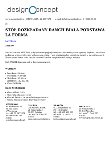 www.momastudio.pl | INFOLINIA.: 22 2437671 | e-mail: [email protected] | 2017-03-04 STÓŁ ROZKŁADANY RANCH BIAŁA PODSTAWA LA FORMA LA FORMA 2359.00 Stół rozkładany RANCH to połączenie tradycyjnej formy oraz modernistycznej oprawy. Stylowa, metalowa podstawa oraz perfekcyjnie wykończony szklany blat odróżniają ten produk od innych w swojej kategorii. Nowoczesna forma stołu bedzie stanowić idealne uzupełnienie każdego wnętrza. Stół RANCH dostępny jest w dwóch rozmiarach. Wymiary ● ● ● ● ● Szerokość: 0.00 cm Wysokość: 76.00 cm Głębokość: 80.00 cm Szerokość: 140-200 cm Waga: 58.00 kg Dane techniczne ● ● ● ● Materiał blat: Szkło Materiał podstawa: Metal Montaż: Produkt do samodzielnego montażu Kolory: Transparentny, biały lakierowany WARSZAWA Al. Krakowska 6a 05-090 Janki k/Warszawy tel: +48 22 2437671 +48 664 890 337 e-mail: [email protected] GDAŃSK CH RENTAL PARK ul. Przywidzka 7 80-001 Gdańsk tel: +48 58 3508790 e-mail: [email protected] KRAKÓW ul. Zakopiańska 56 30-418 Kraków tel: +48 505 436 669 tel: +48 12 3070112 e-mail: [email protected] WROCŁAW ul. Wrocławska 7 55-040 Wrocław tel: +48 71 3461885 e-mail: [email protected]