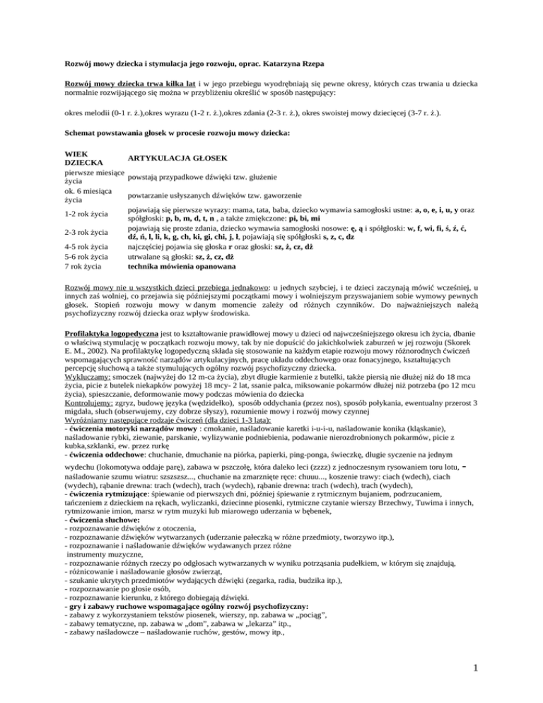 Rozwój mowy dziecka i stymulacja jego rozwoju, oprac. Katarzyna Rzepa Rozwój mowy dziecka trwa kilka lat i w jego przebiegu wyodrębniają się pewne okresy, których czas trwania u dziecka normalnie rozwijającego się można w przybliżeniu określić w sposób następujący: okres melodii (0-1 r. ż.),okres wyrazu (1-2 r. ż.),okres zdania (2-3 r. ż.), okres swoistej mowy dziecięcej (3-7 r. ż.). Schemat powstawania głosek w procesie rozwoju mowy dziecka: WIEK ARTYKULACJA GŁOSEK DZIECKA pierwsze miesiące powstają przypadkowe dźwięki tzw. głużenie życia ok. 6 miesiąca powtarzanie usłyszanych dźwięków tzw. gaworzenie życia pojawiają się pierwsze wyrazy: mama, tata, baba, dziecko wymawia samogłoski ustne: a, o, e, i, u, y oraz 1-2 rok życia spółgłoski: p, b, m, d, t, n , a także zmiękczone: pi, bi, mi pojawiają się proste zdania, dziecko wymawia samogłoski nosowe: ę, ą i spółgłoski: w, f, wi, fi, ś, ź, ć, 2-3 rok życia dź, ń, l, li, k, g, ch, ki, gi, chi, j, ł, pojawiają się spółgłoski s, z, c, dz 4-5 rok życia najczęściej pojawia się głoska r oraz głoski: sz, ż, cz, dż 5-6 rok życia utrwalane są głoski: sz, ż, cz, dż 7 rok życia technika mówienia opanowana Rozwój mowy nie u wszystkich dzieci przebiega jednakowo: u jednych szybciej, i te dzieci zaczynają mówić wcześniej, u innych zaś wolniej, co przejawia się późniejszymi początkami mowy i wolniejszym przyswajaniem sobie wymowy pewnych głosek. Stopień rozwoju mowy w danym momencie zależy od różnych czynników. Do najważniejszych należą psychofizyczny rozwój dziecka oraz wpływ środowiska. Profilaktyka logopedyczna jest to kształtowanie prawidłowej mowy u dzieci od najwcześniejszego okresu ich życia, dbanie o właściwą stymulację w początkach rozwoju mowy, tak by nie dopuścić do jakichkolwiek zaburzeń w jej rozwoju (Skorek E. M., 2002). Na profilaktykę logopedyczną składa się stosowanie na każdym etapie rozwoju mowy różnorodnych ćwiczeń wspomagających sprawność narządów artykulacyjnych, pracę układu oddechowego oraz fonacyjnego, kształtujących percepcję słuchową a także stymulujących ogólny rozwój psychofizyczny dziecka. Wykluczamy: smoczek (najwyżej do 12 m-ca życia), zbyt długie karmienie z butelki, także piersią nie dłużej niż do 18 mca życia, picie z butelek niekapków powyżej 18 mcy- 2 lat, ssanie palca, miksowanie pokarmów dłużej niż potrzeba (po 12 mcu życia), spieszczanie, deformowanie mowy podczas mówienia do dziecka Kontrolujemy: zgryz, budowę języka (wędzidełko), sposób oddychania (przez nos), sposób połykania, ewentualny przerost 3 migdała, słuch (obserwujemy, czy dobrze słyszy), rozumienie mowy i rozwój mowy czynnej Wyróżniamy następujące rodzaje ćwiczeń (dla dzieci 1-3 lata): - ćwiczenia motoryki narządów mowy : cmokanie, naśladowanie karetki i-u-i-u, naśladowanie konika (kląskanie), naśladowanie rybki, ziewanie, parskanie, wylizywanie podniebienia, podawanie nierozdrobnionych pokarmów, picie z kubka,szklanki, ew. przez rurkę - ćwiczenia oddechowe: chuchanie, dmuchanie na piórka, papierki, ping-ponga, świeczkę, długie syczenie na jednym wydechu (lokomotywa oddaje parę), zabawa w pszczołę, która daleko leci (zzzz) z jednoczesnym rysowaniem toru lotu, naśladowanie szumu wiatru: szszszsz..., chuchanie na zmarznięte ręce: chuuu..., koszenie trawy: ciach (wdech), ciach (wydech), rąbanie drewna: trach (wdech), trach (wydech), rąbanie drewna: trach (wdech), trach (wydech), - ćwiczenia rytmizujące: śpiewanie od pierwszych dni, później śpiewanie z rytmicznym bujaniem, podrzucaniem, tańczeniem z dzieckiem na rękach, wyliczanki, dziecinne piosenki, rytmiczne czytanie wierszy Brzechwy, Tuwima i innych, rytmizowanie imion, marsz w rytm muzyki lub miarowego uderzania w bębenek, - ćwiczenia słuchowe: - rozpoznawanie dźwięków z otoczenia, - rozpoznawanie dźwięków wytwarzanych (uderzanie pałeczką w różne przedmioty, tworzywo itp.), - rozpoznawanie i naśladowanie dźwięków wydawanych przez różne instrumenty muzyczne, - rozpoznawanie różnych rzeczy po odgłosach wytwarzanych w wyniku potrząsania pudełkiem, w którym się znajdują, - różnicowanie i naśladowanie głosów zwierząt, - szukanie ukrytych przedmiotów wydających dźwięki (zegarka, radia, budzika itp.), - rozpoznawanie po głosie osób, - rozpoznawanie kierunku, z którego dobiegają dźwięki. - gry i zabawy ruchowe wspomagające ogólny rozwój psychofizyczny: - zabawy z wykorzystaniem tekstów piosenek, wierszy, np. zabawa w „pociąg”, - zabawy tematyczne, np. zabawa w „dom”, zabawa w „lekarza” itp., - zabawy naśladowcze – naśladowanie ruchów, gestów, mowy itp., 1 - zabawy konstrukcyjne, - gry i zabawy z piłką lub innymi rekwizytami, - gry i zabawy gimnastyczne, np. przechodzenie przez tunel, czołganie się, skakanie, wymachiwanie rękami i nogami itp., - gry i zabawy manualne, np. rysowanie, malowanie, wydzieranie, stemplowanie, nawlekanie, wycinanie, lepienie, komponowanie, układanie, - zabawy, gry i ćwiczenia równoważne, np. chodzenie po ławeczce itp. Przykładowe zabawy z tekstami: Łapy , łapy cztery łapy. A na łapach pies kudłaty. Kto dogoni psa kto dogoni psa Może ty, może ty, może jednak ja. Hop-sa sa. Oto ja. Ręce dwie, nogi dwie Głowa Dwoje uszu ma Oczy, broda, usta, nos No i włosów cała moc. Pa, pa, pa Idą, idą Misie dwa Siała baba mak Nie wiedziała jak Dziadek wiedział Nie powiedział A to było tak.... Idzie rak nieborak Jaku ugryzie będzie znak. Rysowanka: Kropka kropka Kreska kreska I duże kółeczko Uśmiechniętą mamy buzię Jak słoneczko złote. Ślimak, ślimak pokaż rogi Dam ci sera na pierogi Jak nie sera, to kapusty, A z kapusty będziesz tłusty. Tańcowały dwa Michały Jeden duży drugi mały Jak ten duży zaczął krążyć To ten mały nie mógł zdążyć. Zabawy z naśladowaniem wzorów rytmicznych