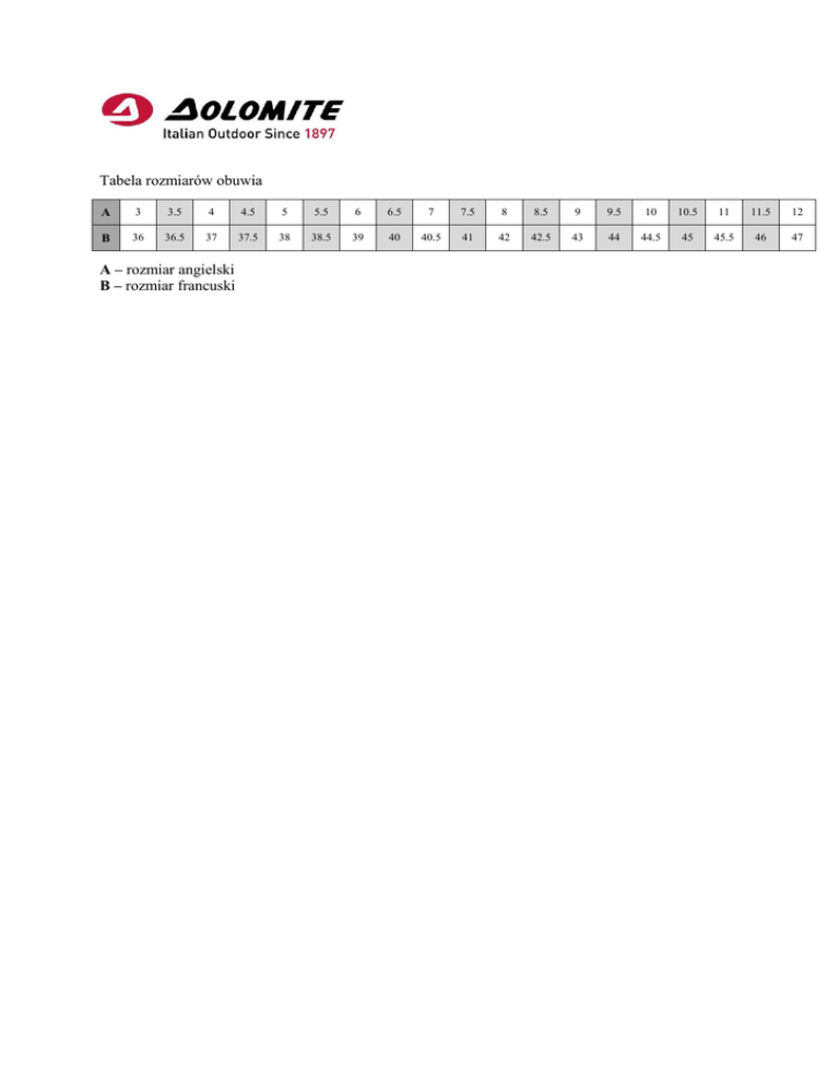 Tabela rozmiarów obuwia A 3 3.5 4 4.5 5 5.5 6 6.5 7 7.5 8 8.5 9 9.5 10 10.5 11 11.5 12 B 36 36.5 37 37.5 38 38.5 39 40 40.5 41 42 42.5 43 44 44.5 45 45.5 46 47 A – rozmiar angielski B – rozmiar francuski