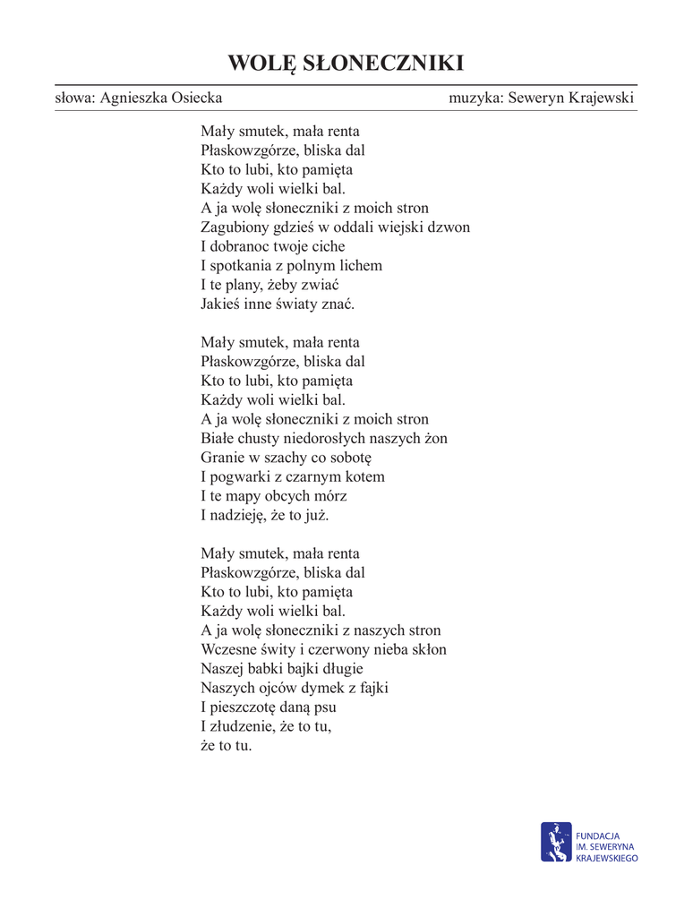 WOLĘ SŁONECZNIKI słowa: Agnieszka Osiecka muzyka: Seweryn Krajewski Mały smutek, mała renta Płaskowzgórze, bliska dal Kto to lubi, kto pamięta Każdy woli wielki bal. A ja wolę słoneczniki z moich stron Zagubiony gdzieś w oddali wiejski dzwon I dobranoc twoje ciche I spotkania z polnym lichem I te plany, żeby zwiać Jakieś inne światy znać. Mały smutek, mała renta Płaskowzgórze, bliska dal Kto to lubi, kto pamięta Każdy woli wielki bal. A ja wolę słoneczniki z moich stron Białe chusty niedorosłych naszych żon Granie w szachy co sobotę I pogwarki z czarnym kotem I te mapy obcych mórz I nadzieję, że to już. Mały smutek, mała renta Płaskowzgórze, bliska dal Kto to lubi, kto pamięta Każdy woli wielki bal. A ja wolę słoneczniki z naszych stron Wczesne świty i czerwony nieba skłon Naszej babki bajki długie Naszych ojców dymek z fajki I pieszczotę daną psu I złudzenie, że to tu, że to tu.