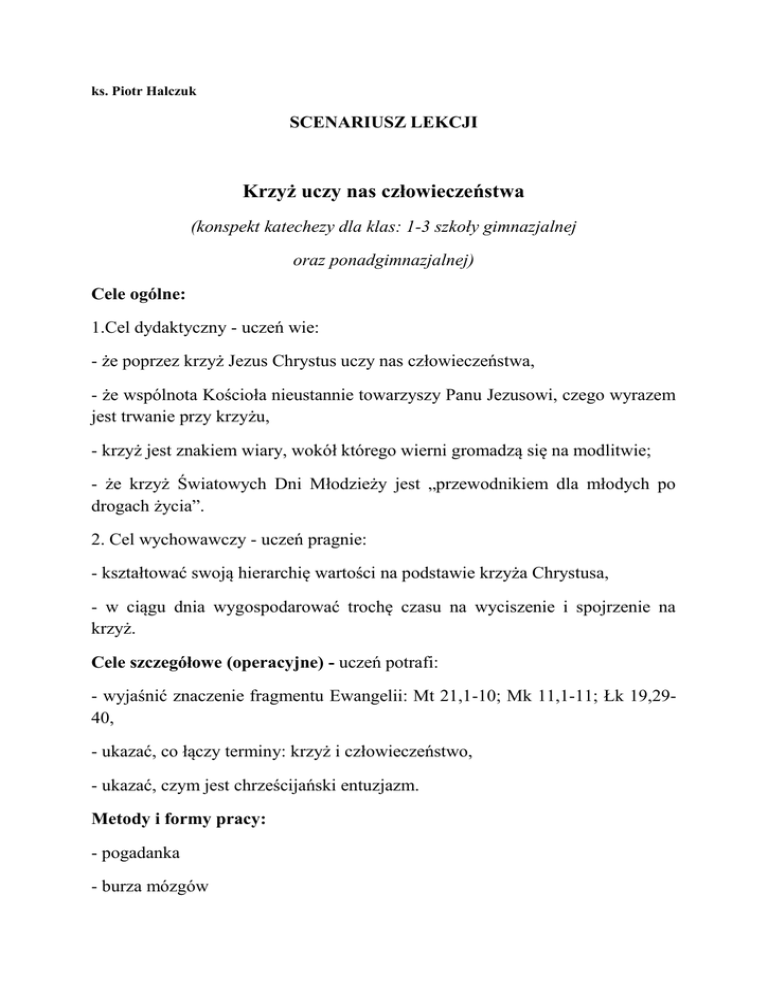 ks. Piotr Halczuk SCENARIUSZ LEKCJI Krzyż uczy nas człowieczeństwa (konspekt katechezy dla klas: 1-3 szkoły gimnazjalnej oraz ponadgimnazjalnej) Cele ogólne: 1.Cel dydaktyczny - uczeń wie: - że poprzez krzyż Jezus Chrystus uczy nas człowieczeństwa, - że wspólnota Kościoła nieustannie towarzyszy Panu Jezusowi, czego wyrazem jest trwanie przy krzyżu, - krzyż jest znakiem wiary, wokół którego wierni gromadzą się na modlitwie; - że krzyż Światowych Dni Młodzieży jest „przewodnikiem dla młodych po drogach życia”. 2. Cel wychowawczy - uczeń pragnie: - kształtować swoją hierarchię wartości na podstawie krzyża Chrystusa, - w ciągu dnia wygospodarować trochę czasu na wyciszenie i spojrzenie na krzyż. Cele szczegółowe (operacyjne) - uczeń potrafi: - wyjaśnić znaczenie fragmentu Ewangelii: Mt 21,1-10; Mk 11,1-11; Łk 19,2940, - ukazać, co łączy terminy: krzyż i człowieczeństwo, - ukazać, czym jest chrześcijański entuzjazm. Metody i formy pracy: - pogadanka - burza mózgów - rozmowa kierowana - mini wykład - praca w grupach: z tekstem, rozmowa, - praca indywidualna. Środki dydaktyczne: Fragment Ewangelii do wyboru: Mt 21,1-10; Mk 11,1-11; Łk 19,29-40; kartki z pytaniami; zdjęcie/obraz z uroczystego wjazdu Jezusa do Jerozolimy; zdjęcie młodzieży zgromadzonej przy krzyżu Światowych Dni Młodzieży; rzutnik multimedialny; zeszyt ucznia. Przebieg lekcji Faza przygotowawcza (ok. 10 min.) Modlitwa – fragment Wyznania wiary: ...wierzę w jednego Pana Jezusa Chrystusa... Przywitanie uczniów Sprawdzenie obecności Wprowadzenie oraz podanie tematu lekcji Burza mózgów – uczniowie zapisują na tablicy skojarzenia z słowami: krzyż człowieczeństwo W pogadance, istotne jest ukazanie wspólnych skojarzeń związanych z krzyżem i człowieczeństwem, np. miłość, cierpienie, oddanie, zaufanie... Faza realizacyjna (ok. 10 min.) 1. Odczytanie fragmentu Ewangelii o wjeździe Jezusa do Jerozolimy (do wyboru: Mt 21,1-10; Mk 11,1-11; Łk 19,29-40) – jeśli jest możliwe, należy zaprezentować zdjęcie/obraz z uroczystego wjazdu Jezusa do Jerozolimy. 2. Pogadanka – co się wydarzyło, gdy Pan Jezus wjeżdżał do Jerozolimy? Jak zachowywali się ludzie?... 3. Istotne jest zwrócenie uwagi uczniów na następujące elementy: Jezus szedł otoczony rzeszą pielgrzymów: starszych i młodych; towarzyszący Jezusowi napełnieni byli entuzjazmem; w tym entuzjazmie pielgrzymów, zdążających do Jerozolimy, istotny udział mieli młodzi: dzieci i młodzież; Warto nawiązać do współczesnej wspólnoty Kościoła: gromadzimy się przy Jezusie jako pielgrzymi, otaczamy Go naszym entuzjazmem, czasem mniejszym, czasem większym, w zależności od naszego samopoczucia, istotny udział w dzisiejszym entuzjazmie Kościoła mają dzieci i młodzież – przyszłość Kościoła Dobrze odnieść to do sceny młodych zgromadzonych przy krzyżu ŚDM – jeśli jest możliwe, należy wyświetlić zdjęcie przedstawiające młodzież zgromadzoną przed krzyżem ŚDM: młodzi gromadzą się przy krzyżu jako pielgrzymi, otaczają go z entuzjazmem (śpiew, taniec, cisza...), młodością/przyszłością Kościoła jest młodzież. Pogłębienie materiału (ok. 20 min.) 4. Praca w (7) grupach: Czym jest entuzjazm? - wyjaśnić własnymi słowami. Co jest gwarancją entuzjazmu? Czym jest młodość? – wyjaśnić własnymi słowami. Czy można być wiecznie młodym? Czym jest służba? – wyjaśnij własnymi słowami. Z czym/kim jest związany entuzjazm ogarniający wierzących? Jest to entuzjazm dla Osoby: Jezus Chrystus nie przestaje być Ideałem, najdoskonalszym Wzorem człowieczeństwa. Młodzi patrzą w Jego kierunku, ponieważ młodość oznacza szczególne „zapotrzebowanie” na wzór człowieczeństwa: na człowieczeństwo pełne, proste i przejrzyste, na człowieczeństwo „wzorcze”. „Zapotrzebowanie” na takie człowieczeństwo jest szczególnie mocne u ludzi młodych, ponieważ im najbardziej narzuca się pytanie: jaki ma być człowiek? Jakim człowiekiem warto być? Kim mam być ja sam, aby wypełnić właściwą treścią to człowieczeństwo, które jest mi dane? (Jan Paweł II, Jubileusz młodzieży, 15 kwietnia 1984 r.). Dlaczego mamy uczyć się człowieczeństwa-bycia człowiekiem od Jezusa? Warto być człowiekiem, ponieważ On był człowiekiem, On przyszedł na świat, by ukazać, jak żyć w prawdzie; ukazał prawdziwą miłość, tzn. jak być całkowicie „dla drugich”. Jezus wypełnił człowieczeństwo prostą, przejrzystą i niepodważalną treścią. On wciąż daje odpowiedź na pytania, które nurtują współczesnego człowieka, zwłaszcza młodego (por. Jan Paweł II, Jubileusz młodzieży, 15 kwietnia 1984 r.). Po co Chrystus nas odkupił poprzez krzyż? On, istniejąc w postaci Bożej, nie skorzystał ze sposobności, aby na równi być z Bogiem, lecz ogołocił samego siebie, przyjąwszy postać sługi, stawszy się podobnym do ludzi (Flp 2,6-7). Trwać w entuzjazmie Chrystusa to przezwyciężać grzech u samych jego korzeni. A korzeniem grzechu jest chęć postawienia siebie „na równi z Bogiem”. Kiedy to odkryje każdy z nas, wtedy ujrzymy, jaka wielkość człowieka kryje się w postawie służby życiu zaprogramowanym jako służba (Jan Paweł II, Jubileusz młodzieży, 15 kwietnia 1984 r.). Jakie niebezpieczeństwa stwarza egoizm? Czym jest służba względem drugiego człowieka? Syn Boży: służy. Służy wszelkiemu dobru człowieka. A nade wszystko służy jego dobru ostatecznemu: dobru zbawienia. Tak więc: (Jezus) „stawszy się podobnym do ludzi” – jest owym „człowiekiem dla drugich”. Ale ten „człowiek dla drugich” – człowiek, który służy – jest Bogiem. Jest Synem Bożym. Służba stanowi nie tylko o szlachetnym wymiarze człowieczeństwa. Służba ma w sobie wymiar Boży. Nosi na sobie znamię Syna Bożego. (...) w Ewangelię zbawienia świata jest wpisany Chrystus, który