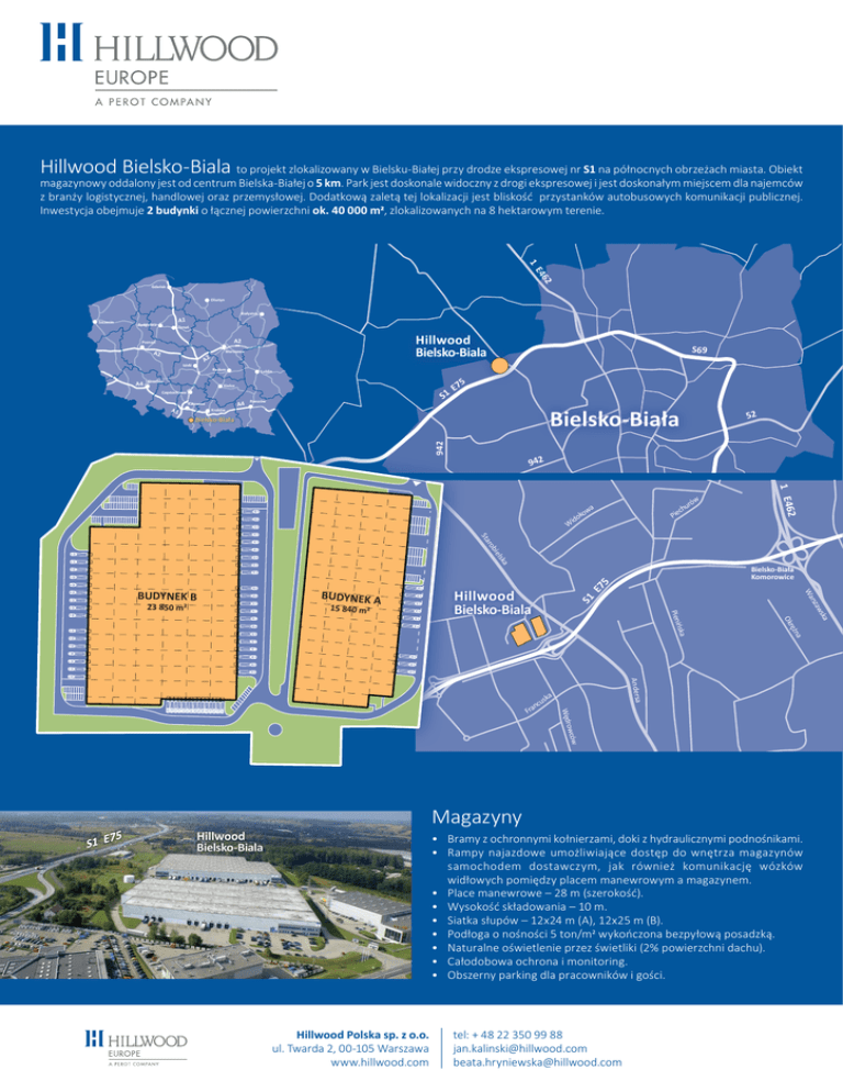 Hillwood Bielsko-Biala to projekt zlokalizowany w Bielsku-Białej przy drodze ekspresowej nr S1 na północnych obrzeżach miasta. Obiekt magazynowy oddalony jest od centrum Bielska-Białej o 5 km. Park jest doskonale widoczny z drogi ekspresowej i jest doskonałym miejscem dla najemców z branży logistycznej, handlowej oraz przemysłowej. Dodatkową zaletą tej lokalizacji jest bliskość przystanków autobusowych komunikacji publicznej. Inwestycja obejmuje 2 budynki o łącznej powierzchni ok. 40 000 mР, zlokalizowanych na 8 hektarowym terenie. 1 E4 62 'ĚĂŷƐƐŬ 'ĚĂŷƐŬ Ol t Olsztyn ŝĂųLJƐƚŽŬŬ A1 Bydgo Bydgos oszcz Bydgoszcz dŽƌƵŷ dŽƌ rsza a Warszawa A2 A2 BſĚǍ Raadom Radom A4 Hillwood Bielsko-Biala A2 Ăŷ WŽnjŶĂŷ LLub blin bli liiin n Lublin tƌŽĐų ǁ tƌŽĐųĂǁ Kielce S1 njħƐƚŽĐŚŽǁĂ njħƐƚŽĐŚŽǁ ĐŚŽ Katowice A1 <ƌĂŬſǁ S69 A4 Rzeszów E7 5 ŝĞůƐŬŽͲŝĂųĂ ŝĞůƐŬŽͲŝĂųĂ 52 942 942 62 1 E4 ǁ Ƶƌſ ĐŚ WŝĞ ǁĂ ŬŽ ŝĚŽ t ska iel rob Sta BUDYNEK A 15 840 m² Hi Hillwood Bielsko-Biala Bi ŶĂ ƌħǏ KŬ a Anders ǁĐſǁ tħĚƌŽ ka us nc Fra ŝŷƐŬĂ WŝĞŶ 23 850 m² ƐŬĂ Ăǁ ƌƐnj tĂ BUDYNEK B E7 5 ŝĞůƐŬŽͲŝĂųĂ Komorowice S1 Szczecin Szcczzecin Magazyny Hillwood Bielsko-Biala • Bramy z ochronnymi kołnierzami, doki z hydraulicznymi podnośnikami. • Rampy najazdowe umożliwiające dostęp do wnętrza magazynów samochodem dostawczym, jak również komunikację wózków widłowych pomiędzy placem manewrowym a magazynem. • Place manewrowe – 28 m (szerokość). • Wysokość składowania – 10 m. • Siatka słupów – 12x24 m (A), 12x25 m (B). • Podłoga o nośności 5 ton/m wykończona bezpyłową posadzką. • Naturalne oświetlenie przez świetliki (2% powierzchni dachu). • Całodobowa ochrona i monitoring. • Obszerny parking dla pracowników i gości. Hillwood Polska sp. z o.o. ul. Twarda 2, 00-105 Warszawa www.hillwood.com tel: + 48 22 350 99 88 [email protected] [email protected]