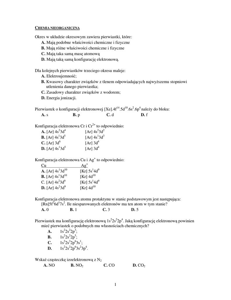 CHEMIA NIEORGANICZNA Okres w układzie okresowym zawiera pierwiastki, które: A. Mają podobne właściwości chemiczne i fizyczne B. Mają różne właściwości chemiczne i fizyczne C. Mają taka samą masę atomową D. Mają taką samą konfigurację elektronową. Dla kolejnych pierwiastków trzeciego okresu maleje: A. Elektroujemność; B. Kwasowy charakter związków z tlenem odpowiadających najwyższemu stopniowi utlenienia danego pierwiastka; C. Zasadowy charakter związków z wodorem; D. Energia jonizacji. Pierwiastek o konfiguracji elektronowej [Xe].4f14.5d10.6s2.6p4 należy do bloku: A. s B. p C. d D. f Konfiguracja elektronowa Cr i Cr2+ to odpowiednio: A. [Ar] 4s23d4 [Ar] 4s23d2 B. [Ar] 4s13d5 [Ar] 4s13d3 C. [Ar] 3d6 [Ar] 3d4 1 5 D. [Ar] 4s 3d [Ar] 3d4 Konfiguracja elektronowa Cu i Ag+ to odpowiednio: Cu Ag+ A. [Ar] 4s13d10 [Kr] 5s14d9 B. [Ar] 4s13d10 [Kr] 4d10 C. [Ar] 4s23d9 [Kr] 5s14d9 2 9 D. [Ar] 4s 3d [Kr] 4d10 Konfiguracja elektronowa atomu protaktynu w stanie podstawowym jest następująca: [Rn]5f26d17s2. Ile niesparowanych elektronów ma ten atom w tym stanie? A. 0 B. 1 C. 3 D. 5 Pierwiastek ma konfigurację elektronową 1s22s22p4. Jaką konfigurację elektronową powinien mieć pierwiastek o podobnych mu własnościach chemicznych? A. 1s22s22p3; B. 1s22s22p5; C. 1s22s22p63s1; D. 1s22s22p63s23p4. Wskaż cząsteczkę izoelektronową z N2 A. NO B. NO2 C. CO 1 D. CO2 Cząsteczka azotu N2 jest izoelektronowa z cząsteczkami (jonami cząsteczkowymi): A. O2 i Cl2 B. CO i CNC. O22- i CO D. CN- i F2 Promień jonowy danego pierwiastka w sieci krystalicznej A. zależy tylko od stopnia utlenienia B. zależy od stopnia utlenienia i promienia przeciwjonu C. zależy od stopnia utlenienia i liczby koordynacyjnej jonu D. zależy tylko od promienia przeciwjonu Zasadowe właściwości wodorotlenków X(OH)n rosną A. ze wzrostem promienia jonowego X i obniżeniem stopnia utlenienia X B. ze wzrostem promienia jonowego i stopnia utlenienia X C. z obniżeniem promienia jonowego i stopnia utlenienia X D. z obniżeniem promienia jonowego X i wzrostem stopnia utlenienia X Wodorotlenek ceru(IV), w porównaniu z wodorotlenkiem ceru(III) wykazuje właściwości: A. bardziej zasadowe z powodu wyższego stopnia utlenienia kationu B. bardziej kwasowe z powodu wyższego stopnia utlenienia kationu C. bardziej zasadowe z powodu mniejszego promienia kationu D. bardziej kwasowe z powodu większego promienia kationu Wskaż szereg pierwiastków uporządkowanych zgodnie ze wzrostem elektroujemności: A. K Na Mg Se Br Cl B. Cl Br Se Mg Na K C. Na K Mg Se Cl Br D. Br Cl Se Mg K Na Pierwiastek o najniższej i najwyższej elektroujemności to, odpowiednio: A. H, He B. Fr, F C. Cs, Cl D. Li, I Jedną z cech charakterystycznych pierwiastka jest jego elektroujemność. Jej wartość, w zależności od położenia pierwiastka w układzie okresowym, zmienia się w następujący sposób: (gdzie Z = liczba atomowa) A. B. C. D. GRUPA Maleje ze wzrostem Z Nie zmienia się ze wzrostem Z Rośnie ze wzrostem Z Rośnie, a następnie maleje ze wzrostem Z 2 OKRES Rośnie ze wzrostem Z Maleje ze wzrostem Z Rośnie ze wzrostem Z Nie zmienia się Wiązania między atomami tego samego pierwiastka mogą mieć charakter: A. wyłącznie kowalencyjny B. wyłącznie metaliczny C. wyłącznie jonowy D. kowalencyjny lub metaliczny Na podstawie podanych elektroujemności wskaż wiązanie o najbardziej polarnym charakterze. (Elektroujemności: H = 2,2; N = 3,0; O = 3,4; F = 4,0) A. O-H w H2O; B. N-F w NF2; C. N-O w NO2; D. N-H w NH3. Na podstawie załączonej tablicy elektroujemności wskaż wiązanie o najbardziej jonowym charakterze. Elektroujemność H 2,1 Al 1,5; Cl 3,0; Li 1,0; Na 0,9; F 4,0. A. Li-F; B. Al-Cl; C. H-Cl; D. Na-H. Która z wymienionych cząsteczek: H2O, SO2, czy SnCl2 ma kształt liniowy? A. H2O B. SO2 C. SnCl2 D. Żadna Wskaż najbardziej prawdopodobną geometrię molekuły PCl3: A. Piramida trygonala B. Płaski trójkąt C. Litera „T” D. Tetraedr Zgodnie z teorią VSEPR molekuła SO3 ma geometrię: A. płaskiego kwadratu B. płaskiego trójkąta C. litery „T” D. piramidy trygonalnej Cząsteczki XeF4 i CF4 mają struktury przestrzenne, odpowiednio: A. tetraedru i kwadratu B. kwadratu i tetraedru C. obie – tetraedru D. obie - kwadratu 3 Wskaż wzór cząsteczki, która nie wykazuje trwałego momentu dipolowego A. SO2 B. NO2 C. ClO2 D. CO2 Wybierz wzór związku, którego cząsteczki są płaskie: A. C2H4 B. N2H4 C. H2O2 D. CCl4 Wskaż szereg zawierający tylko liniowe cząsteczki (jony cząsteczkowe): A. C2H2, CO2, O3 , I3B. H2O, NH2-, CO2, N3C. ClO2-, C2H2, NO2, H2S D. XeF2, CO2, I3-, N3Wśród wymienionych cząsteczek wskaż tę, która nie ma budowy liniowej: A. I3B. CO2 C. SO2 D. BeF2 Rozpatrując struktury cząsteczek CO2, SO2 i CS2, można stwierdzić że: A. wszystkie są liniowe; B. wszystkie są nieliniowe; C. dwie są liniowe i jedna nieliniowa; D. dwie są nieliniowe i jedna liniowa. Które ze stwierdzeń, dotyczących wielkości kątów jakie tworzą wiązania między atomem centralnym a atomami wodoru w cząsteczkach siarkowodoru, amoniaku i metanu, jest prawdziwe? A. kąt wiązania w H2S jest mniejszy niż w NH3, który z kolei jest mniejszy niż w CH4; B. kąt wiązania w CH4 jest mniejszy niż w NH3, który z kolei jest mniejszy niż w H2S; C. kąt wiązania w NH3 jest mniejszy niż w CH4, który z kolei jest mniejszy niż w H2S; D. we wszystkich trzech cząsteczkach kąty wiązań są jednakowe. Z następujących indywiduów: NO3-, BF3. SO3, PH3 wszystkie mają kształt płaski-trygonalny za wyjątkiem: A. PH3, B. BF3, C. SO3, D. NO3-. Kąt między wiązaniami wodór – siarka – wodór w cząsteczce siarkowodoru wynosi: A. Dokładnie 180 stopni; B. Dokładnie 90 stopni; C. Więcej niż 60 i mniej niż 90 stopni; D. Więcej niż 90 i mniej niż 120. Wskaż zbiór pierwiastków, które mają odmiany alotropowe: A. magnez, tlen, siarka, beryl B. tlen, siarka, fosfor, wapń C. fosfor, tlen, si