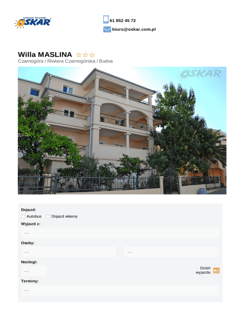 61 852 45 72 [email protected] Willa MASLINA Czarnogóra / Riwiera Czarnogórska / Budva Dojazd: Autobus Dojazd własny Wyjazd z: Osoby: Noclegi: Dzień wyjazdu Terminy: Pokój: Wyżywienie: Najtańsza oferta First Minute cena katalogowa do 7 marca 2017: 418,20 zł do 7 marca 2017: 418,20 zł do 22 sierpnia 2017: 975,80 zł do 22 sierpnia 2017: 975,80 zł Suma:1394,00 Suma: zł 1394,00 zł Opis oferty Miejscowość Atuty 10Opinie minut od plaży niedaleko główny deptak i centrum handlowe dostęp do Internetu Wi-Fi bezpłatna klimatyzacja ogród z palmami duży grill na ogródku oraz miejsce do wspólnego grillowania Położenie Willa położona 10 minut spacerem od plaży „Slovenska plaża” i Starego Miasta, gdzie w sezonie odbywają się liczne imprezy plenerowe. Blisko willi znajdują się centrum handlowe, lokalny bazar oraz główny deptak. Budva to najsłynniejszy letni kurort Czarnogóry. Tętniące życiem uliczki, bary, puby oraz plaże przyciągają tłumy zwłaszcza młodych wczasowiczów szukających dobrej zabawy i niezapomnianych wrażeń. Zakwaterowanie Każdy pokój i apartament wyposażony jest w klimatyzację, TV, lodówkę oraz elektryczny czajnik, łazienkę z suszarką do włosów. Niektóre obejmują wyposażoną kuchnię. Obiekt jest otoczony ogrodem z dużym, wspólnym tarasem oraz sprzętem do grillowania, z którego można korzystać nieodpłatnie. Idealny dla rodzin z dziećmi. Dostępne opcje zakwaterowania pokój 1 osobowy pokój 2 osobowy pokój 2 osobowy typu studio z aneksem kuchennym pokój 3 osobowy pokój 3 osobowy typu studio z aneksem kuchennym apartament 3 osobowy (sypialnia + pokój dzienny z łóżkiem pojedynczym oraz aneksem kuchennym) apartament 4 osobowy (sypialnia + sypialnia połączona z jadalnią z aneksem kuchennym oraz wyjściem na balkon) Dostępne opcje wyżywienia posiłki we własnym zakresie śniadania obiadokolacje śniadania i obiadokolacje Pakiet KOMFORT gwarancja wyboru miejsca w autokarze napoje w autokarze w cenie (6 x do wyboru: kawa, herbata, zimny napój 0,2l) cena: 50 zł/os Pakiet PRESTIGE gwarancja wyboru miejsca w autokarze napoje w autokarze w cenie (6 x do wyboru: kawa, herbata, zimny napój 0,2l) pierwszeństwo wejścia na pokład autokaru nadbagaż 5 kg w cenie suchy prowiant na drogę powrotną cena: 100 zł/os Karta Dużej Rodziny www.oskar.com.pl/zalaczniki/karta_duzej_rodziny Warunki promocji FIRST MINUTE www.oskar.com.pl/zalaczniki/warunki_promocji Ubezpieczenie Warunki ubezpieczenia Bezpieczne Podróże Signal Iduna dokument do pobrania www.oskar.com.pl/zalaczniki/owu Warunki ubezpieczenia Kosztów Imprezy Turystycznej Signal Iduna dokument do pobrania www.oskar.com.pl/zalaczniki/owurg Turystyczny Fundusz Gwarancyjny W związku z powołaniem do życia w dniu 26.11.2016 Turystycznego Funduszu Gwarancyjnego każdy klient Biura Podróży Oskar zobowiązany jest do zapłaty kwoty w wysokości 10zł/os. przy każdorazowej rezerwacji imprezy turystycznej (obowiązuje od dnia 26.11.2016). Kwota przeznaczona na Turystyczny Fundusz Gwarancyjny zostanie automatycznie doliczona do wartości rezerwacji (w momencie jej dokonania). Wyjątkiem są imprezy turystyczne odbywające się w krajach posiadających granicę z Rzeczpospolitą Polską. Składka nie jest przychodem biura. Udogodnienia Klimatyzacja Regulowane fotele Tacki Nowoczesna flota Zawodowy kierowca Pasy bezpieczeństwa Toaleta w autokarze Podnóżki Kominek Dla rodzin z dziećmi Wi-Fi Lodówka AGD RTV Blisko centrum Życie nocne Bez paszportu Blisko plaży Parking Spokojna okolica Region nadmorski Program ramowy Dzień 1 Wyjazd z Polski zgodnie z rozkładem jazdy autokarów. Przejazd przez Czechy, Słowację, Węgry, Serbię. Dzień 2 Przyjazd do poszczególnych miejscowości w godzinach przedpołudniowych. Zakwaterowanie od godz. 12:00 - 13:00. Dzień 3-7 Pobyt na miejscu. Możliwość korzystania z dodatkowych wycieczek fakultatywnych. Dzień 8 Wykwaterowanie do godz. 09:00. Czas wolny. Wyjazd do Polski w godzinach popołudniowych. Przejazd przez Chorwację, Węgry, Słowację, Czechy. Dzień 9 Przyjazd do Polski. Orientacyjne godziny powrotu do poszczególnych miast zgodnie z rozkładem jazdy autokarów Cena obejmuje przejazd autokarem klasy LUX (klimatyzacja, cafe - bar, DVD, WC) zakwaterowanie: 6 noclegów w Willi M ASLINA opiekę pilota w czasie podróży opieka rezydenta na miejscu wyżywienie wg wybranej opcji ubezpieczenie KL 10000 euro, NNW 10000 zł, bagaż (utrata 500 zł) Dopłaty wymagane na miejscu opłata klimatyczna 7 euro/os; dzieci do 12 lat płacą 50% - płatne u pilota w autokarze Dopłaty opcjonalne ubezpieczenie od chorób przewlekłych i nowotworowych KL 20000 euro, NNW 10000 zł, bagaż (utrata 500 zł): 120 zł/os ubezpieczenie od kosztów rezygnacji: 3,5% wartości rezerwacji Chcesz wiedzieć szybciej? Polub nas na facebooku OSKAR Sp. z o.o. pl.Wolności 2/4c, 61-738 Poznań Potrzebujesz pomocy? Zadzwoń lub napisz: 61 852 45 72 [email protected] Zadzwoń Projekt i wdrożenie: Simply User