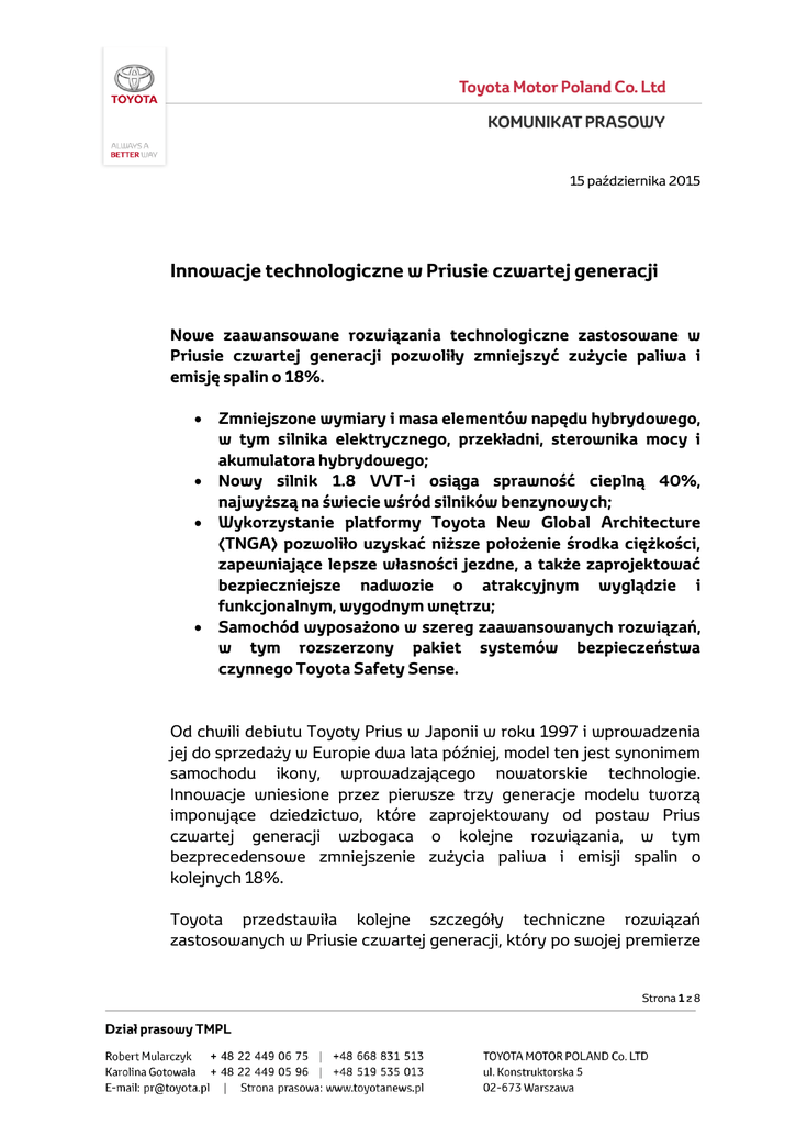15 października 2015 Innowacje technologiczne w Priusie czwartej generacji Nowe zaawansowane rozwiązania technologiczne zastosowane w Priusie czwartej generacji pozwoliły zmniejszyć zużycie paliwa i emisję spalin o 18%. Zmniejszone wymiary i masa elementów napędu hybrydowego, w tym silnika elektrycznego, przekładni, sterownika mocy i akumulatora hybrydowego; Nowy silnik 1.8 VVT-i osiąga sprawność cieplną 40%, najwyższą na świecie wśród silników benzynowych; Wykorzystanie platformy Toyota New Global Architecture (TNGA) pozwoliło uzyskać niższe położenie środka ciężkości, zapewniające lepsze własności jezdne, a także zaprojektować bezpieczniejsze nadwozie o atrakcyjnym wyglądzie i funkcjonalnym, wygodnym wnętrzu; Samochód wyposażono w szereg zaawansowanych rozwiązań, w tym rozszerzony pakiet systemów bezpieczeństwa czynnego Toyota Safety Sense. Od chwili debiutu Toyoty Prius w Japonii w roku 1997 i wprowadzenia jej do sprzedaży w Europie dwa lata później, model ten jest synonimem samochodu ikony, wprowadzającego nowatorskie technologie. Innowacje wniesione przez pierwsze trzy generacje modelu tworzą imponujące dziedzictwo, które zaprojektowany od postaw Prius czwartej generacji wzbogaca o kolejne rozwiązania, w tym bezprecedensowe zmniejszenie zużycia paliwa i emisji spalin o kolejnych 18%. Toyota przedstawiła kolejne szczegóły techniczne rozwiązań zastosowanych w Priusie czwartej generacji, który po swojej premierze Strona 1 z 8 we Frankfurcie, zostanie zaprezentowany podczas 44. edycji Tokio Motor Show, rozpoczynającej się 28 października. Nowy Prius został stworzony z myślą o harmonii między samochodem a człowiekiem, zarówno pod względem projektu nadwozia i wnętrza, jak i rozwiązań technicznych. Niższa emisja spalin i mniejsze zużycie paliwa to nie wszystko – Prius zachwyca emocjonującą stylistyką, wygodnym i funkcjonalnym wnętrzem oraz przyjemnością prowadzenia. Zastosowanie szerokiej gamy nowych technologii podnosi bezpieczeństwo jazdy na wyższy poziom, zwiększa komfort podróżowania i poprawia przejrzystość przekazywanych kierowcy informacji. Nowego Priusa zbudowano na nowej platformie Toyota New Global Architecture. Wykorzystanie jej pozwoliło uzyskać niższe położenie środka ciężkości pojazdu, większą stabilność i precyzję prowadzenia, komfort jazdy i niższy poziom hałasu. Pozwoliło także zaprojektować bardziej atrakcyjne nadwozie o dynamicznym wyglądzie. Gruntownie usprawniona, w pełni hybrydowa jednostka napędowa Nowa generacja w pełni hybrydowej jednostki napędowej Toyoty zawiera szereg istotnych modyfikacji, obejmujących zmniejszenie strat energii, przeprojektowanie i optymalizację rozmieszczenia głównych podzespołów oraz obniżenie masy. Efektem jest znaczne zwiększenie sprawności, uzyskane m.in. dzięki modyfikacjom przekładni hybrydowej, silników spalinowego oraz elektrycznego. Nowy Prius wyróżnia się aż o 18% niższymi zużyciem paliwa i emisją spalin. Jest to największy skok jakościowy ze wszystkich notowanych dotychczas podczas debiutów kolejnych generacji Priusa. Dane homologacyjne dotyczące emisji i zużycia paliwa według norm europejskich zostaną przedstawione w późniejszym terminie. Strona 2 z 8 Silnik benzynowy o najwyższej w świecie sprawności cieplnej Podobnie jak poprzednik, Prius czwartej generacji wykorzystuje benzynowy silnik VVT-i o pojemności skokowej 1.8 litra, jednak dzięki wprowadzonym w nim modyfikacjom, wysoką już wcześniej sprawność cieplną udało się podnieść do rekordowego poziomu 40%. Główne zmiany obejmują zastosowanie oleju o mniejszej lepkości, niższe zużycie elementów ruchomych, a także wprowadzenie przez Toyotę po raz pierwszy podwójnego układu chłodzenia. Specjalny zawór przy niskich temperaturach powietrza automatycznie zmienia obieg cieczy chłodzącej, umożliwiając szybsze rozgrzewanie silnika bez zmniejszenia efektywności wentylacji kabiny, ograniczając zużycie paliwa w chłodne dni. Zaprojektowane na nowo tłoki i kanały dolotowe zapewniają lepsze zawirowanie mieszanki w cylindrach. Zwiększono również ilość recyrkulowanych spalin, dodatkowo poprawiając proces spalania. Przekładnia i silniki elektryczne Przeprojektowano przekładnię i silniki elektryczne, obniżając ich masę. Zmniejszenie wymiarów silnika elektrycznego pozwoliło uzyskać większą gęstość mocy. Udało się również zredukować o 20% straty energii powodowane przez tarcie. Dzięki umieszczeniu na oddzielnych osiach dwóch silników-generatorów uzyskano mniejszą długość przekładni napędowej. Planetarną przekładnię redukcyjną zastąpiono przekładniami równoległymi, przyczyniając się do obniżenia strat. Sterownik mocy Sterownik mocy o nowej konstrukcji odznacza się zmniejszonymi o około 20% stratami energii. Jest przy tym znacznie mniejszy, co pozwoliło umieścić go bezpośrednio nad przekładnią napędową. Akumulator pomocniczy przeniesiono z bagażnika do komory silnika, a dzięki przeniesieniu akumulatora jednostki hybrydowej pod tylną Strona 3 z 8 kanapę uzyskano więcej przestrzeni bagażowej – pojemność bagażnika w nowej generacji Priusa wzrosła do 502 litrów. Akumulatory jednostki hybrydowej Prius czwartej generacji wyposażony jest w nowy akumulator niklowowodorkowy (NiMH), uważany przez Toyotę za rozwiązanie najlepiej spełniające wymagania rynku. Akumulator umieszczono pod tylną kanapą, powiększając w ten sposób pojemność bagażnika. Dane techniczne WYMIARY Długość 4540 mm Szerokość 1760 mm Wysokość 1470 mm Rozstaw osi 2700 mm Długość kabiny 2110 mm Szerokość kabiny 1490 mm Wysokość kabiny 1195 mm SILNIK Rodzaj Rzędowy, czterocylindrowy, z dwoma wałkami rozrządu Pojemność skokowa 1797 cm³ Moc maksymalna 98 KM wg DIN / 72 kW przy 5200 obr./min Maksymalny moment obrotowy 142 Nm przy 3600 obr./min SILNIK ELEKTRYCZNY Moc maksymalna 