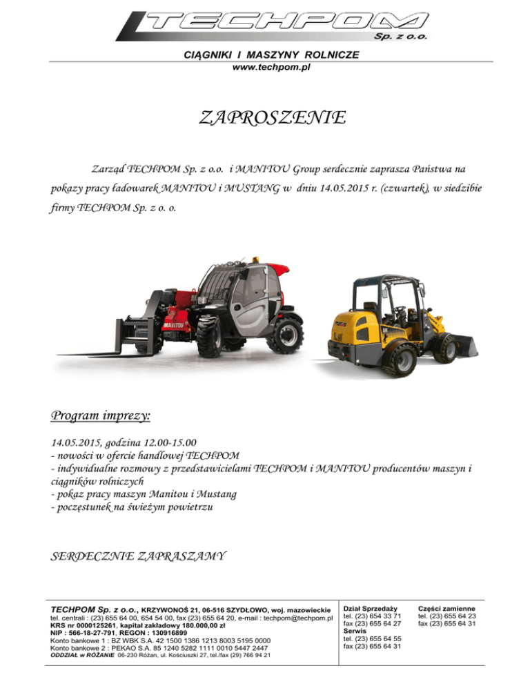 CIĄGNIKI I MASZYNY ROLNICZE www.techpom.pl ZAPROSZENIE Zarząd TECHPOM Sp. z o.o. i MANITOU Group serdecznie zaprasza Państwa na pokazy pracy ładowarek MANITOU i MUSTANG w dniu 14.05.2015 r. (czwartek), w siedzibie firmy TECHPOM Sp. z o. o. Program imprezy: 14.05.2015, godzina 12.00-15.00 - nowości w ofercie handlowej TECHPOM - indywidualne rozmowy z przedstawicielami TECHPOM i MANITOU producentów maszyn i ciągników rolniczych - pokaz pracy maszyn Manitou i Mustang - poczęstunek na świeżym powietrzu SERDECZNIE ZAPRASZAMY TECHPOM Sp. z o.o., KRZYWONOŚ 21, 06-516 SZYDŁOWO, woj. mazowieckie tel. centrali : (23) 655 64 00, 654 54 00, fax (23) 655 64 20, e-mail : [email protected] KRS nr 0000125261, kapitał zakładowy 180.000,00 zł NIP : 566-18-27-791, REGON : 130916899 Konto bankowe 1 : BZ WBK S.A. 42 1500 1386 1213 8003 5195 0000 Konto bankowe 2 : PEKAO S.A. 85 1240 5282 1111 0010 5447 2447 ODDZIAŁ w RÓŻANIE 06-230 Różan, ul. Kościuszki 27, tel./fax (29) 766 94 21 Dział Sprzedaży tel. (23) 654 33 71 fax (23) 655 64 27 Serwis tel. (23) 655 64 55 fax (23) 655 64 31 Części zamienne tel. (23) 655 64 23 fax (23) 655 64 31
