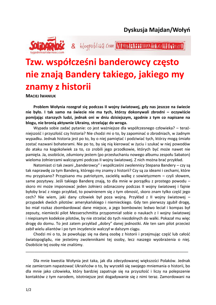 Dyskusja Majdan/Wołyń Tzw. współcześni banderowcy często nie znają Bandery takiego, jakiego my znamy z historii MACIEJ IWANIUK Problem Wołynia rozegrał się podczas II wojny światowej, gdy nas jeszcze na świecie nie było. I tak samo na świecie nie ma tych, którzy dokonywali zbrodni – oczywiście pomijając starszych ludzi, jednak oni w dniu dzisiejszym, zgodnie z tym co napisane na blogu, nie bronią aktywnie Ukrainy, strzelając do wroga. Wypada sobie zadać pytanie: co jest ważniejsze dla współczesnego człowieka? – teraźniejszość i przyszłość czy historia? Nie chodzi mi o to, by zapominać o zbrodniach, w żadnym wypadku. Jednak historia jest po to, by o niej pamiętać i podziwiać tych, którzy mogą śmiało zostać nazwani bohaterami. Nie po to, by się nią kierować w życiu i szukać w niej powodów do ataku na kogokolwiek za to, co zrobili jego przodkowie, których być może nawet nie pamięta. Ja, osobiście, zdumiony jestem (po przesłuchaniu nowego albumu zespołu Sabaton) wieloma żołnierzami walczącymi podczas II wojny światowej. Z nich można brać przykład. Natomiast ci tak zwani „banderowcy” i współcześni zwolennicy Stepana Bandery – czy są tak naprawdę za tym Banderą, którego my znamy z historii? Czy są za ideami i cechami, które mu przypisano? Przypisano mu patriotyzm, zaciekłą walkę z sowietyzmem – czyli słowem, same pozytywy. Jeśli takiego Banderę znają, to dla mnie w porządku z prostego powodu – skoro mi może imponować jeden żołnierz odznaczony podczas II wojny światowej i fajnie byłoby brać z niego przykład, to powinienem się z tym obnosić, skoro znam tylko część jego cech? Nie wiem, jaki dany człowiek był poza wojną. Przykład z II wojny światowej – przypadek dwóch pilotów: amerykańskiego i niemieckiego. Gdy ten pierwszy zgubił drogę, bo miał rozkaz zbombardować dane miejsce, a jego bombowiec ledwo leciał i kompas był zepsuty, niemiecki pilot Messerschmitta przypomniał sobie o naukach z I wojny światowej i niepisanym kodeksie pilotów, by nie strzelać do tych niezdolnych do walki. Pokazał mu więc drogę do domu. To jest zatem przykład „dobry” danej jednostki. Ale ten sam pilot przecież zabił wielu aliantów i po tym incydencie walczył w dalszym ciągu. Chodzi mi o to, że powołując się na daną osobę z historii i przejmując część lub całość światopoglądu, nie jesteśmy zwolennikami tej osoby, lecz naszego wyobrażenia o niej. Osobiście tej osoby nie znaliśmy. ___________________________________________________________________________ Dla mnie kwestia Wołynia jest taka, jak dla zdecydowanej większości Polaków. Jednak nie zamierzam napastować Ukraińców o to, by wyrzekli się swojego mniemania o historii, bo dla mnie jako człowieka, który bardziej zapatruje się na przyszłość i liczy na polepszenie kontaktów z tym narodem, istotniejsze jest dogadywanie się z nimi teraz. Zamordowani na 1/2 Wołyniu Polacy będą w naszej pamięci, choć nie znamy imion ich wszystkich. Tak samo jak wszystkie ofiary tej wojny. O wydarzeniach historycznych należy pamiętać, a nie się nimi kierować i dyktować komuś swoją wizję. Poglądy są poglądami, każdy może mieć inne – liczy się to, co z tymi poglądami robi. Blogpublika.com 2/2